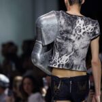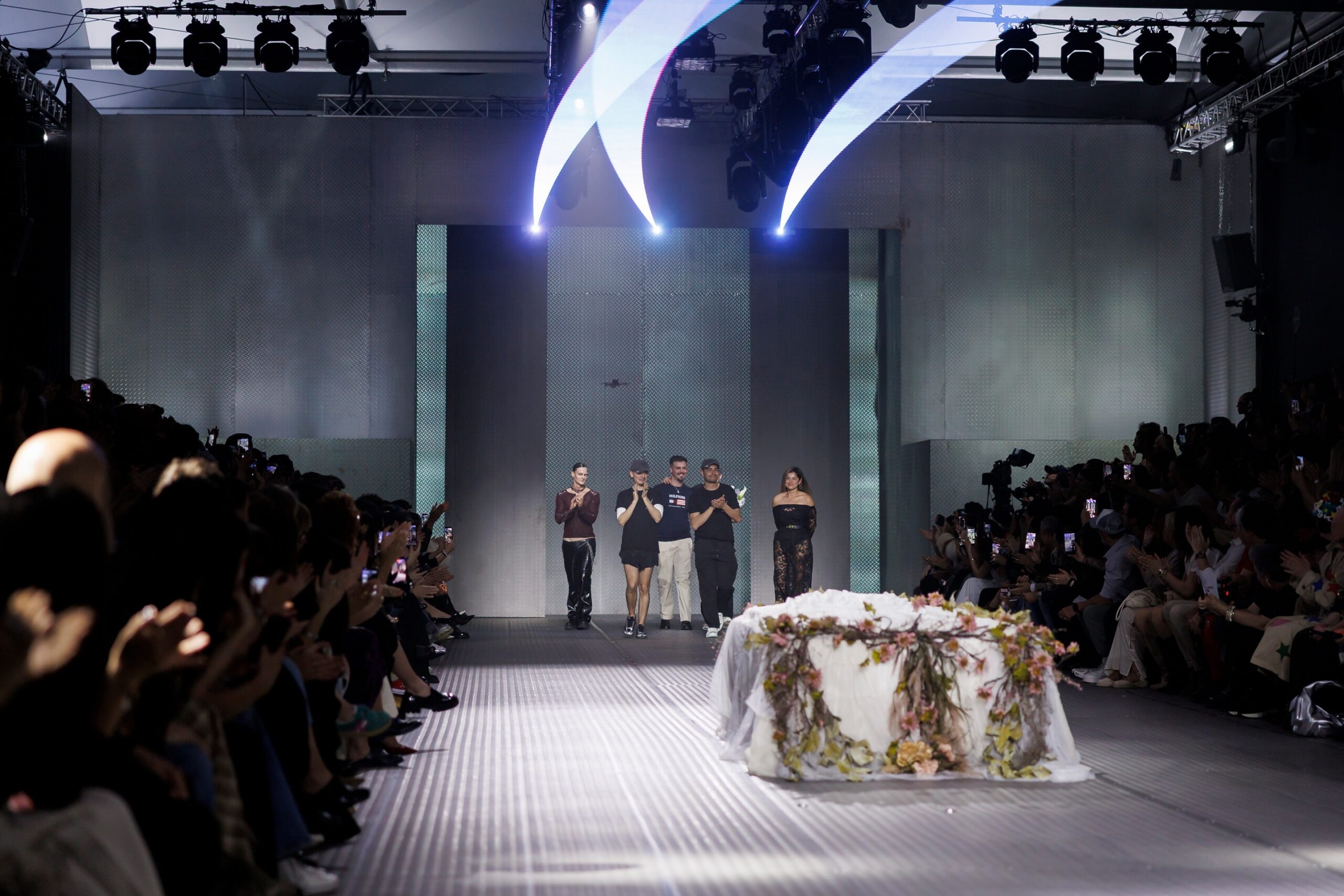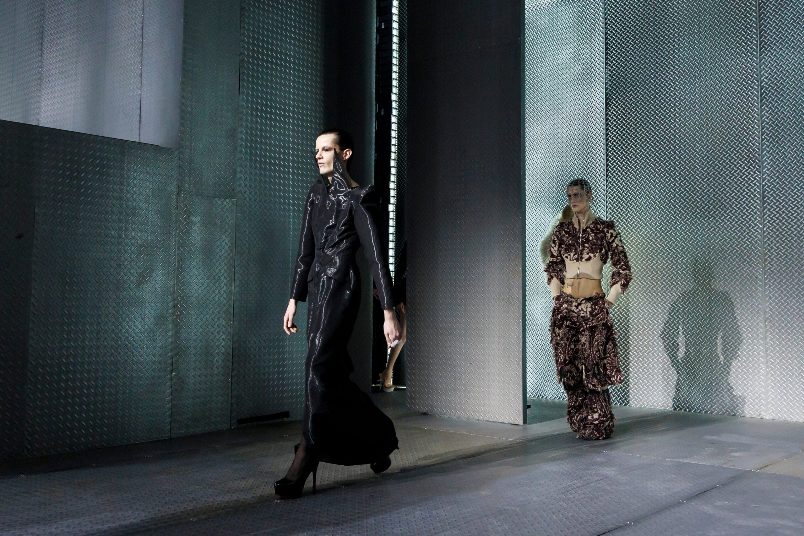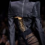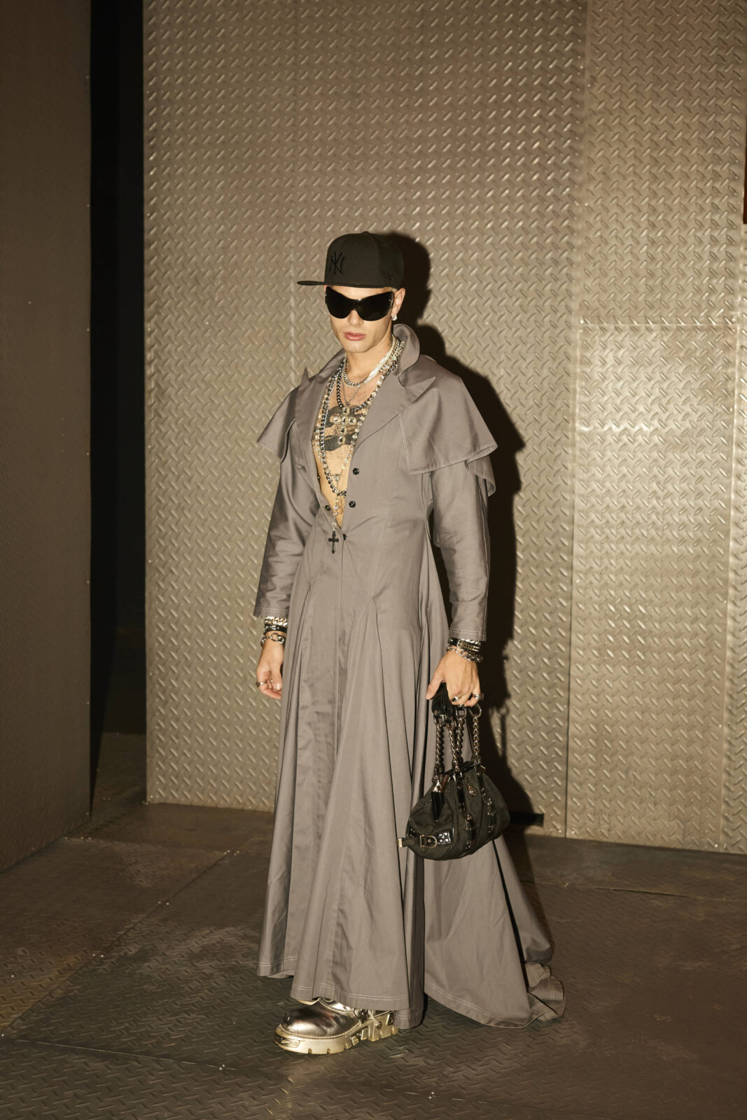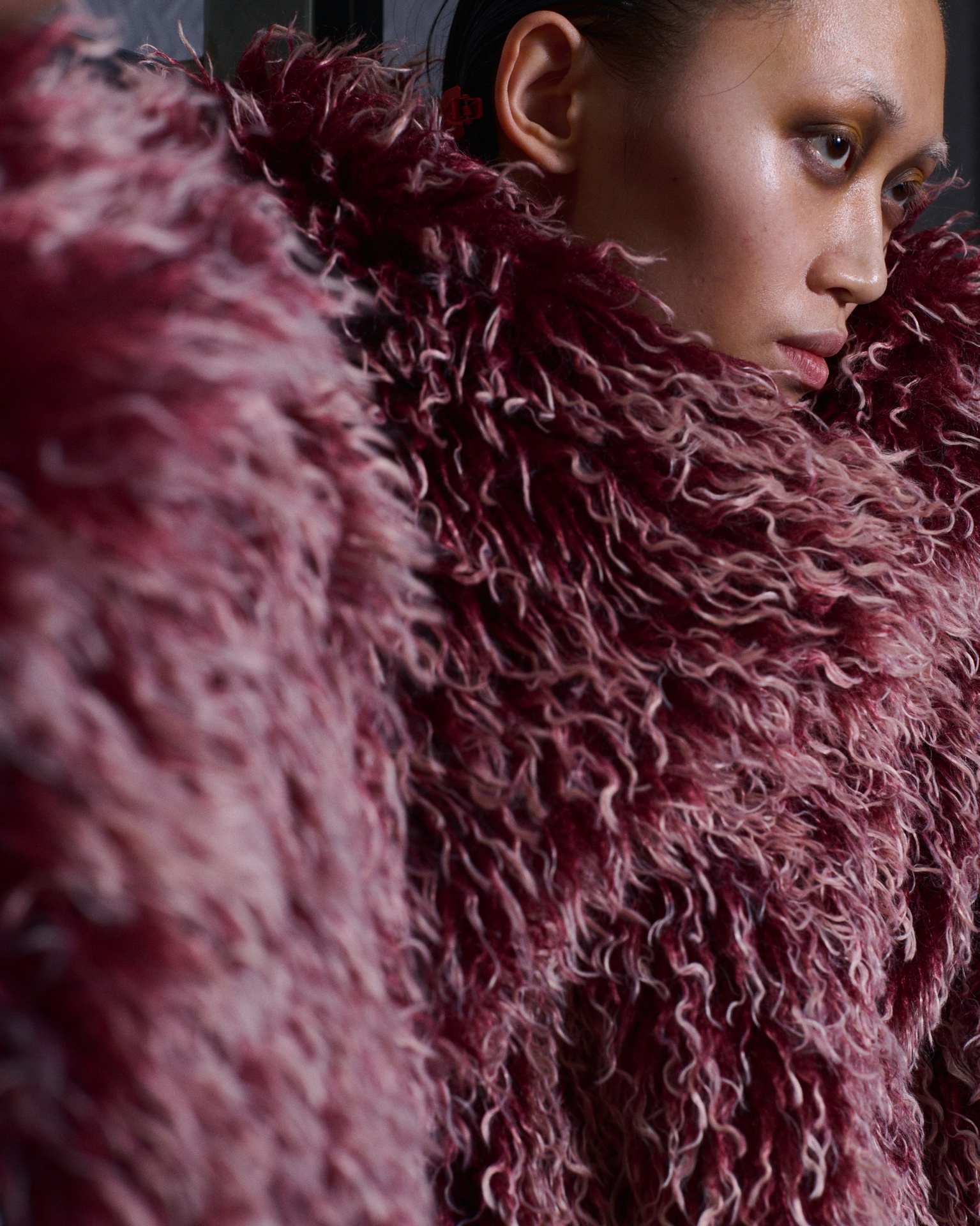 La propuesta habita un territorio entre lo espiritual y lo estructural, entre la luz metálica y la sombra del fuego. A través de materiales como organza, cuero sintético, pelo y encaje quemado, la colección aborda la idea de regeneración: el cuerpo que se quema, muta y renace. Cada textura cumple una función narrativa —estructura, ligereza, memoria abrasada, protección— construyendo un lenguaje visual de resistencia y transformación. La paleta cromática, del gris perla al negro carbón con reflejos plateados y pulsos de rojo, refuerza la tensión entre vulnerabilidad, poder y fortaleza interior.