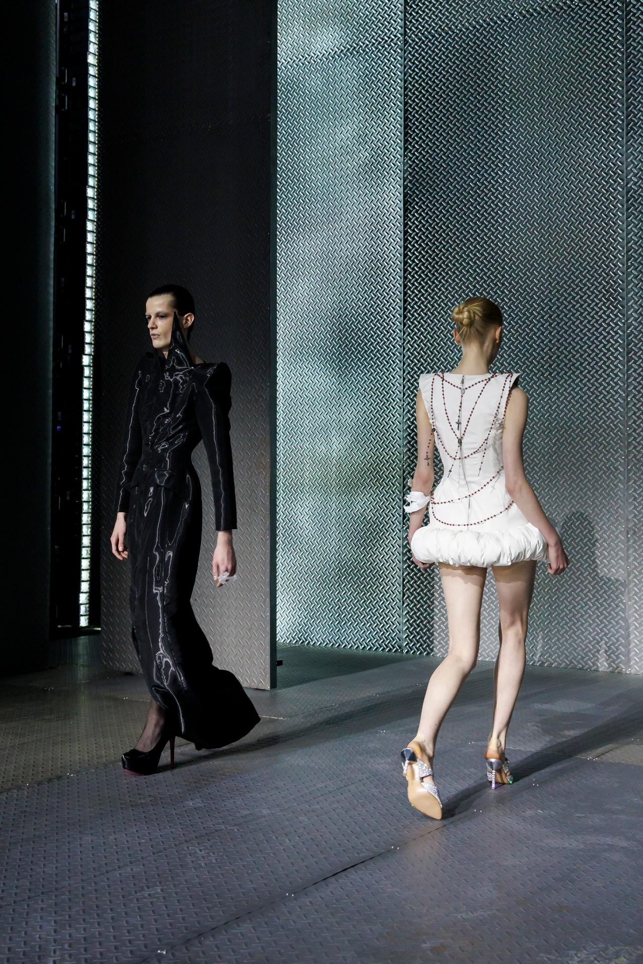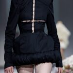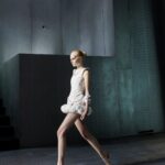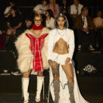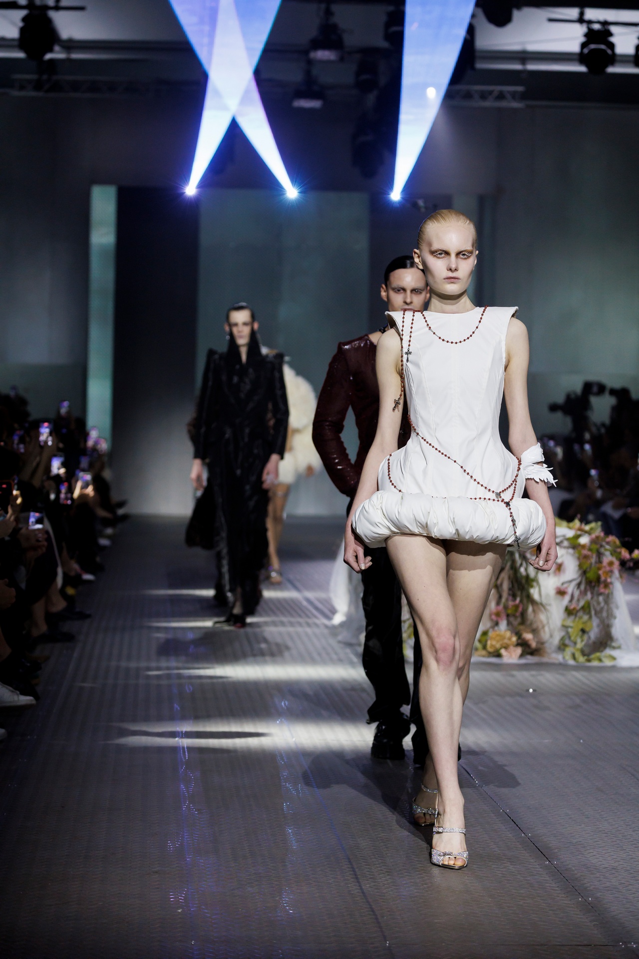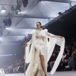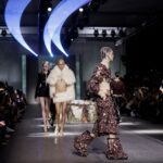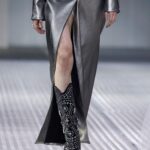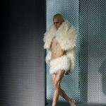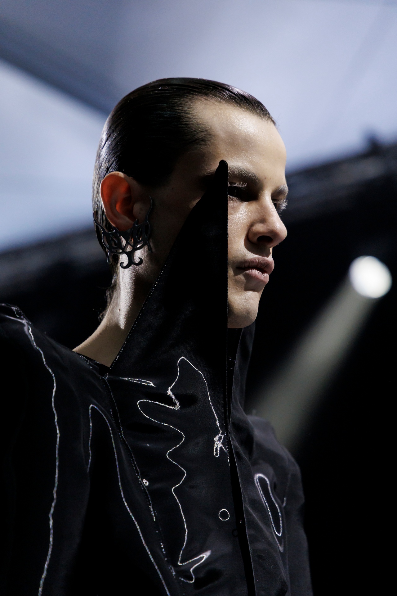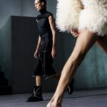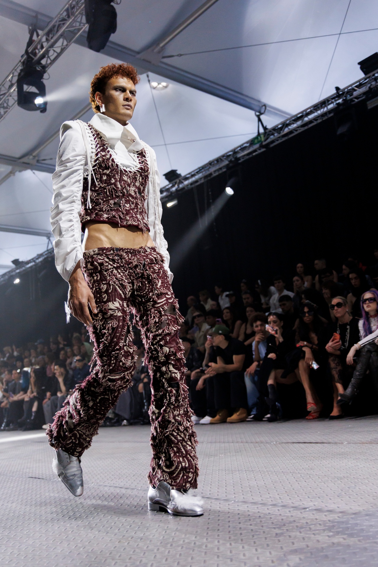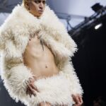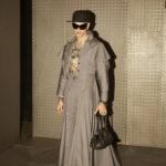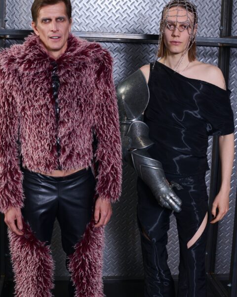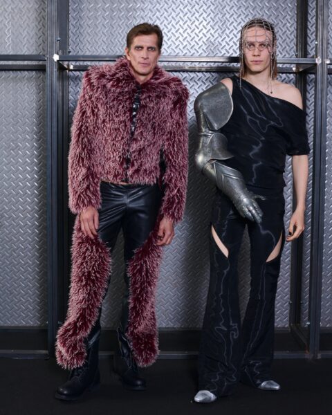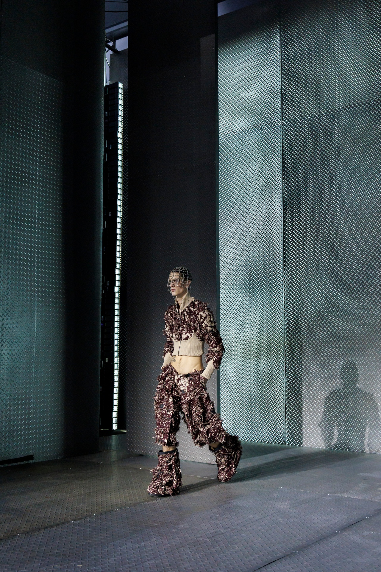 La propuesta habita un territorio entre lo espiritual y lo estructural, entre la luz metálica y la sombra del fuego. A través de materiales como organza, cuero sintético, pelo y encaje quemado, la colección aborda la idea de regeneración: el cuerpo que se quema, muta y renace. Cada textura cumple una función narrativa —estructura, ligereza, memoria abrasada, protección— construyendo un lenguaje visual de resistencia y transformación. La paleta cromática, del gris perla al negro carbón con reflejos plateados y pulsos de rojo, refuerza la tensión entre vulnerabilidad, poder y fortaleza interior.