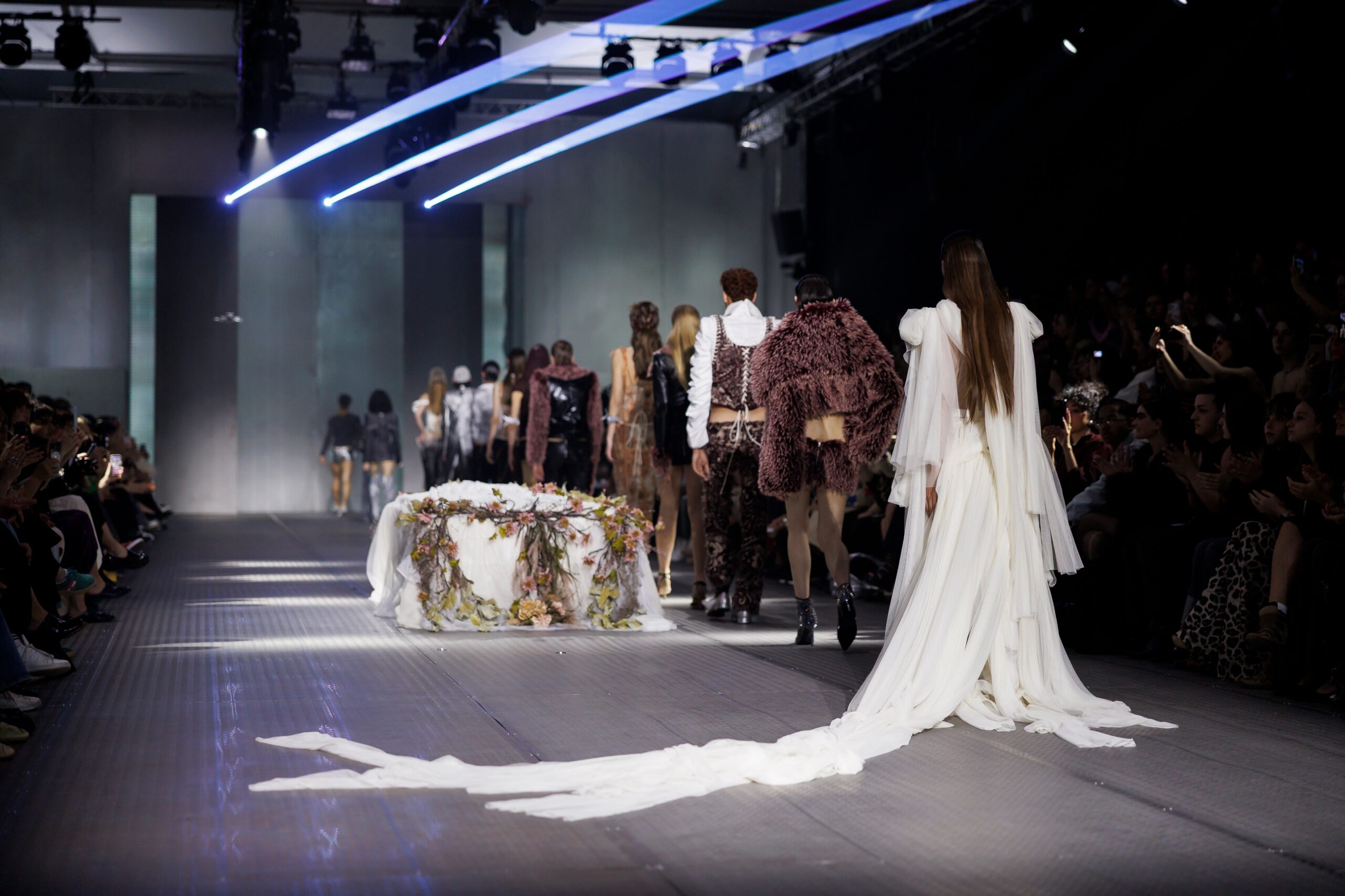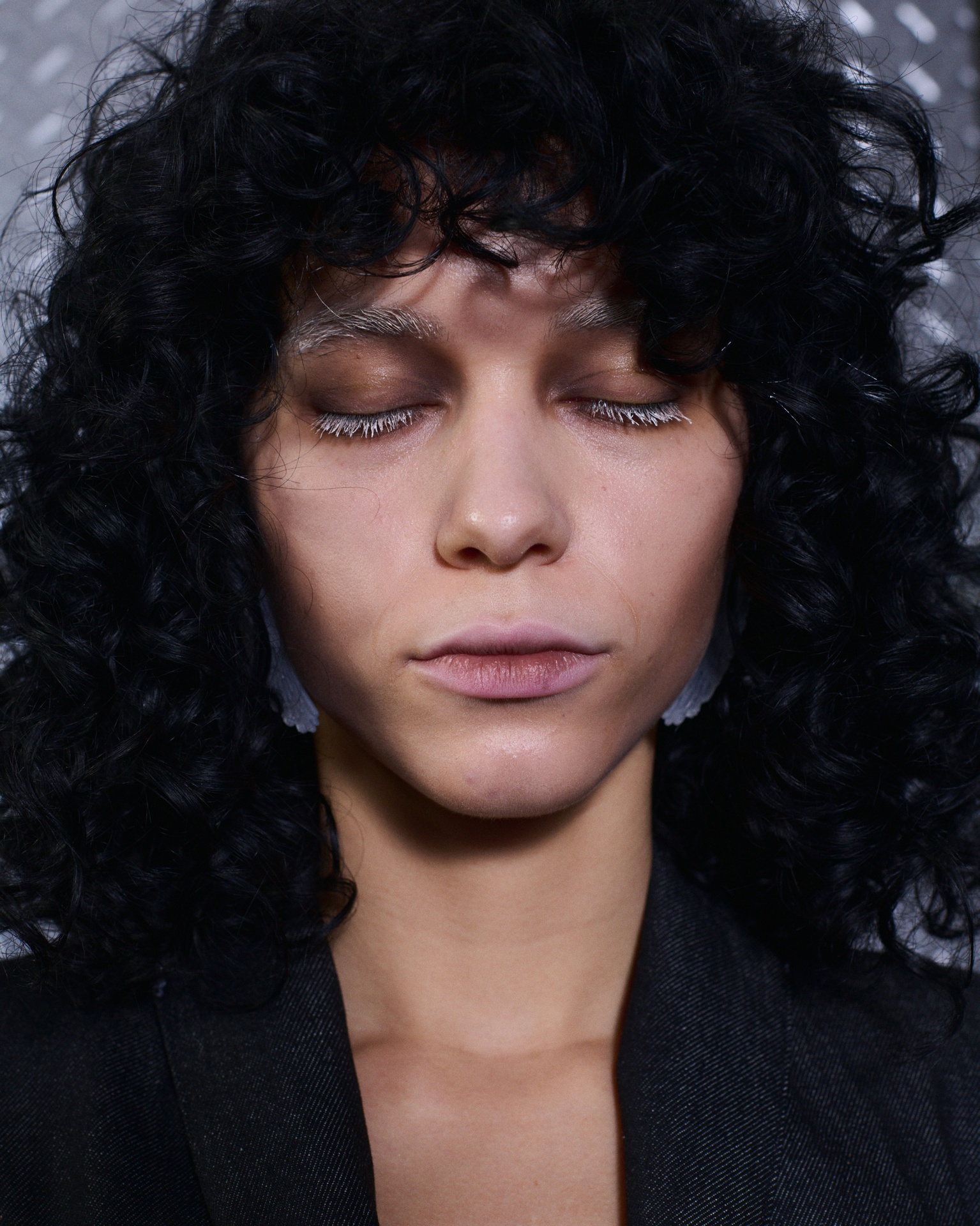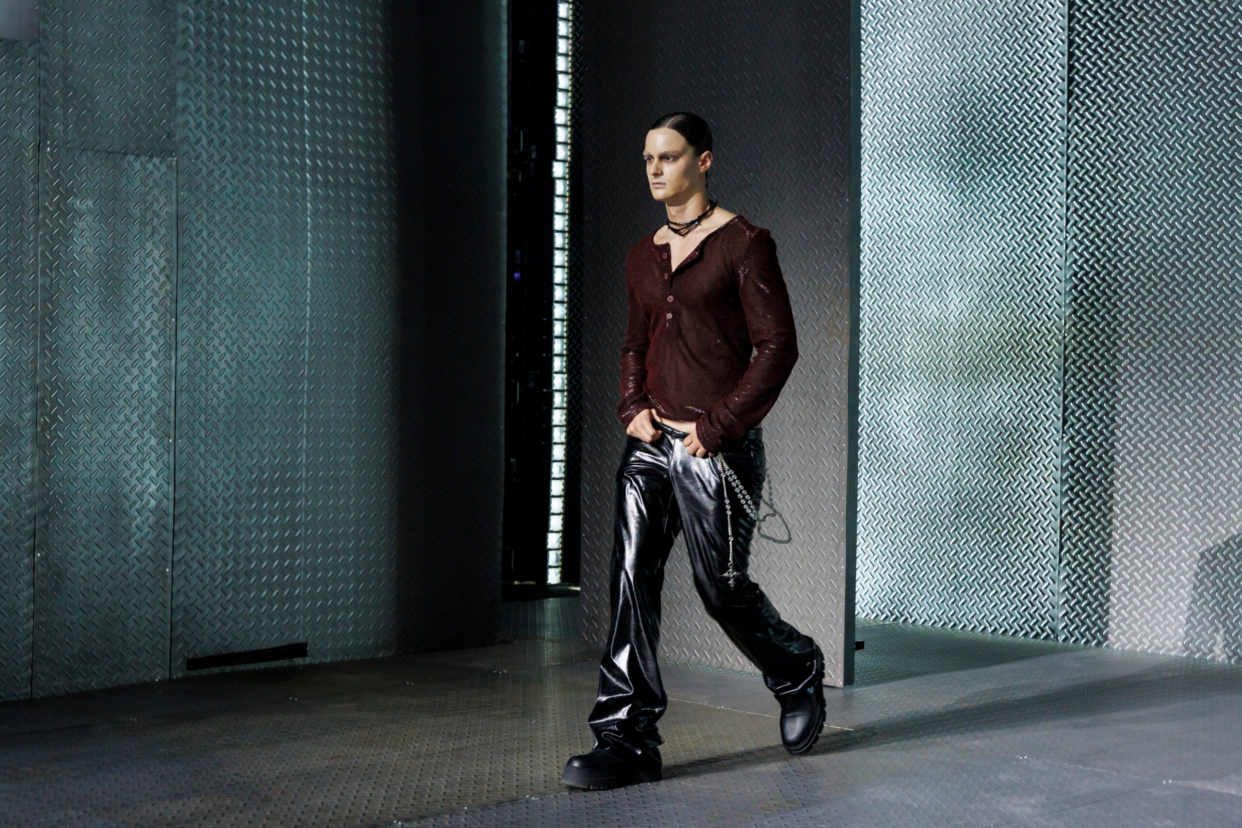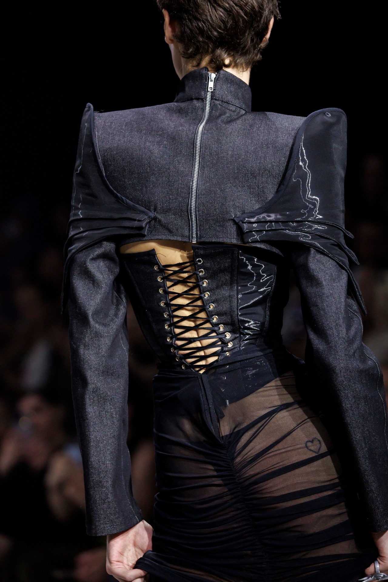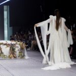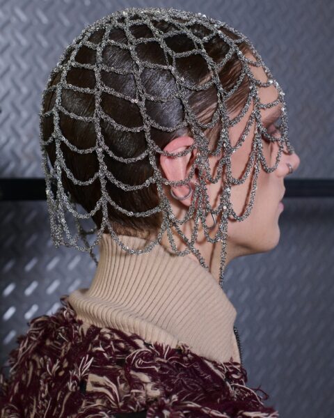 La propuesta habita un territorio entre lo espiritual y lo estructural, entre la luz metálica y la sombra del fuego. A través de materiales como organza, cuero sintético, pelo y encaje quemado, la colección aborda la idea de regeneración: el cuerpo que se quema, muta y renace. Cada textura cumple una función narrativa —estructura, ligereza, memoria abrasada, protección— construyendo un lenguaje visual de resistencia y transformación. La paleta cromática, del gris perla al negro carbón con reflejos plateados y pulsos de rojo, refuerza la tensión entre vulnerabilidad, poder y fortaleza interior.