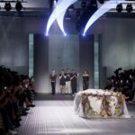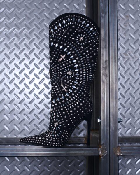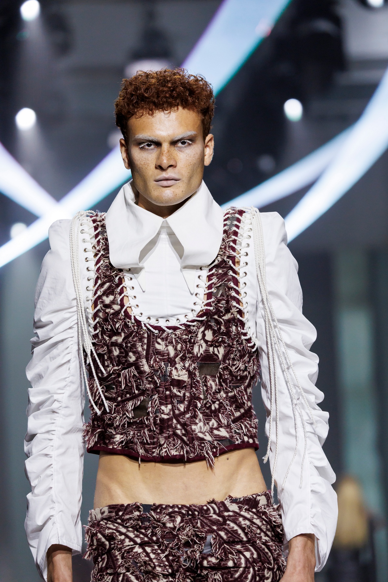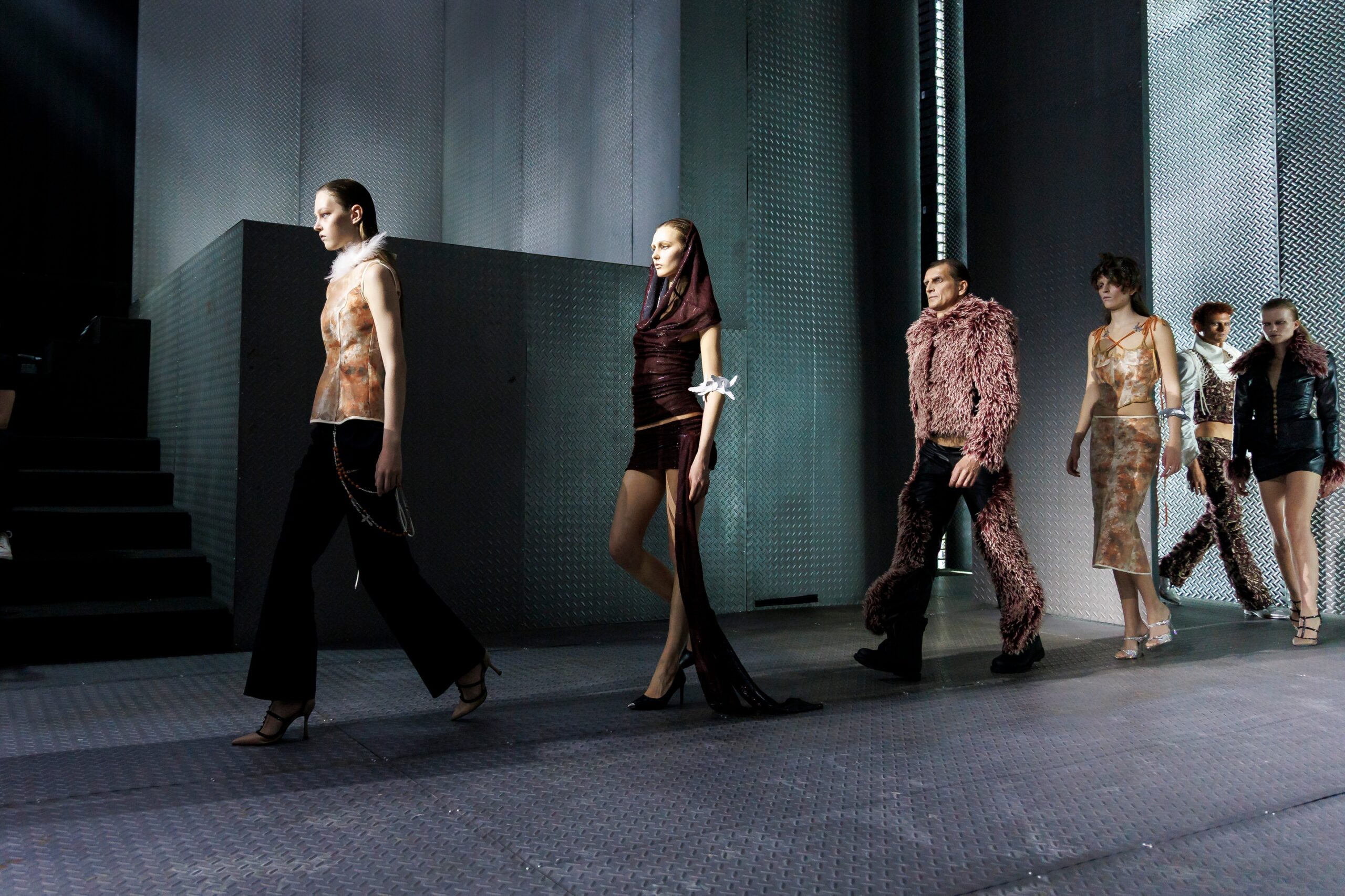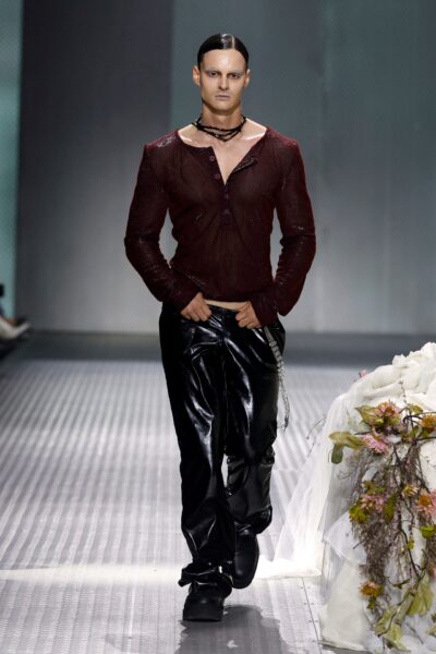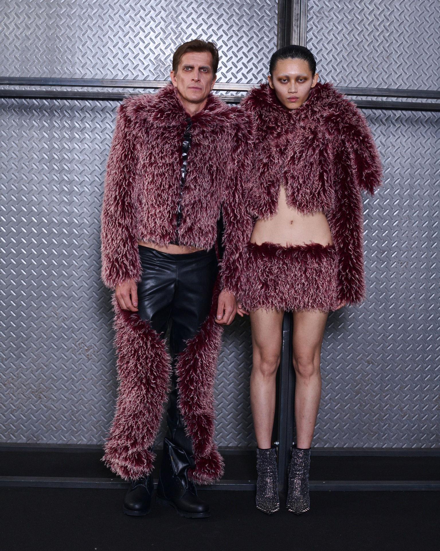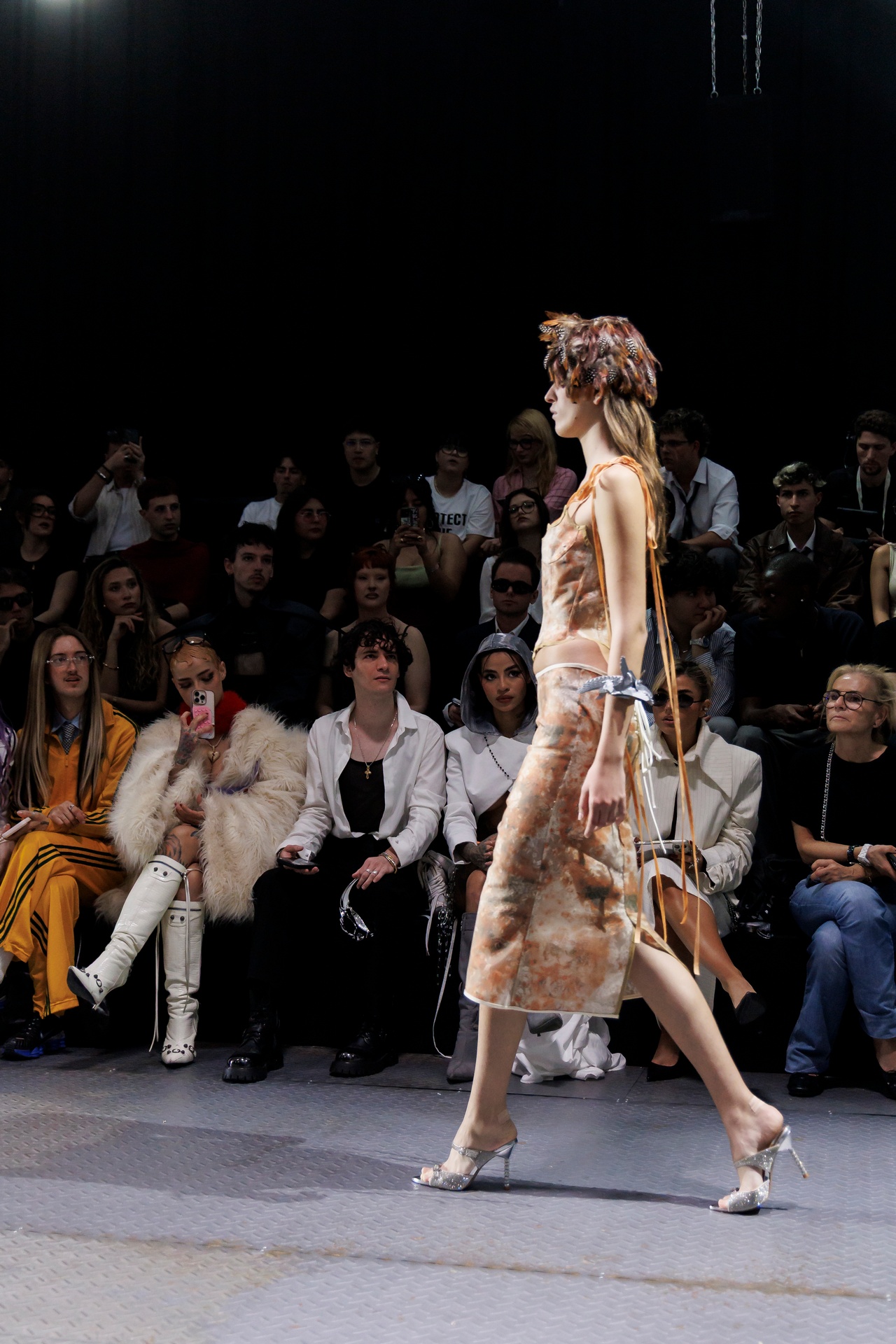 La propuesta habita un territorio entre lo espiritual y lo estructural, entre la luz metálica y la sombra del fuego. A través de materiales como organza, cuero sintético, pelo y encaje quemado, la colección aborda la idea de regeneración: el cuerpo que se quema, muta y renace. Cada textura cumple una función narrativa —estructura, ligereza, memoria abrasada, protección— construyendo un lenguaje visual de resistencia y transformación. La paleta cromática, del gris perla al negro carbón con reflejos plateados y pulsos de rojo, refuerza la tensión entre vulnerabilidad, poder y fortaleza interior.