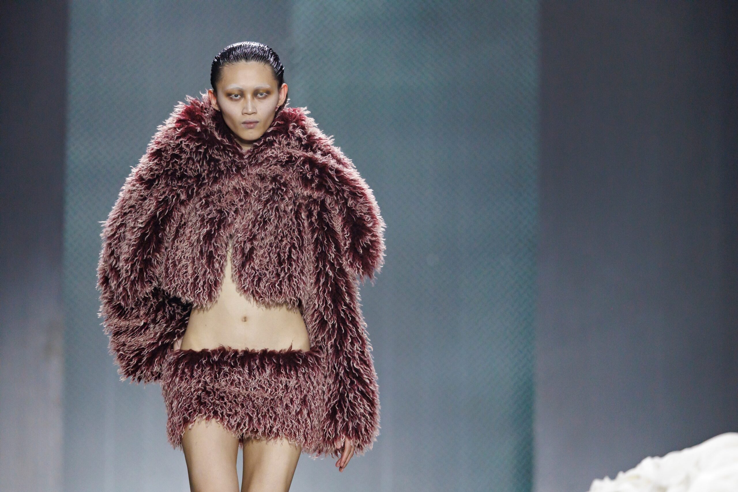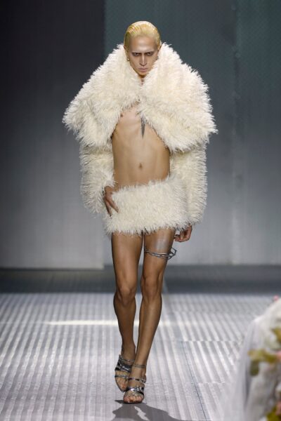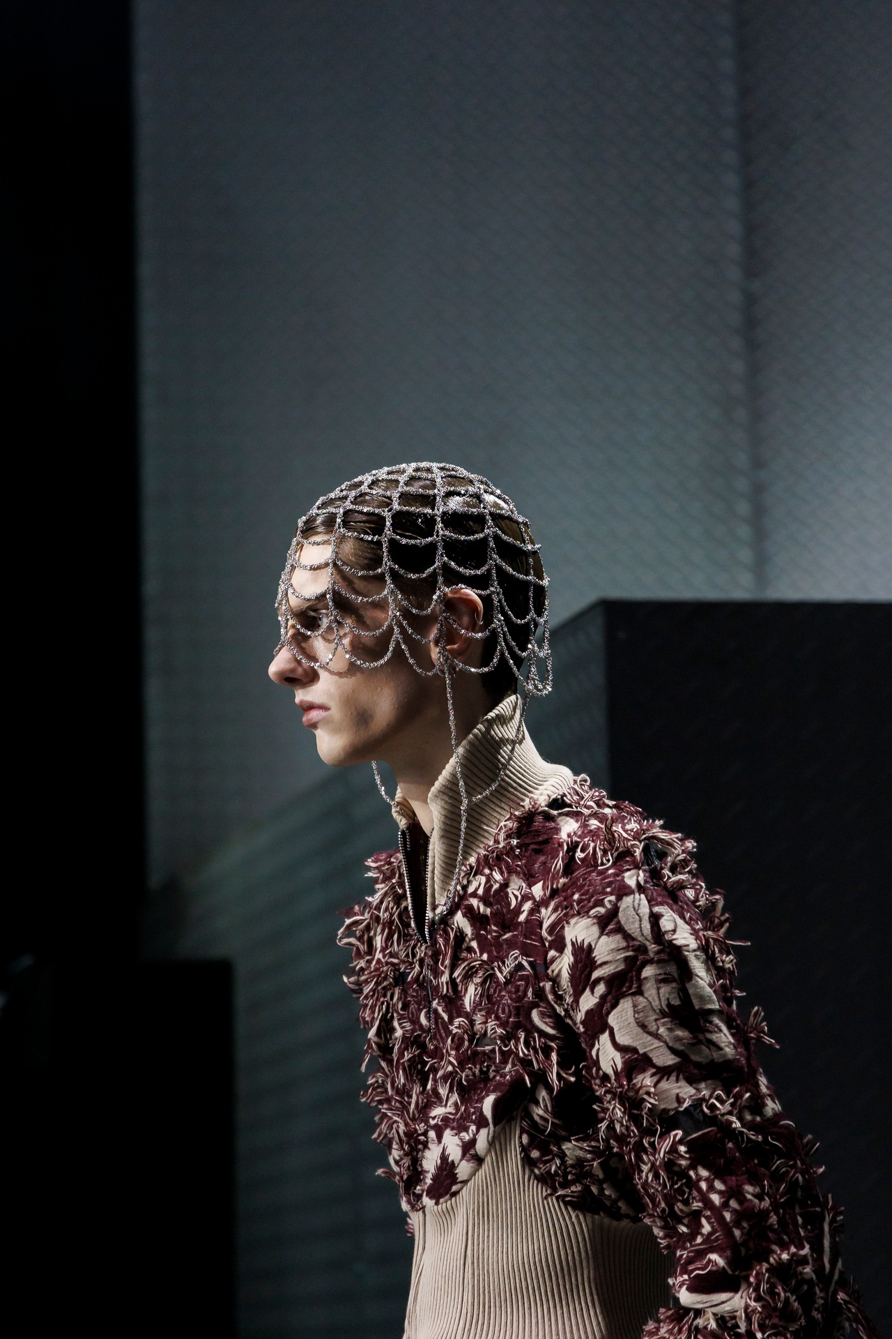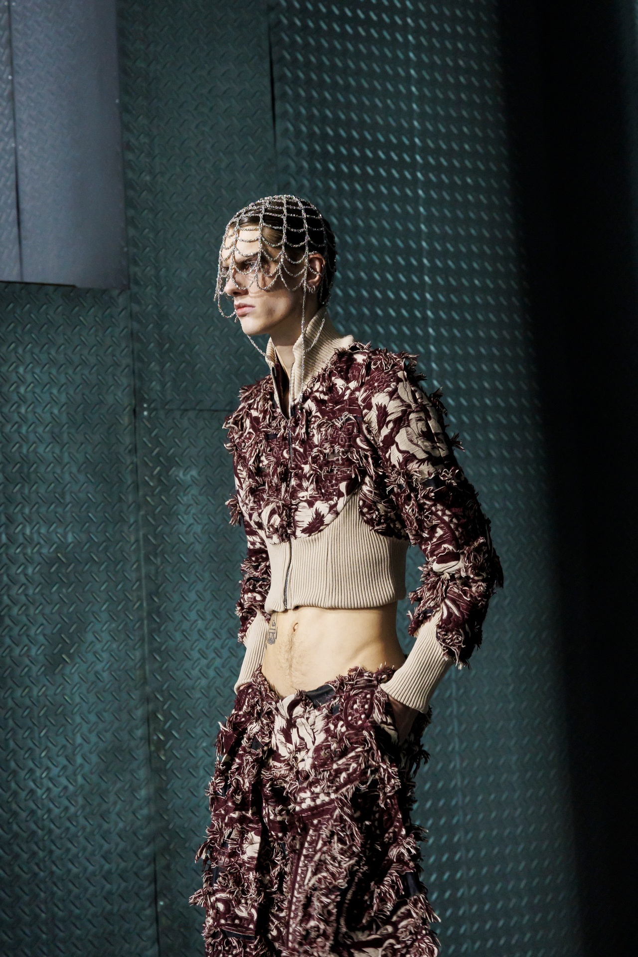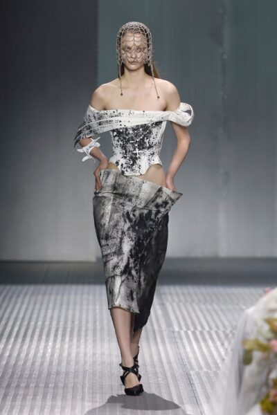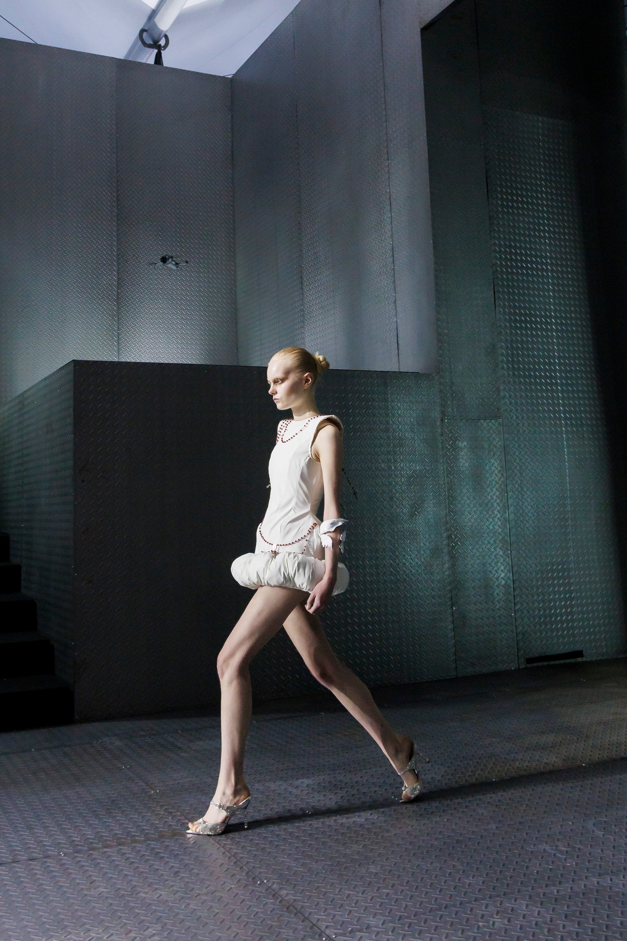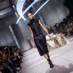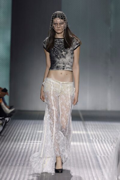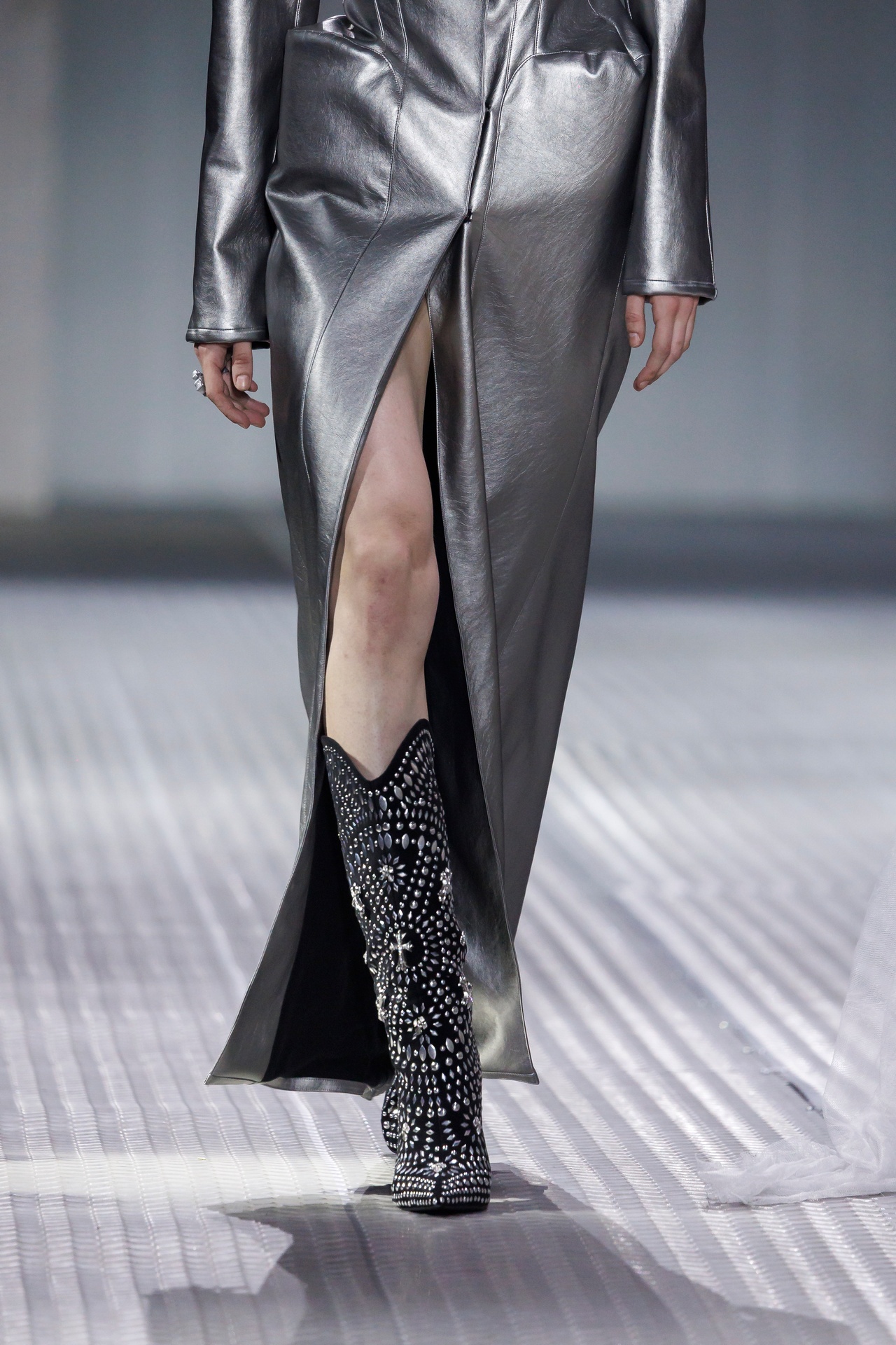 La propuesta habita un territorio entre lo espiritual y lo estructural, entre la luz metálica y la sombra del fuego. A través de materiales como organza, cuero sintético, pelo y encaje quemado, la colección aborda la idea de regeneración: el cuerpo que se quema, muta y renace. Cada textura cumple una función narrativa —estructura, ligereza, memoria abrasada, protección— construyendo un lenguaje visual de resistencia y transformación. La paleta cromática, del gris perla al negro carbón con reflejos plateados y pulsos de rojo, refuerza la tensión entre vulnerabilidad, poder y fortaleza interior.