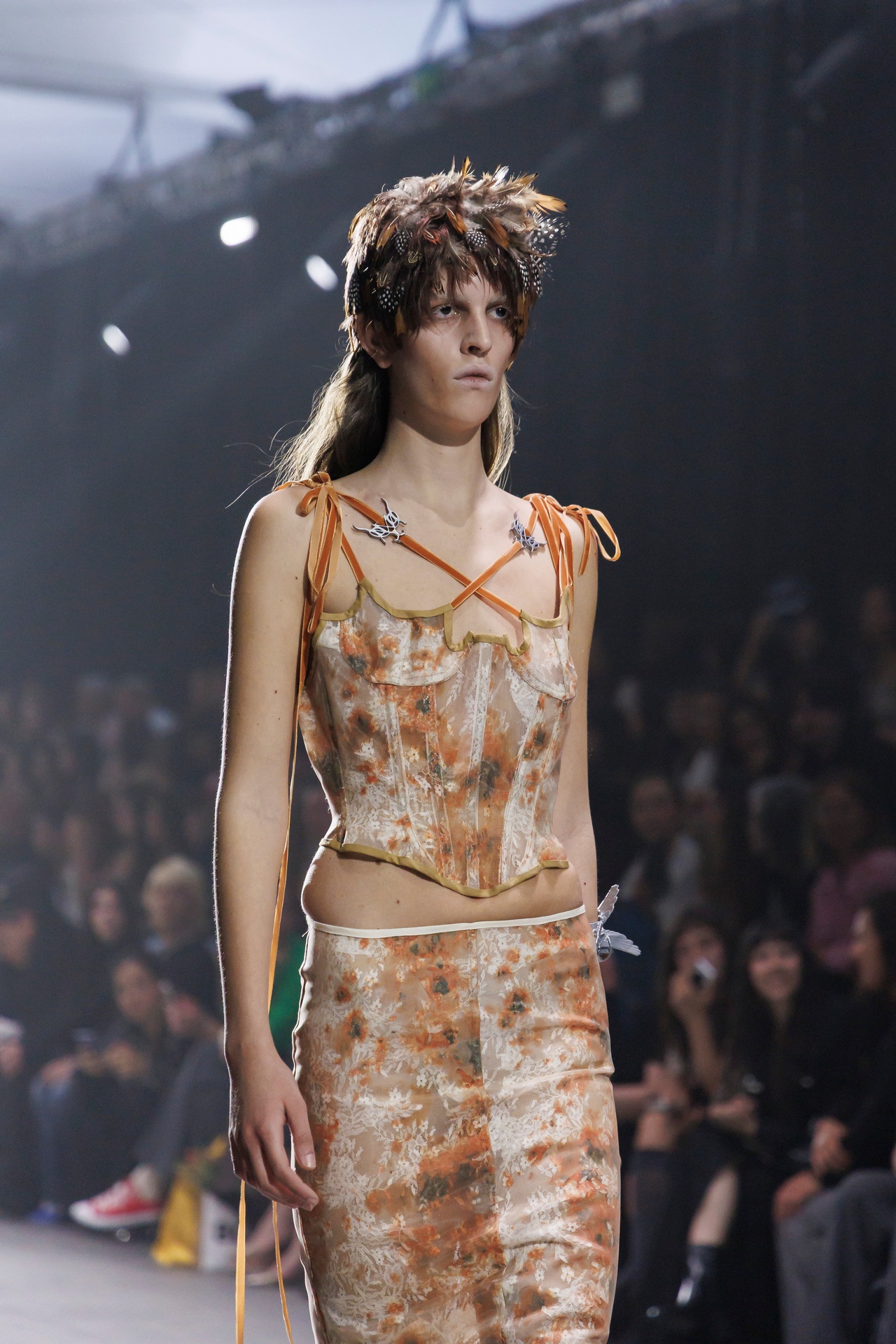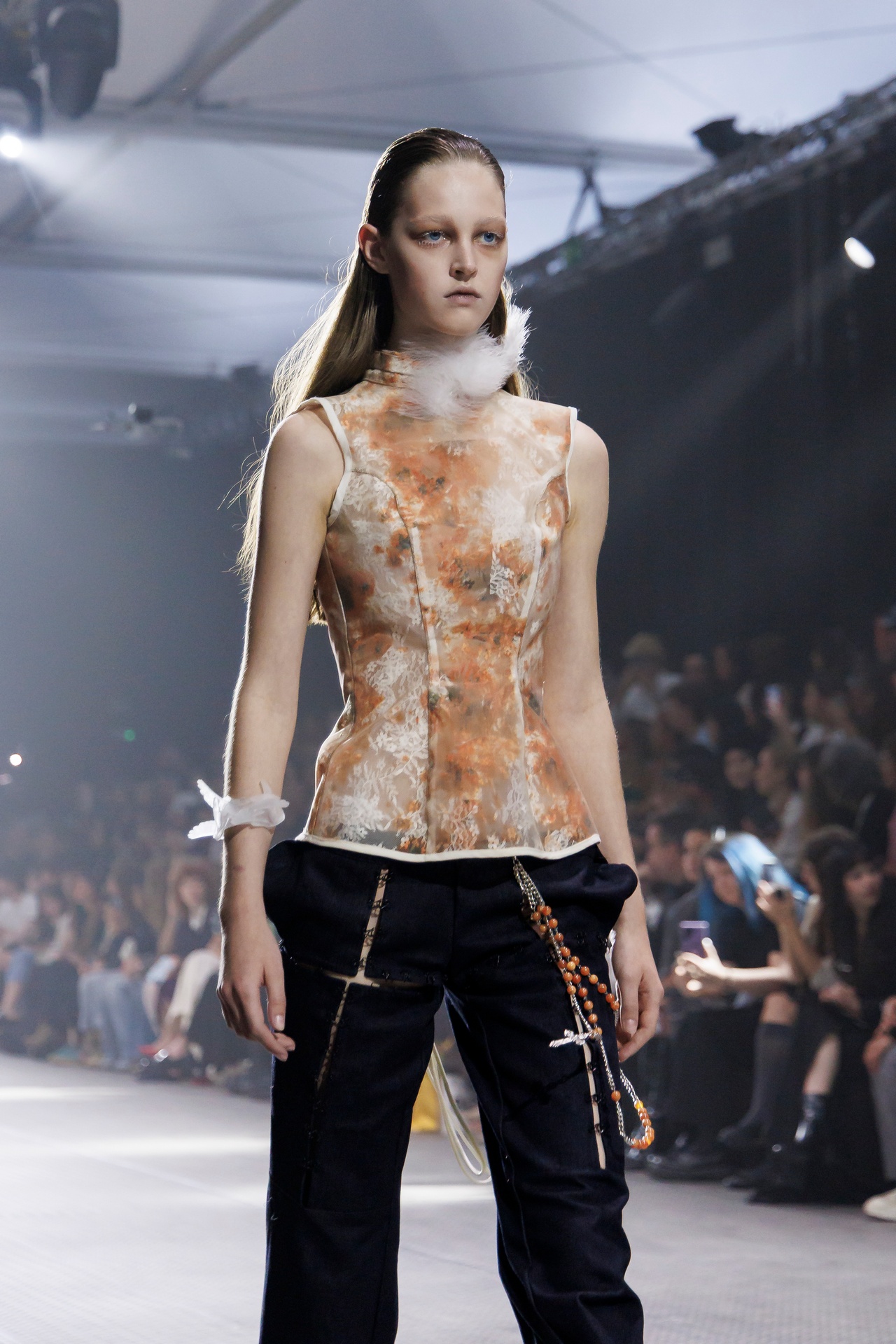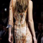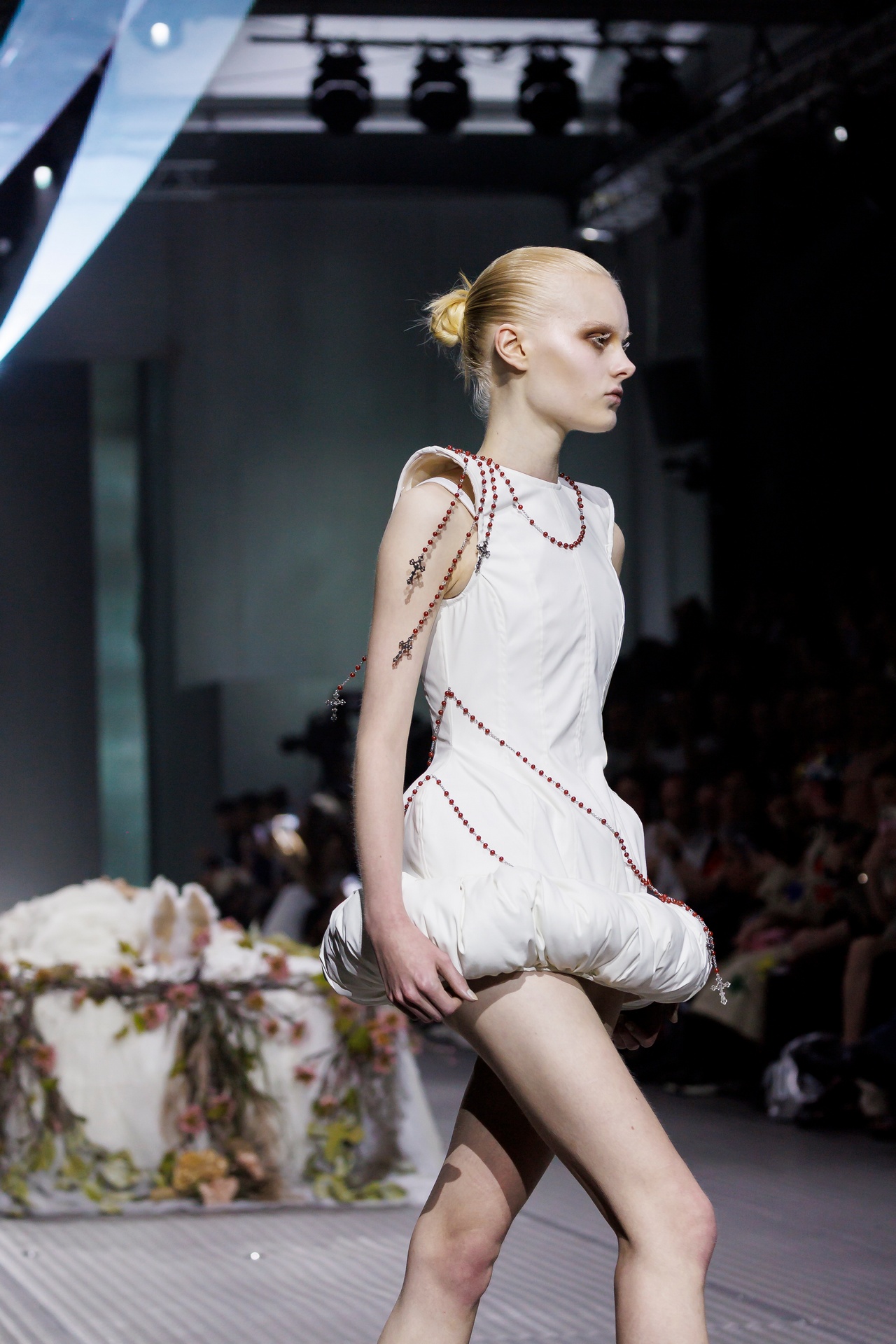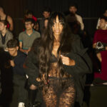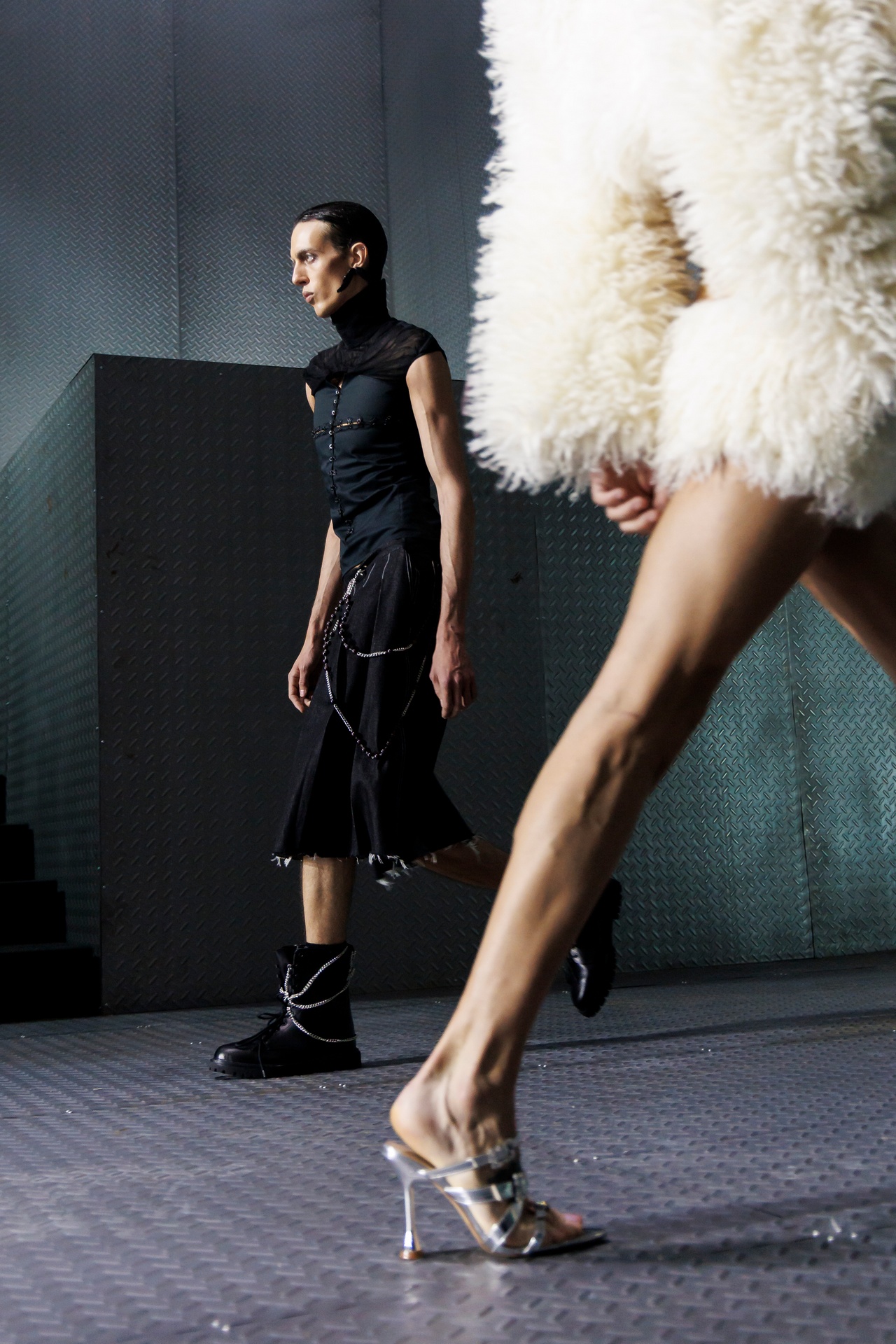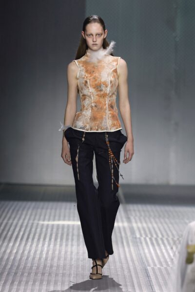 La propuesta habita un territorio entre lo espiritual y lo estructural, entre la luz metálica y la sombra del fuego. A través de materiales como organza, cuero sintético, pelo y encaje quemado, la colección aborda la idea de regeneración: el cuerpo que se quema, muta y renace. Cada textura cumple una función narrativa —estructura, ligereza, memoria abrasada, protección— construyendo un lenguaje visual de resistencia y transformación. La paleta cromática, del gris perla al negro carbón con reflejos plateados y pulsos de rojo, refuerza la tensión entre vulnerabilidad, poder y fortaleza interior.