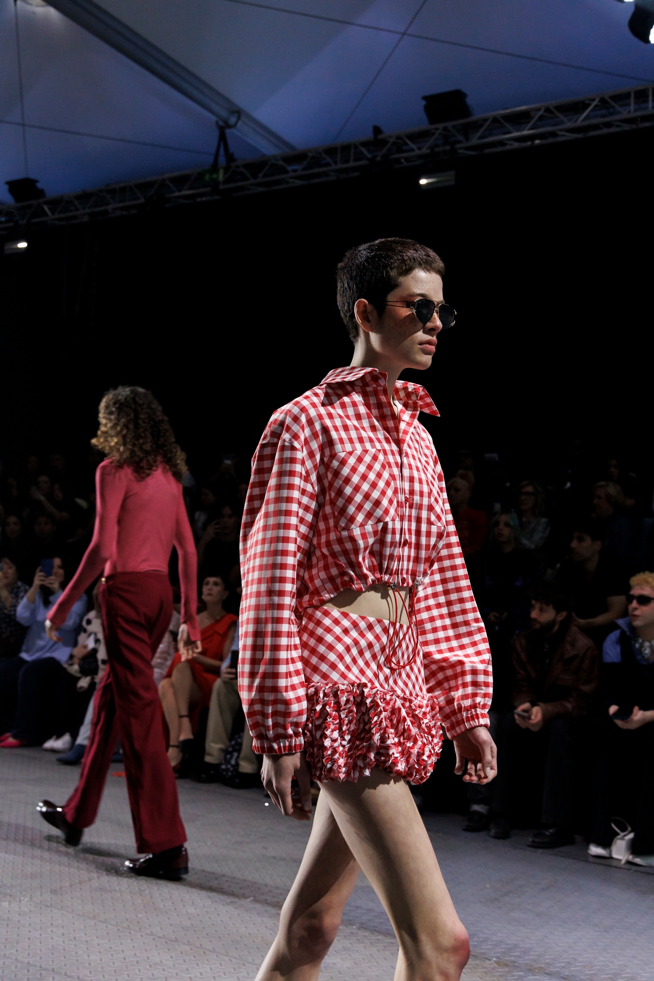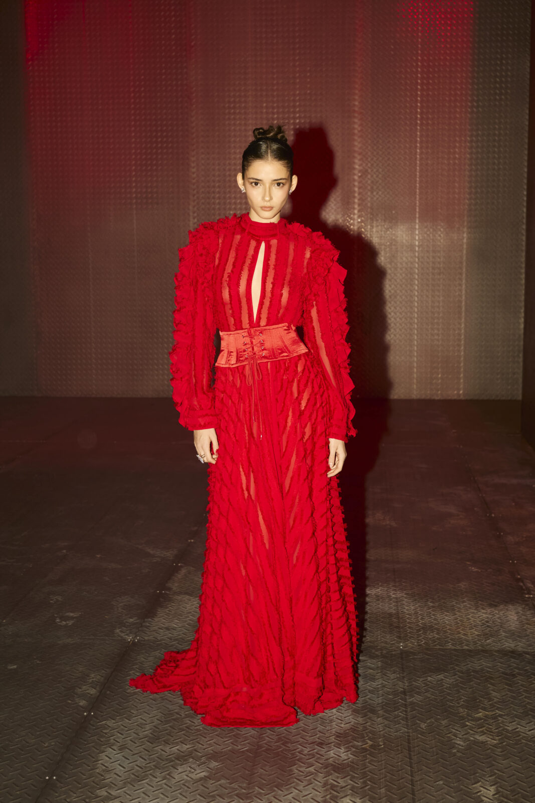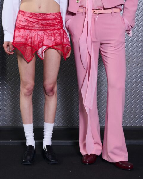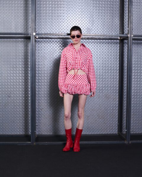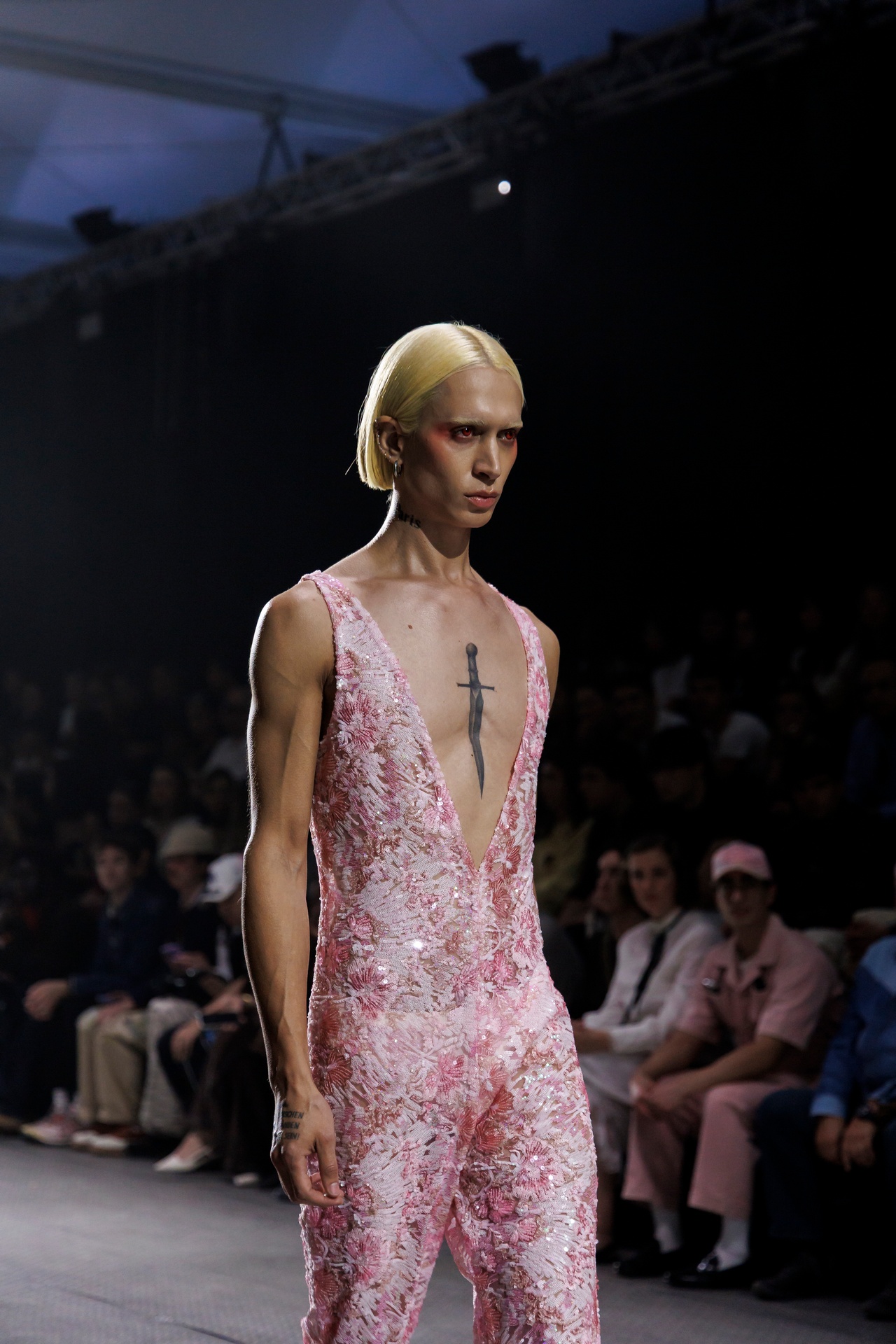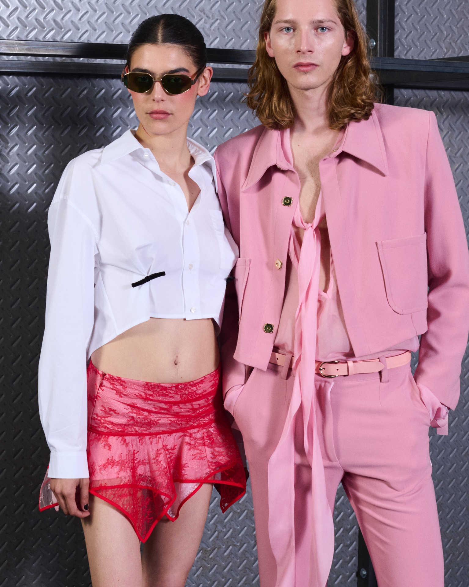 Estas referencias se materializan en siluetas versátiles, pensadas tanto para prendas femeninas como masculinas, desdibujando los límites de género. La colección combina sargas plisadas mediante costuras, popelines en vichy y algodones para el día, mientras que chantilly, tules, pieles artificiales con plumas y gasas aportan ligereza y teatralidad nocturna. La paleta gira en torno a rosas y rojos granate, con acentos marrones y azules. Volúmenes marcados en faldas y hombros, lazos constantes, volantes y puntillas equilibran inocencia y sensualidad, construyendo una estética donde vulnerabilidad y poder coexisten.