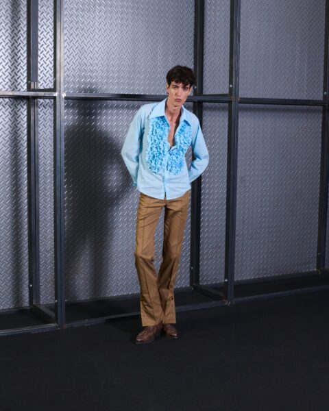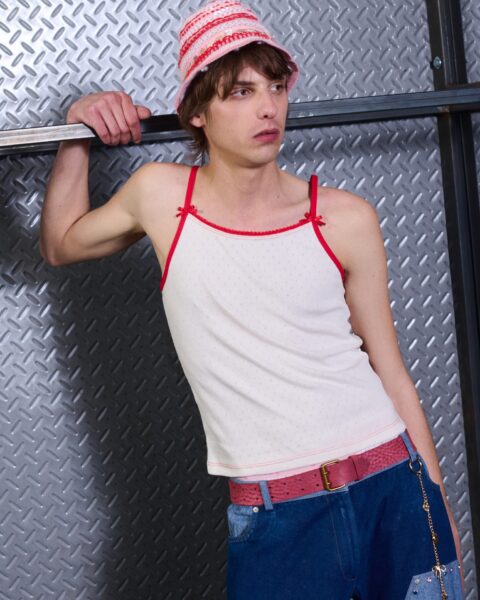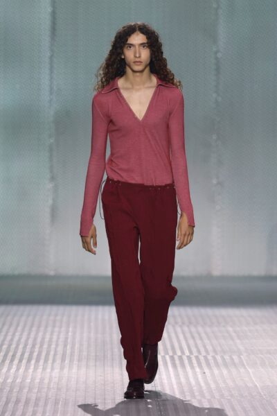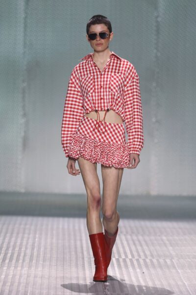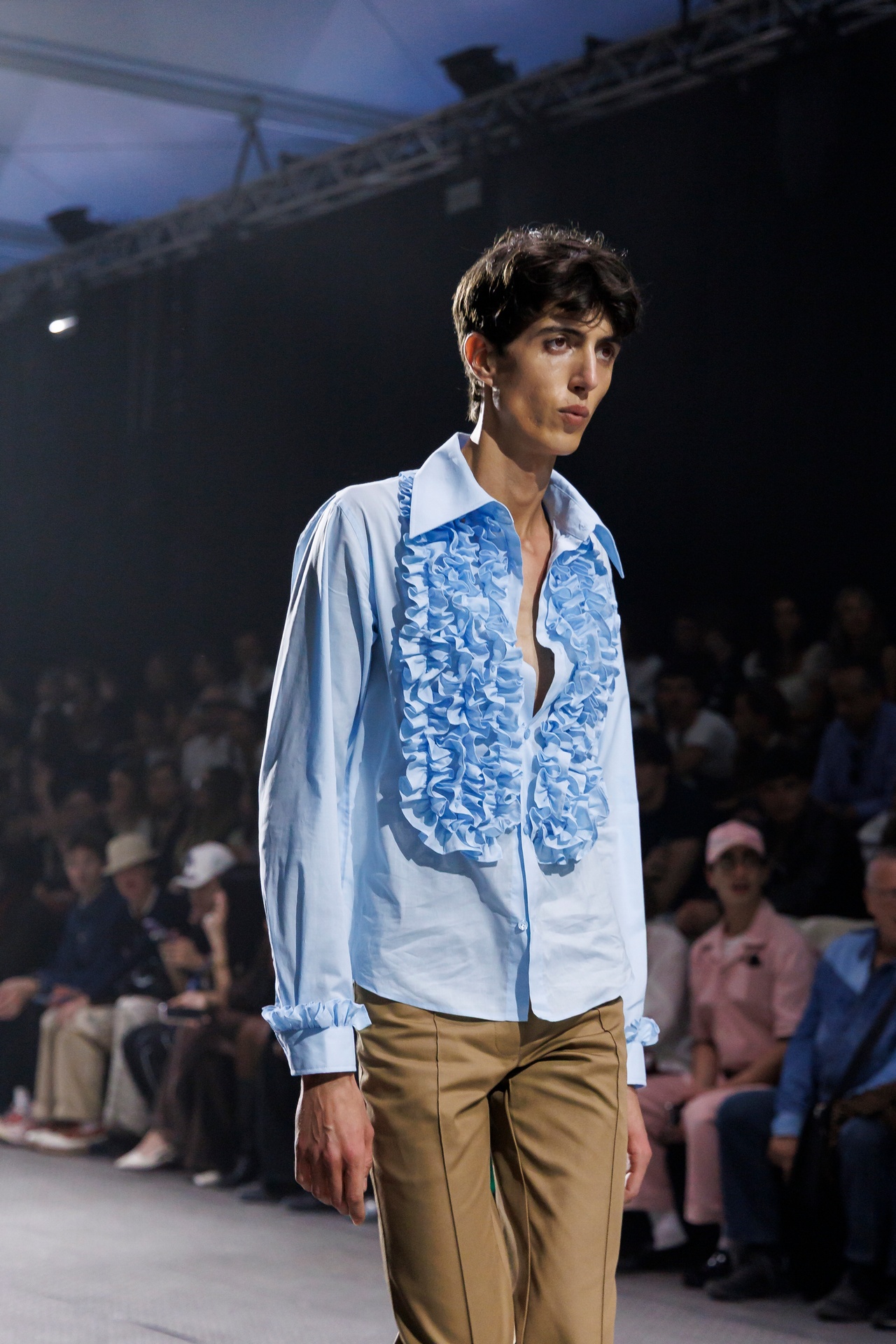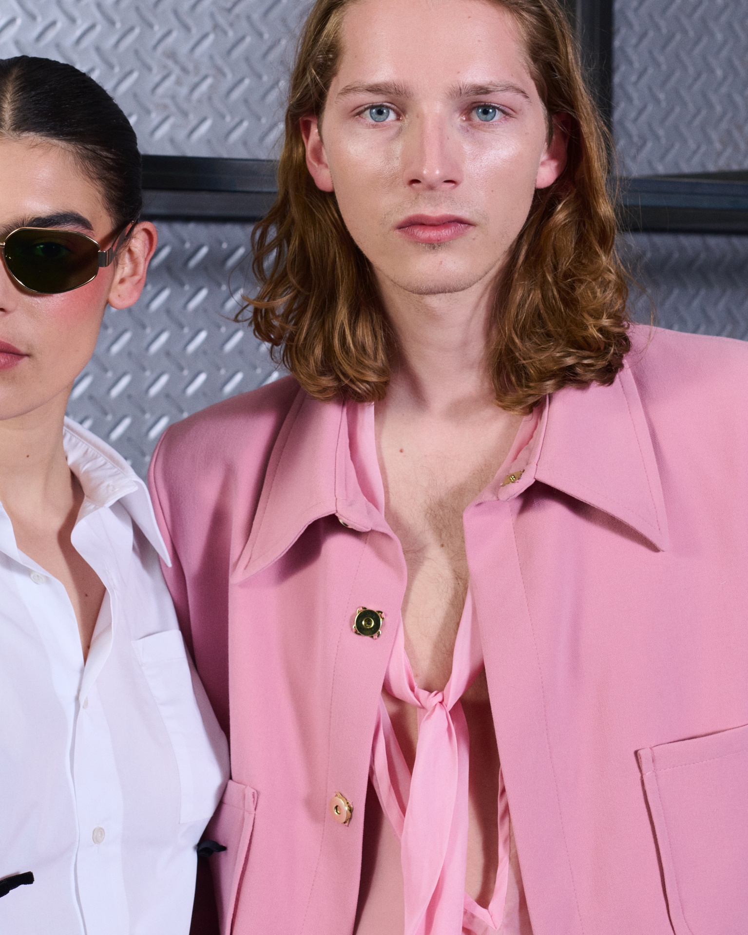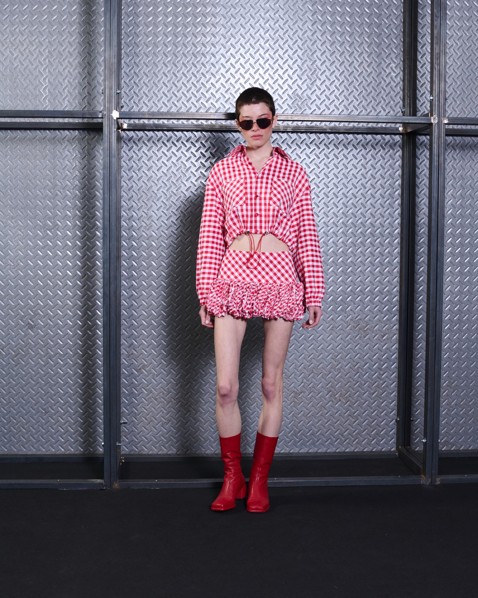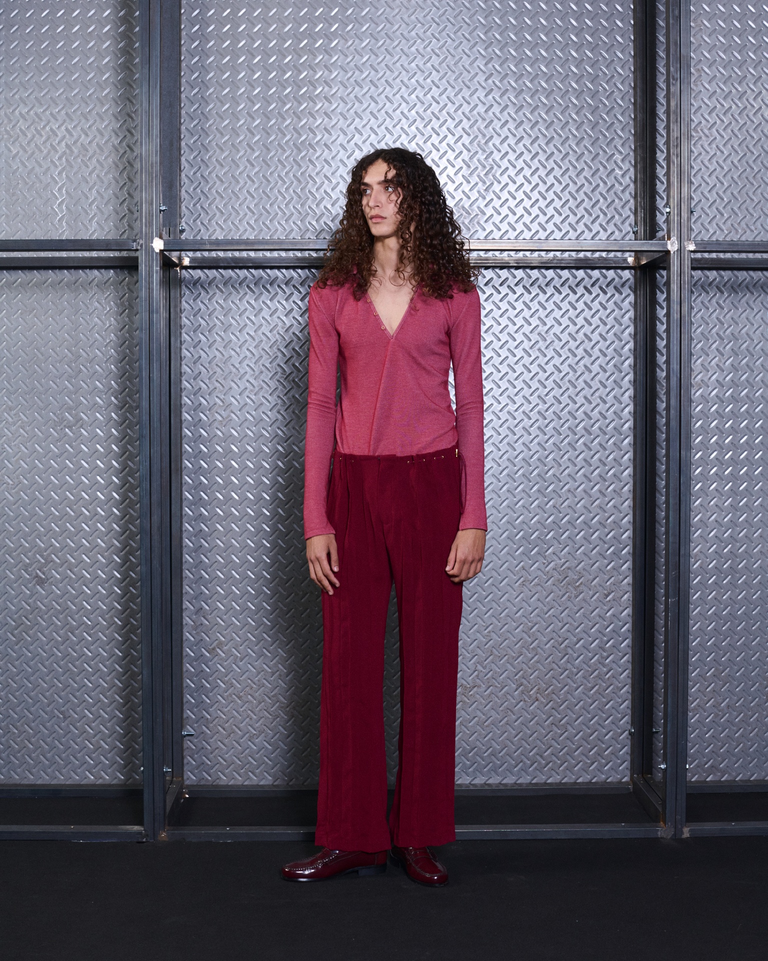 Estas referencias se materializan en siluetas versátiles, pensadas tanto para prendas femeninas como masculinas, desdibujando los límites de género. La colección combina sargas plisadas mediante costuras, popelines en vichy y algodones para el día, mientras que chantilly, tules, pieles artificiales con plumas y gasas aportan ligereza y teatralidad nocturna. La paleta gira en torno a rosas y rojos granate, con acentos marrones y azules. Volúmenes marcados en faldas y hombros, lazos constantes, volantes y puntillas equilibran inocencia y sensualidad, construyendo una estética donde vulnerabilidad y poder coexisten.