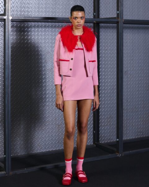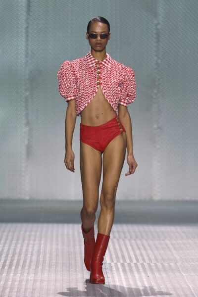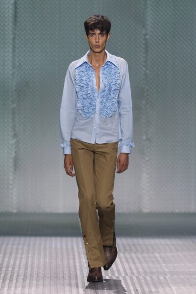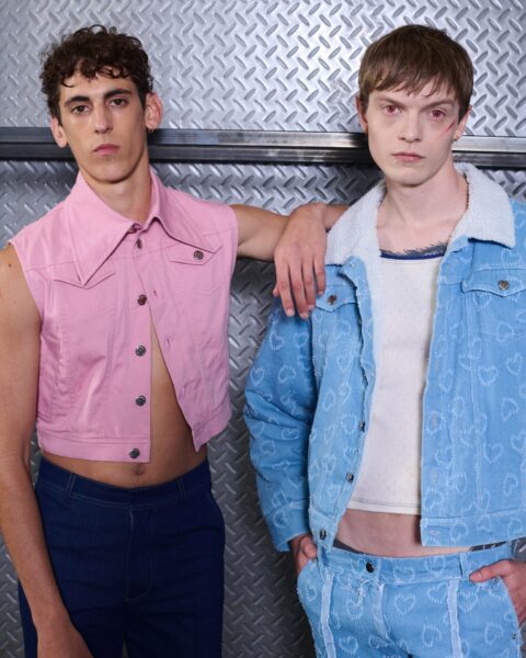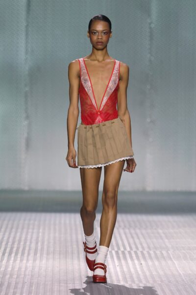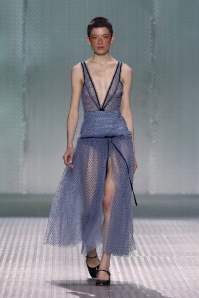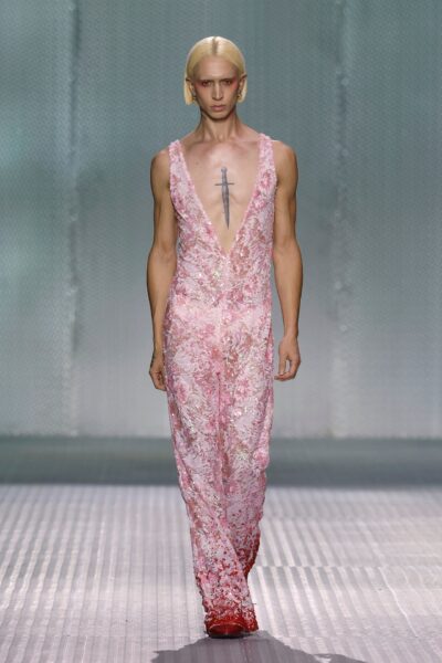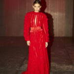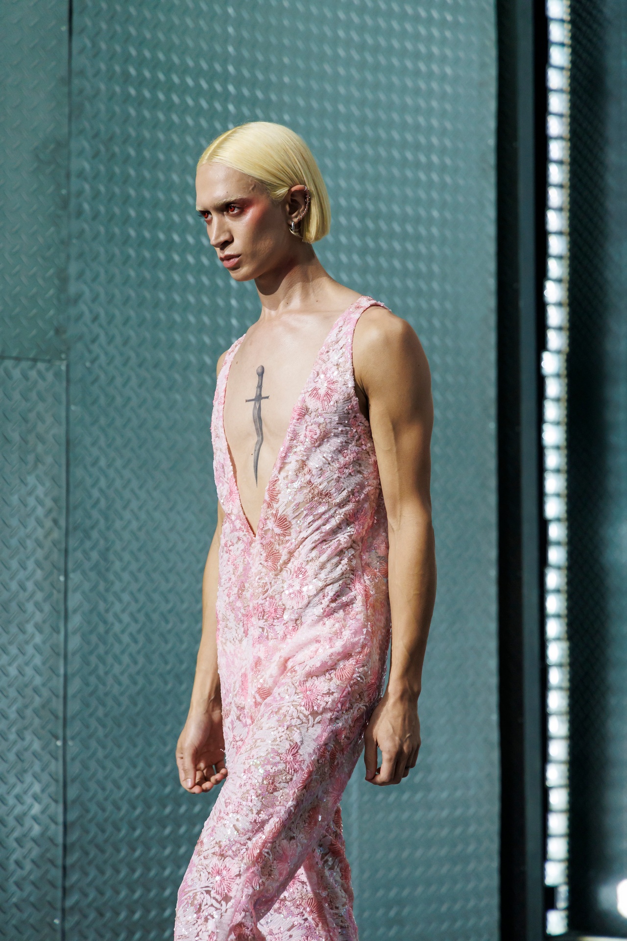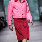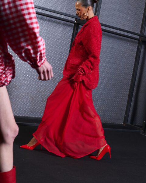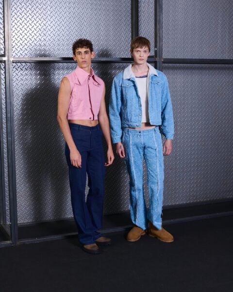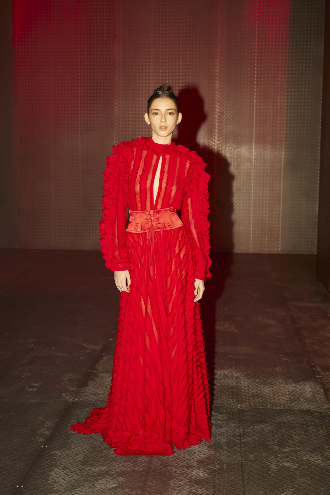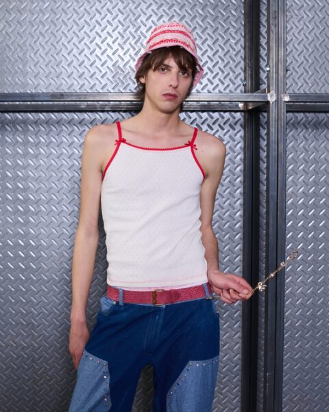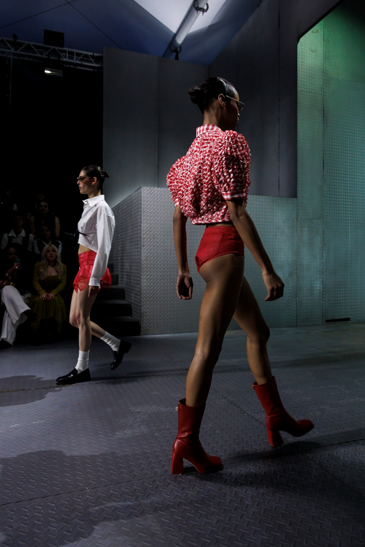 Estas referencias se materializan en siluetas versátiles, pensadas tanto para prendas femeninas como masculinas, desdibujando los límites de género. La colección combina sargas plisadas mediante costuras, popelines en vichy y algodones para el día, mientras que chantilly, tules, pieles artificiales con plumas y gasas aportan ligereza y teatralidad nocturna. La paleta gira en torno a rosas y rojos granate, con acentos marrones y azules. Volúmenes marcados en faldas y hombros, lazos constantes, volantes y puntillas equilibran inocencia y sensualidad, construyendo una estética donde vulnerabilidad y poder coexisten.