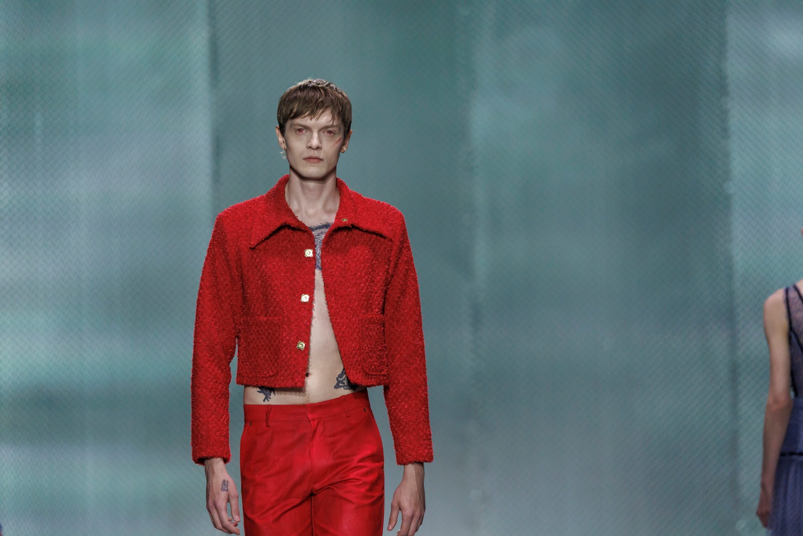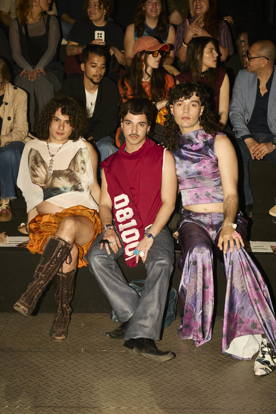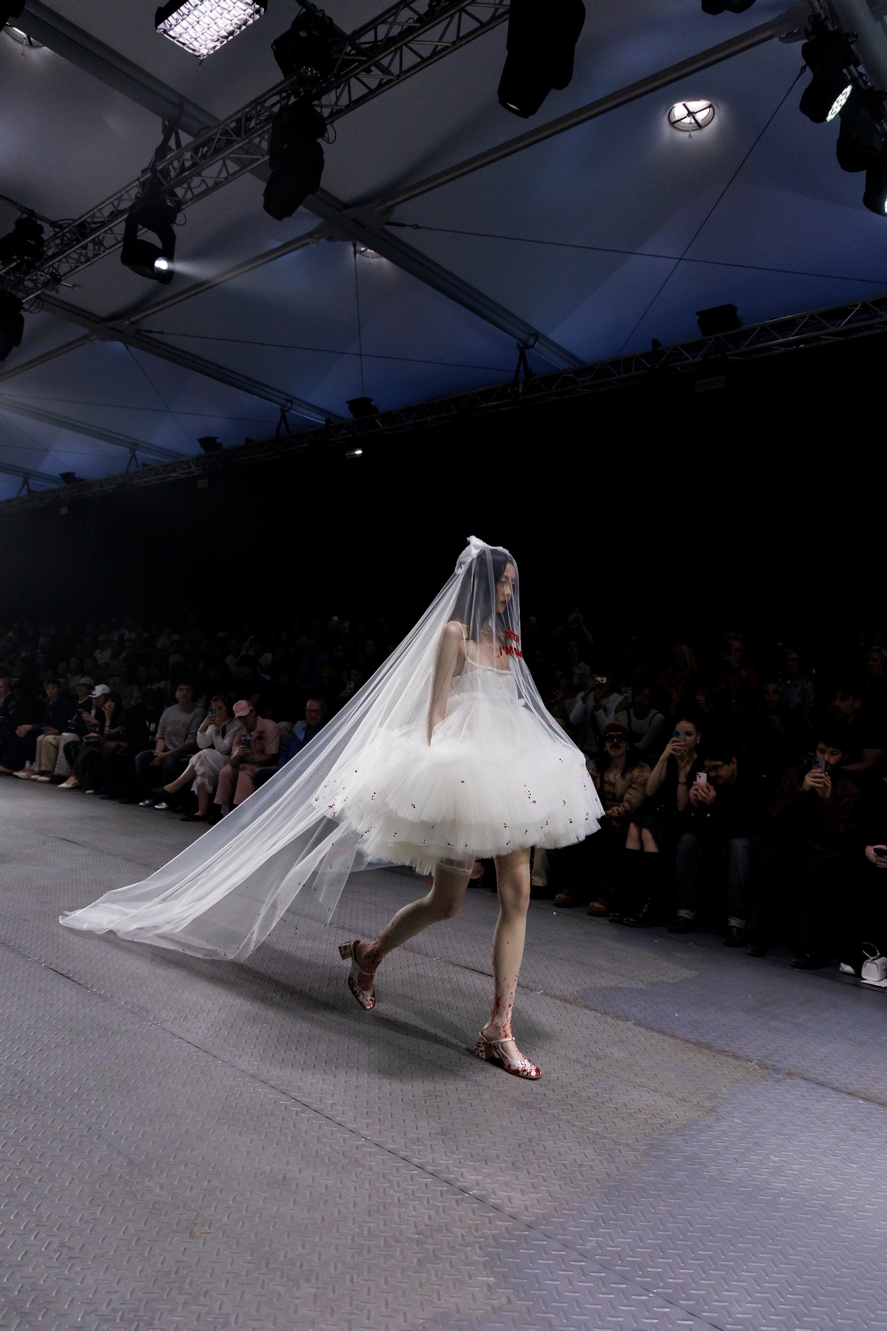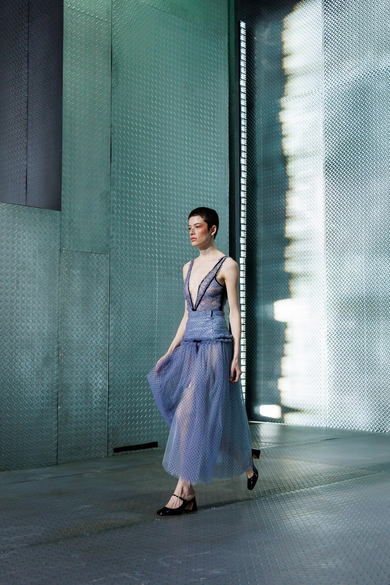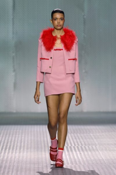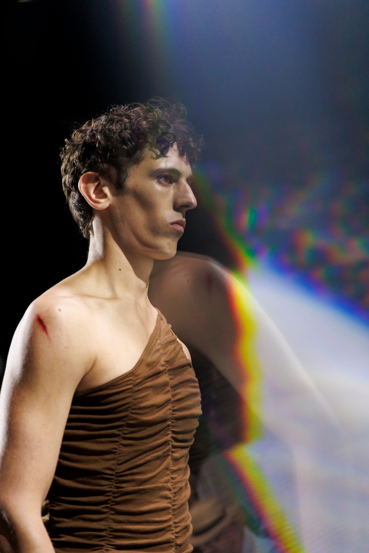 Estas referencias se materializan en siluetas versátiles, pensadas tanto para prendas femeninas como masculinas, desdibujando los límites de género. La colección combina sargas plisadas mediante costuras, popelines en vichy y algodones para el día, mientras que chantilly, tules, pieles artificiales con plumas y gasas aportan ligereza y teatralidad nocturna. La paleta gira en torno a rosas y rojos granate, con acentos marrones y azules. Volúmenes marcados en faldas y hombros, lazos constantes, volantes y puntillas equilibran inocencia y sensualidad, construyendo una estética donde vulnerabilidad y poder coexisten.