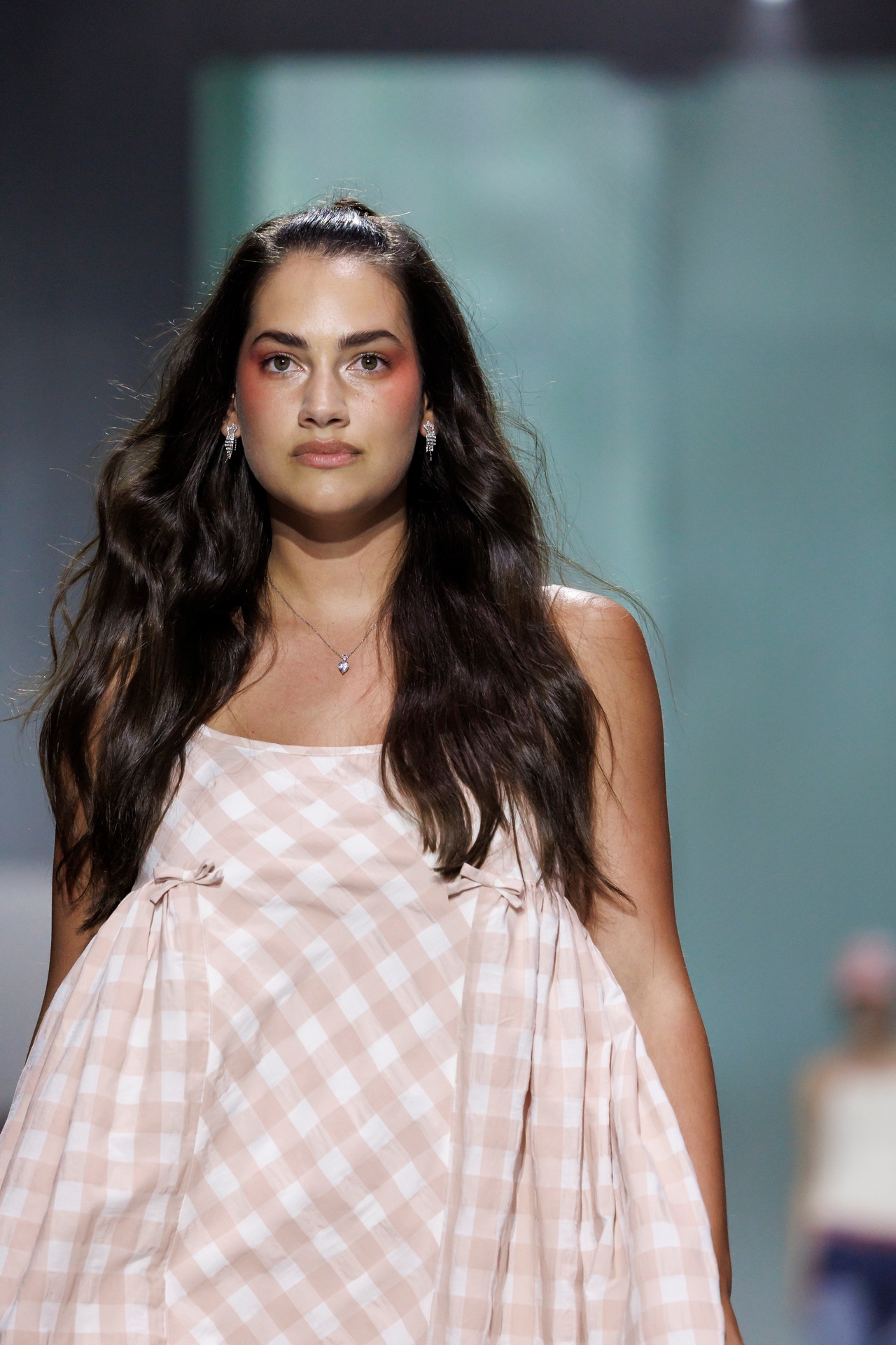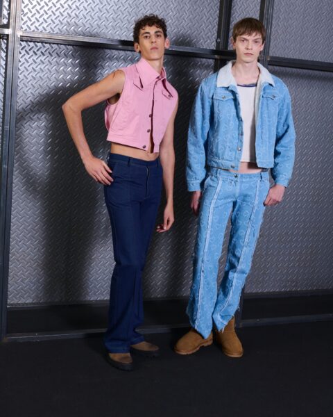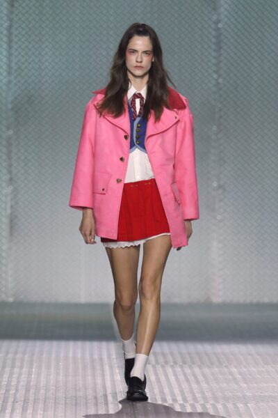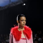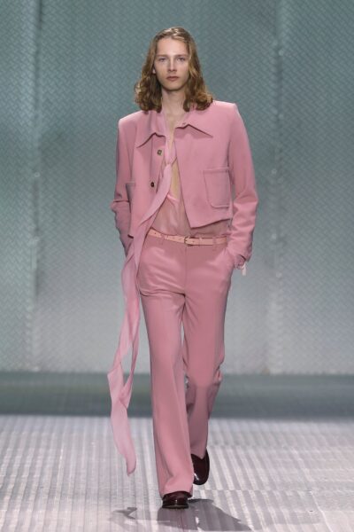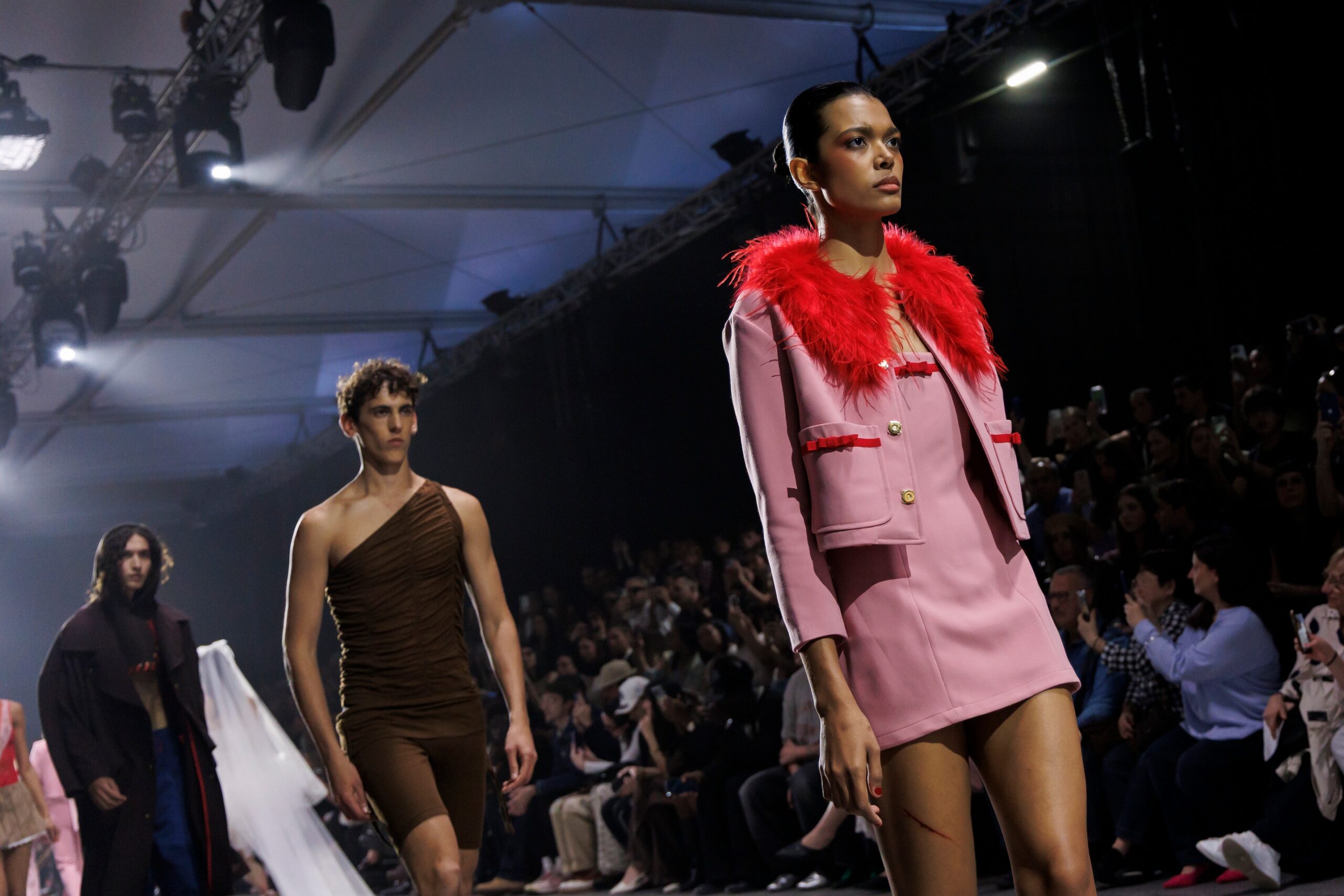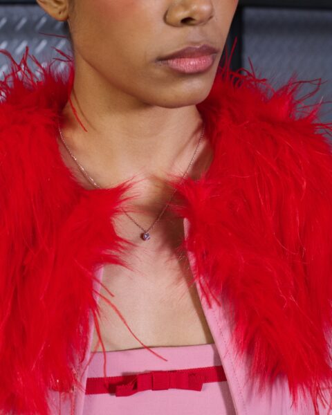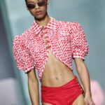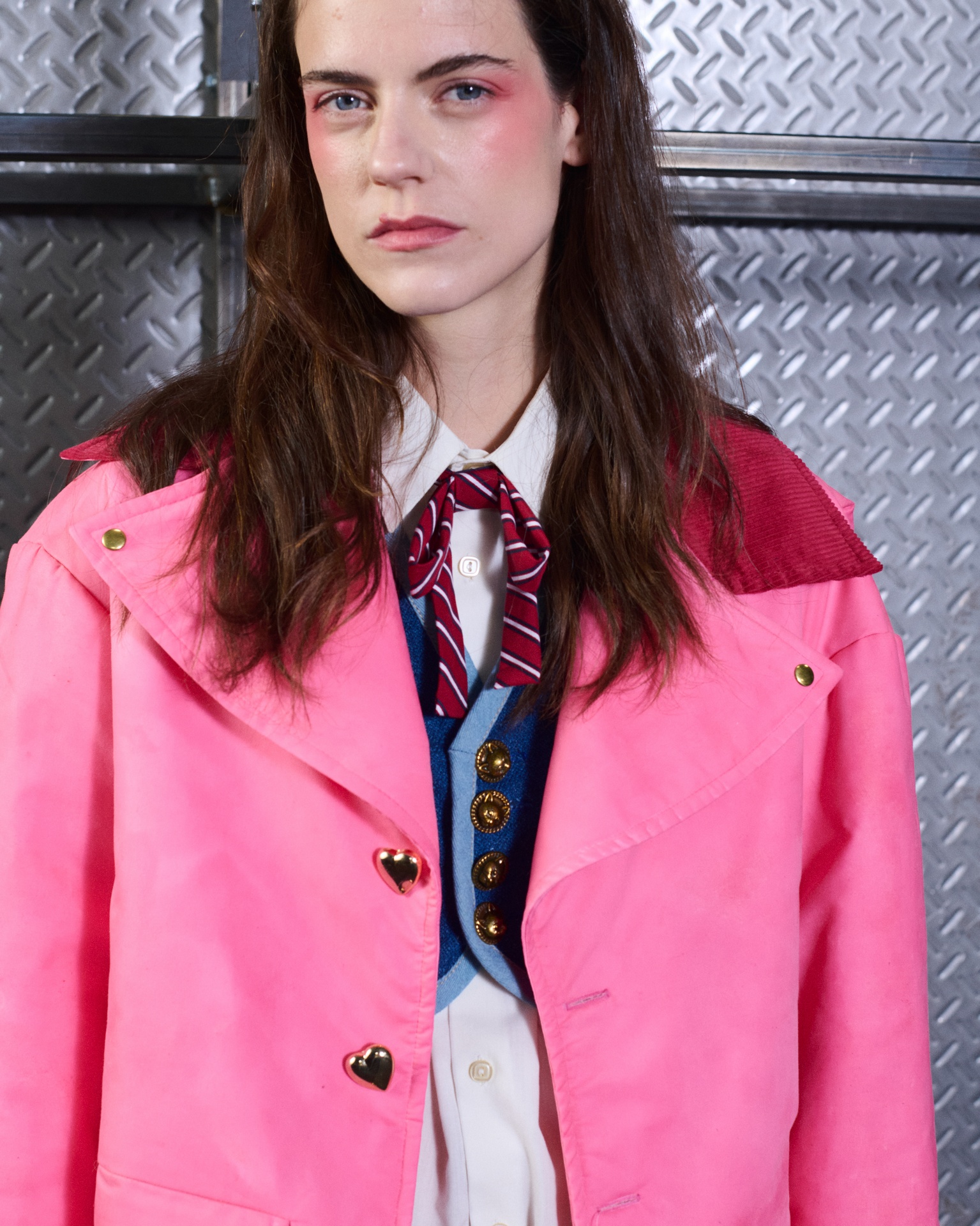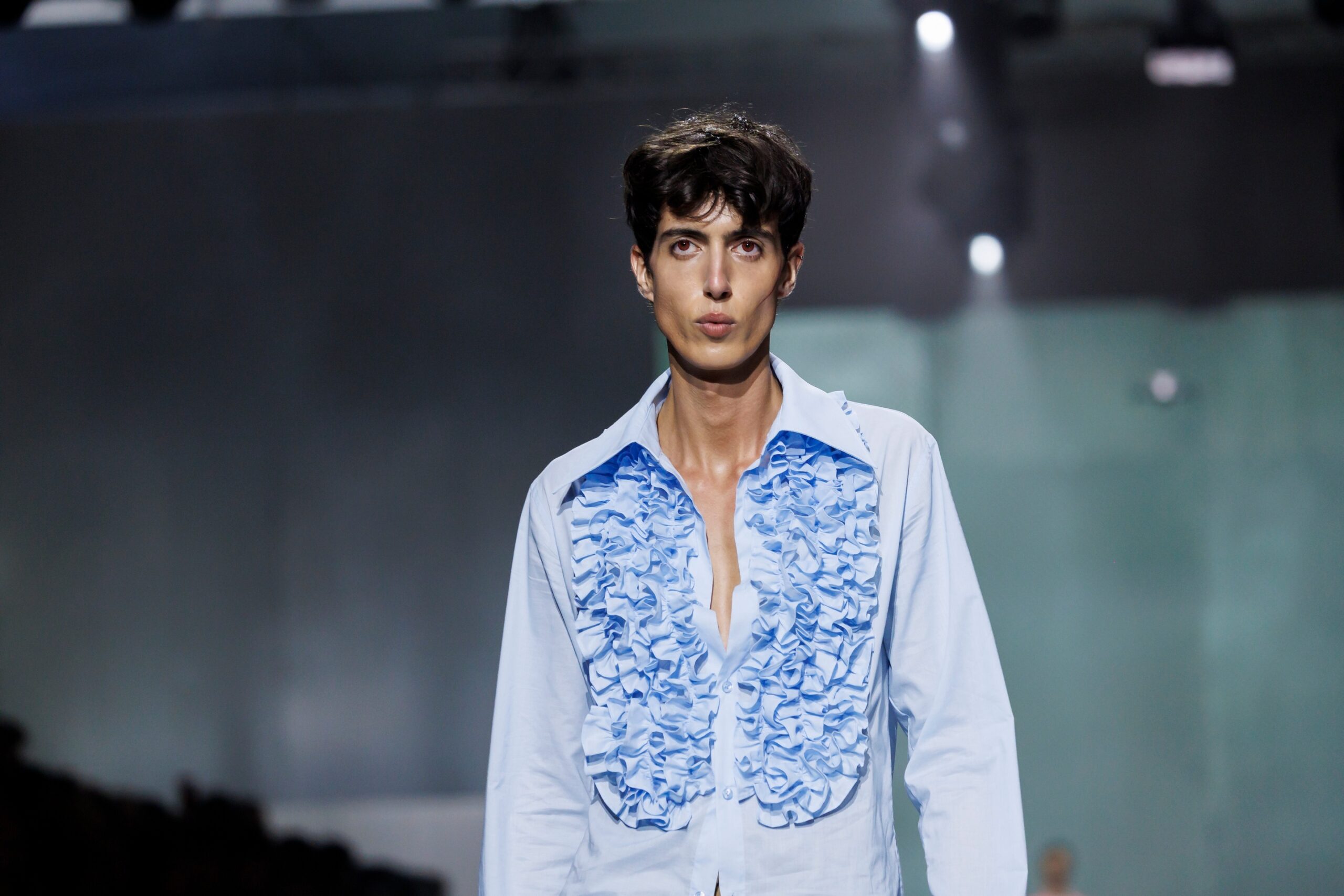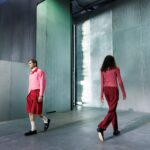 Estas referencias se materializan en siluetas versátiles, pensadas tanto para prendas femeninas como masculinas, desdibujando los límites de género. La colección combina sargas plisadas mediante costuras, popelines en vichy y algodones para el día, mientras que chantilly, tules, pieles artificiales con plumas y gasas aportan ligereza y teatralidad nocturna. La paleta gira en torno a rosas y rojos granate, con acentos marrones y azules. Volúmenes marcados en faldas y hombros, lazos constantes, volantes y puntillas equilibran inocencia y sensualidad, construyendo una estética donde vulnerabilidad y poder coexisten.