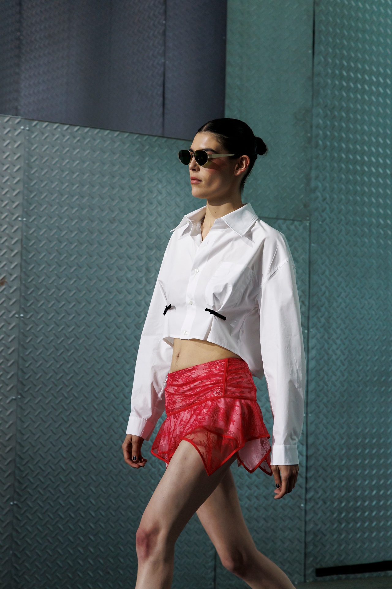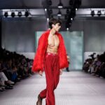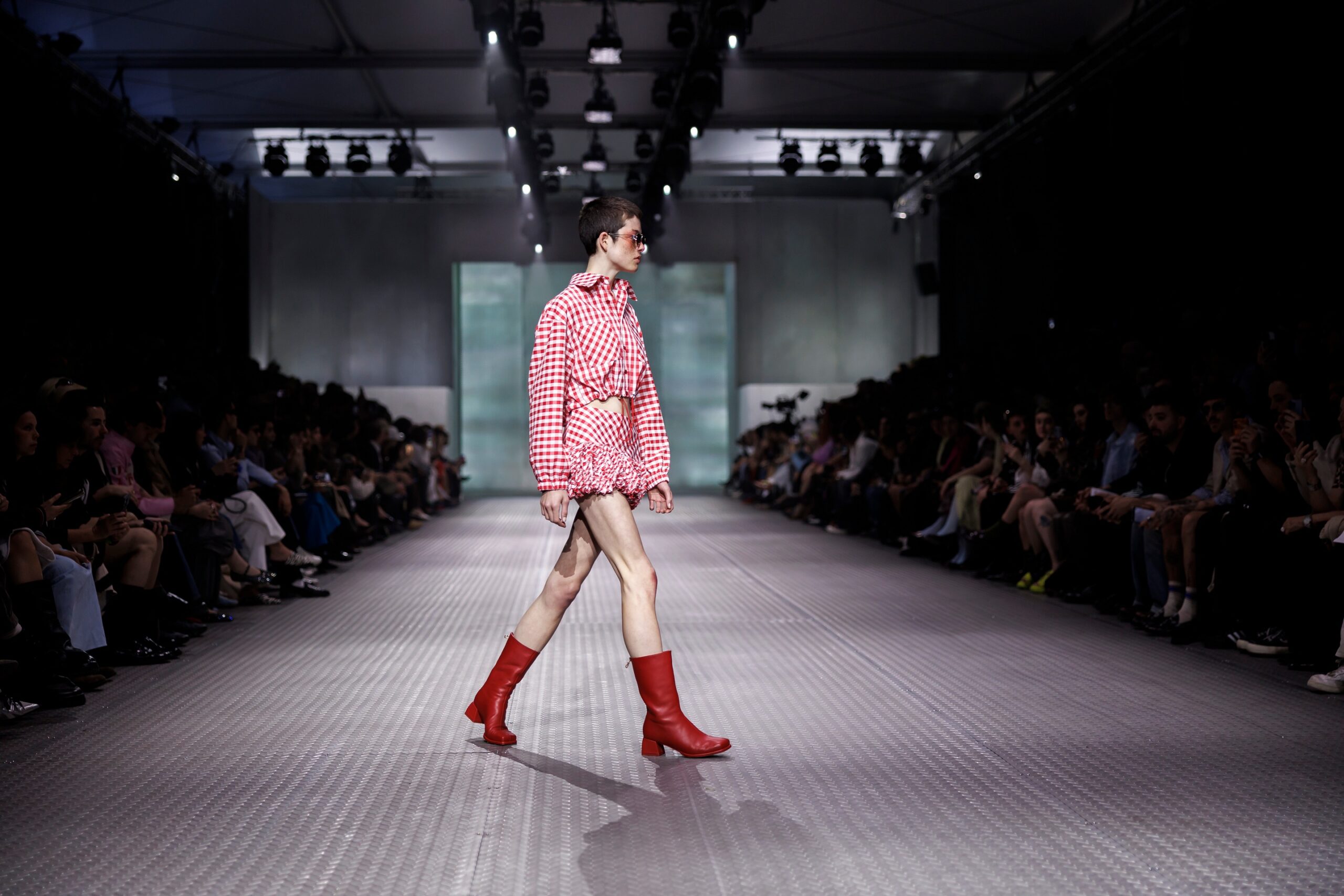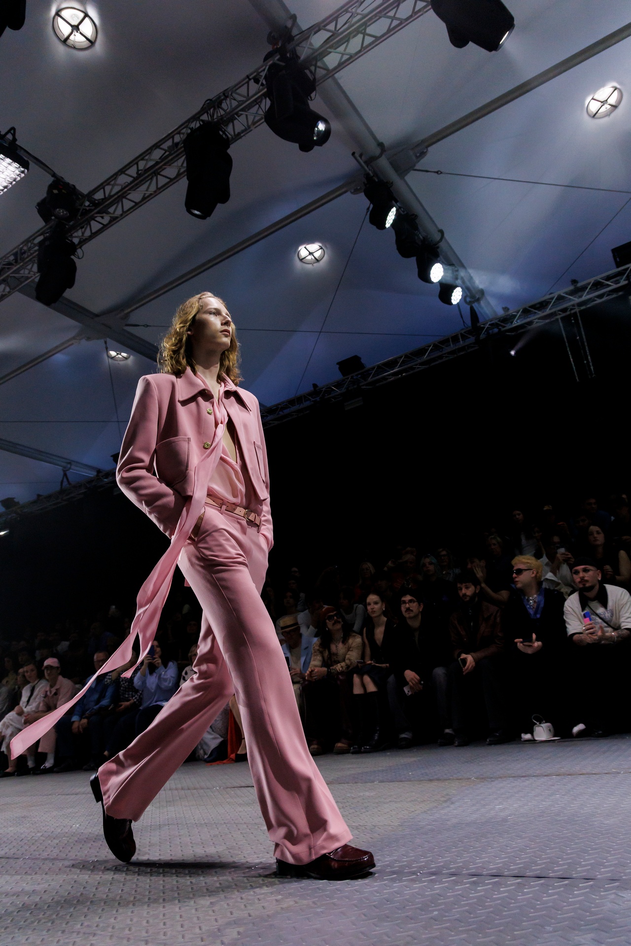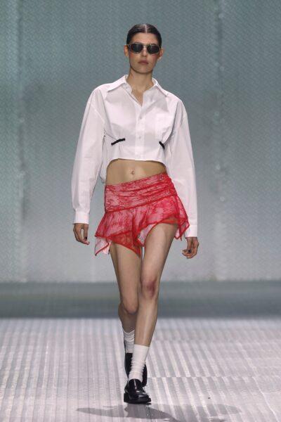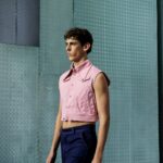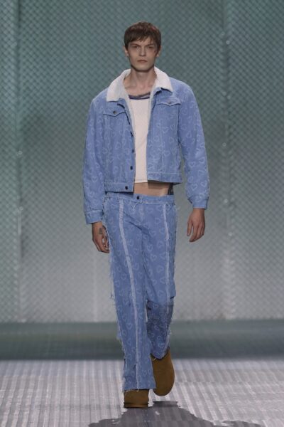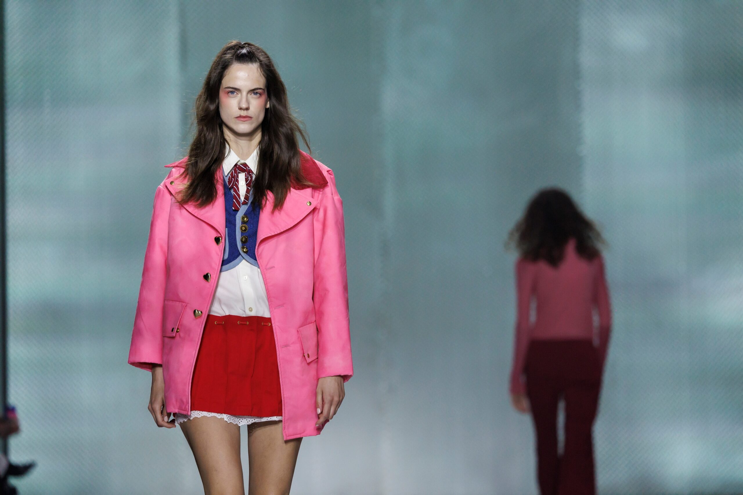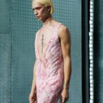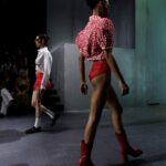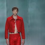 Estas referencias se materializan en siluetas versátiles, pensadas tanto para prendas femeninas como masculinas, desdibujando los límites de género. La colección combina sargas plisadas mediante costuras, popelines en vichy y algodones para el día, mientras que chantilly, tules, pieles artificiales con plumas y gasas aportan ligereza y teatralidad nocturna. La paleta gira en torno a rosas y rojos granate, con acentos marrones y azules. Volúmenes marcados en faldas y hombros, lazos constantes, volantes y puntillas equilibran inocencia y sensualidad, construyendo una estética donde vulnerabilidad y poder coexisten.