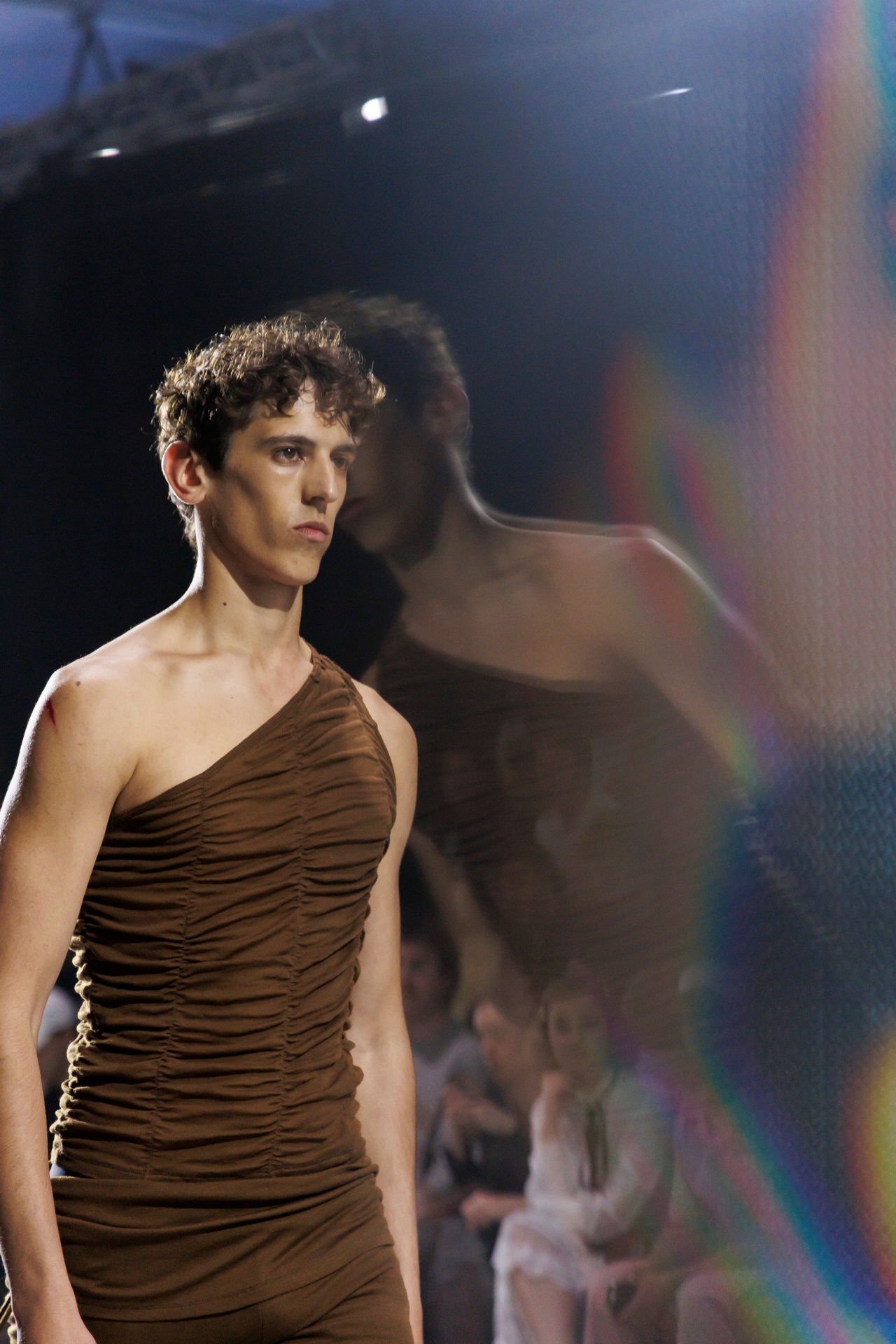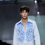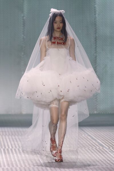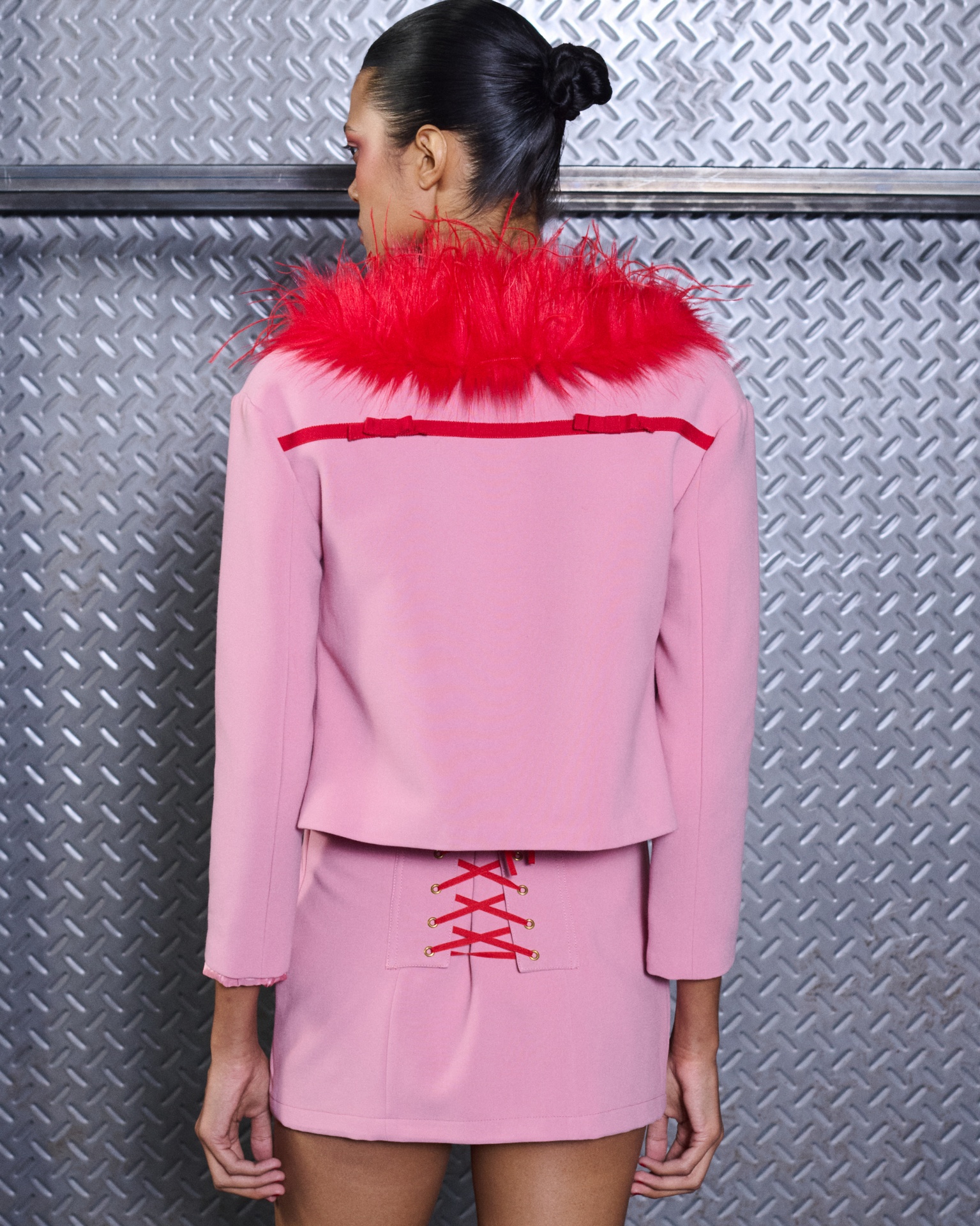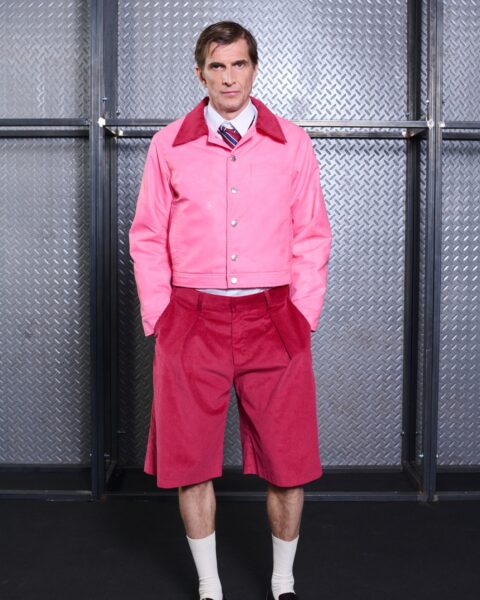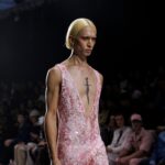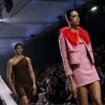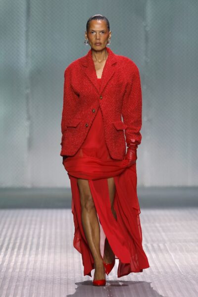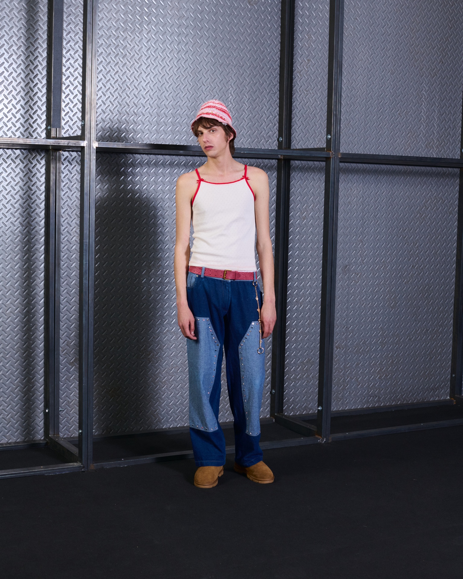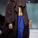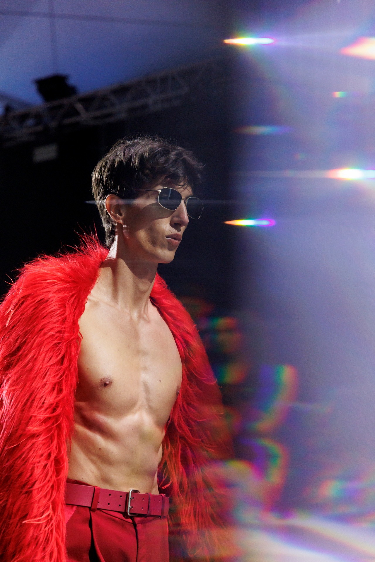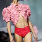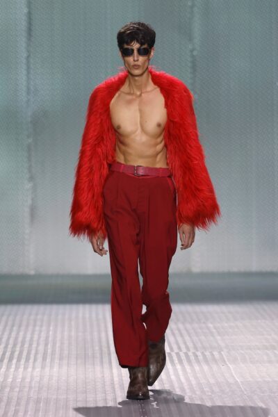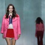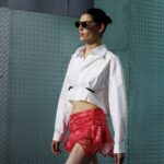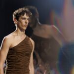 Estas referencias se materializan en siluetas versátiles, pensadas tanto para prendas femeninas como masculinas, desdibujando los límites de género. La colección combina sargas plisadas mediante costuras, popelines en vichy y algodones para el día, mientras que chantilly, tules, pieles artificiales con plumas y gasas aportan ligereza y teatralidad nocturna. La paleta gira en torno a rosas y rojos granate, con acentos marrones y azules. Volúmenes marcados en faldas y hombros, lazos constantes, volantes y puntillas equilibran inocencia y sensualidad, construyendo una estética donde vulnerabilidad y poder coexisten.