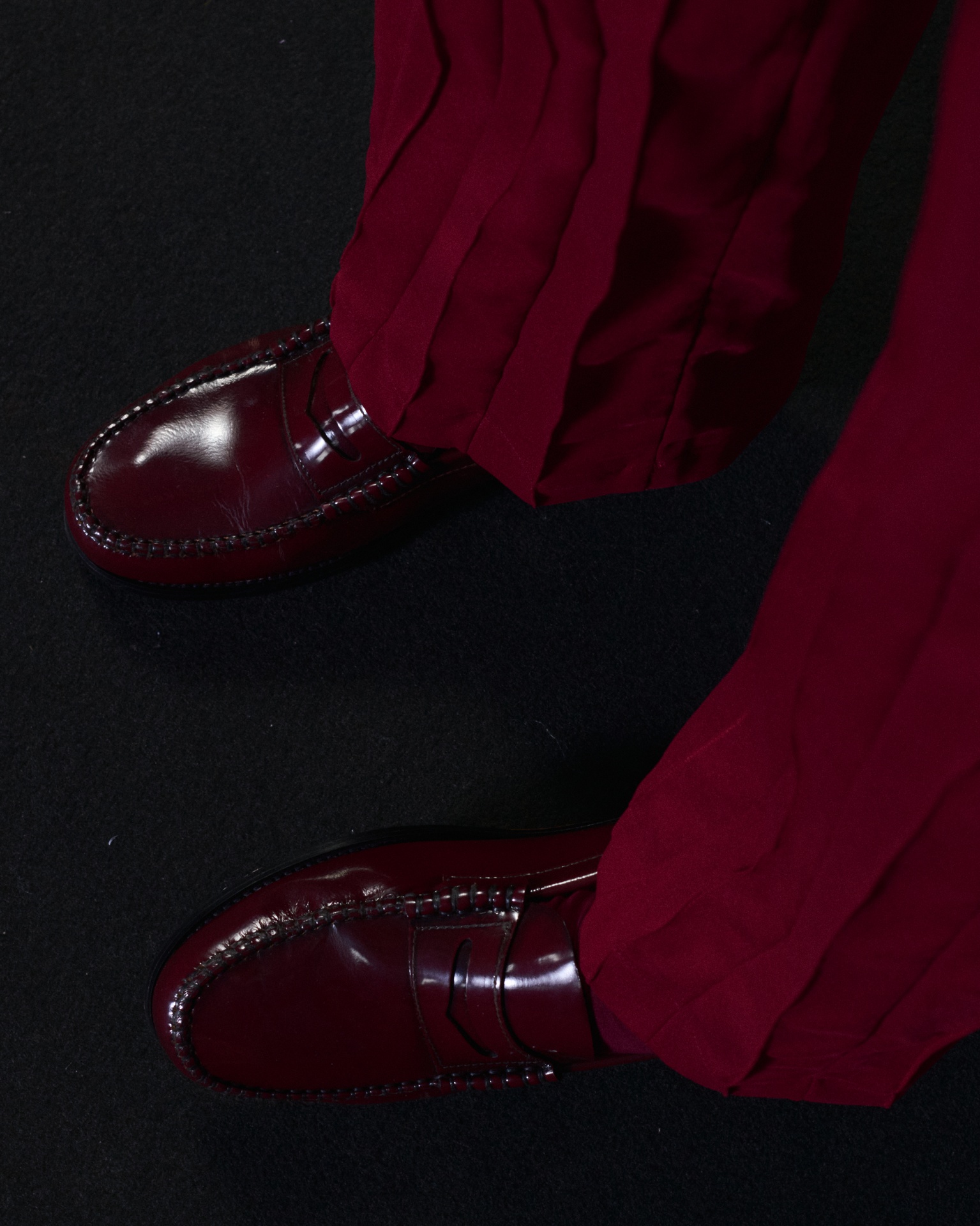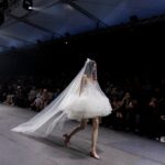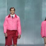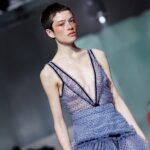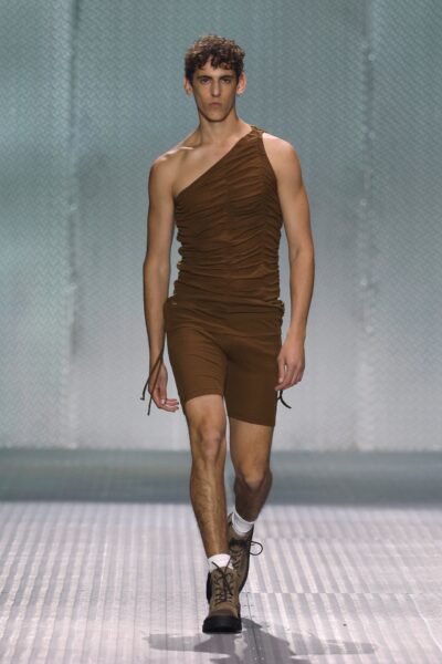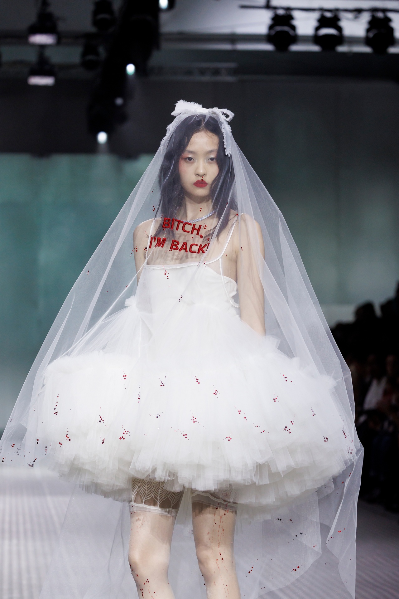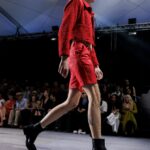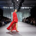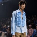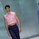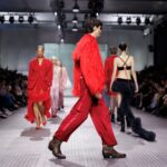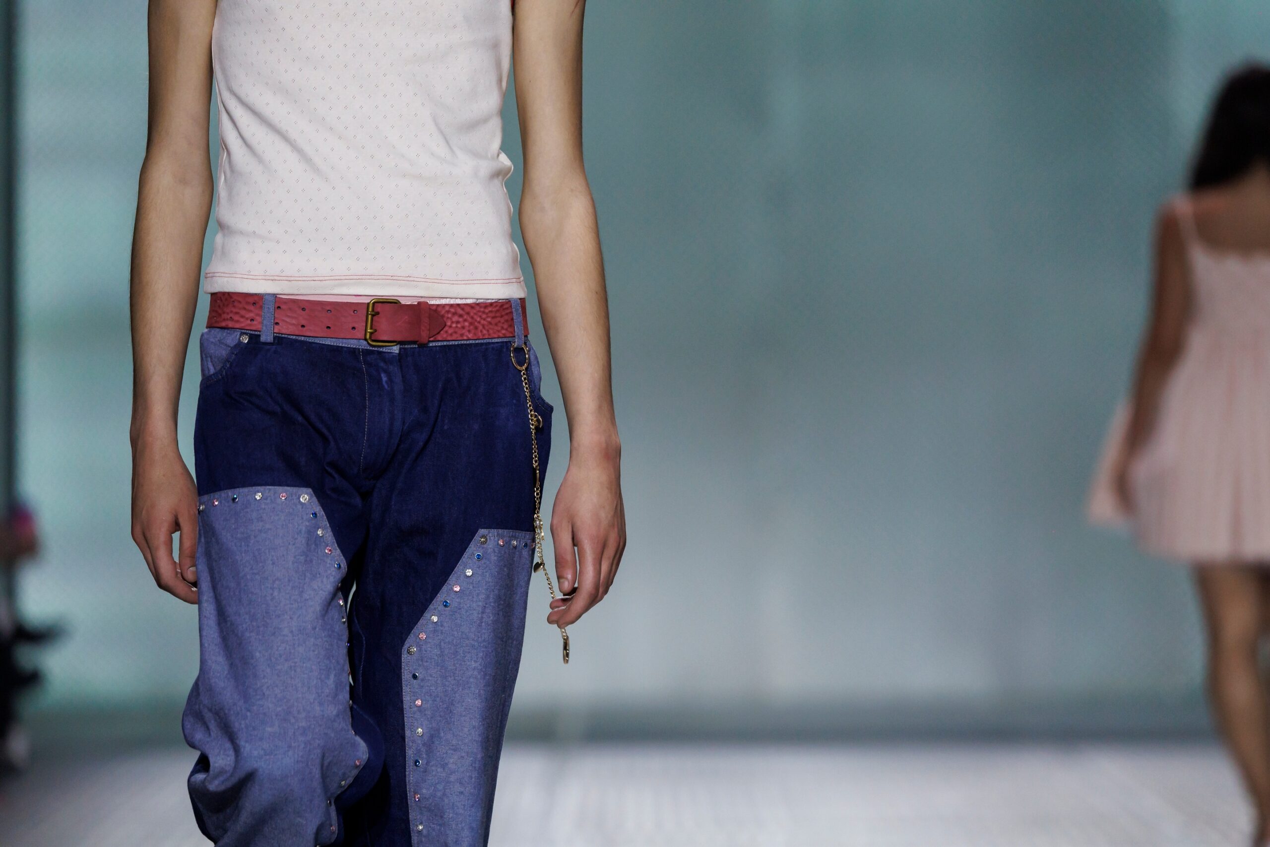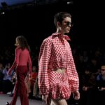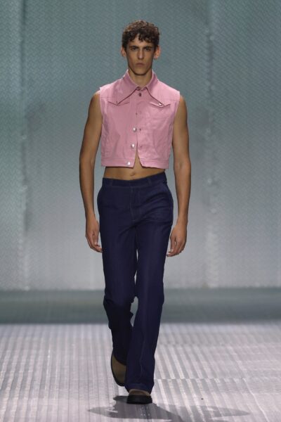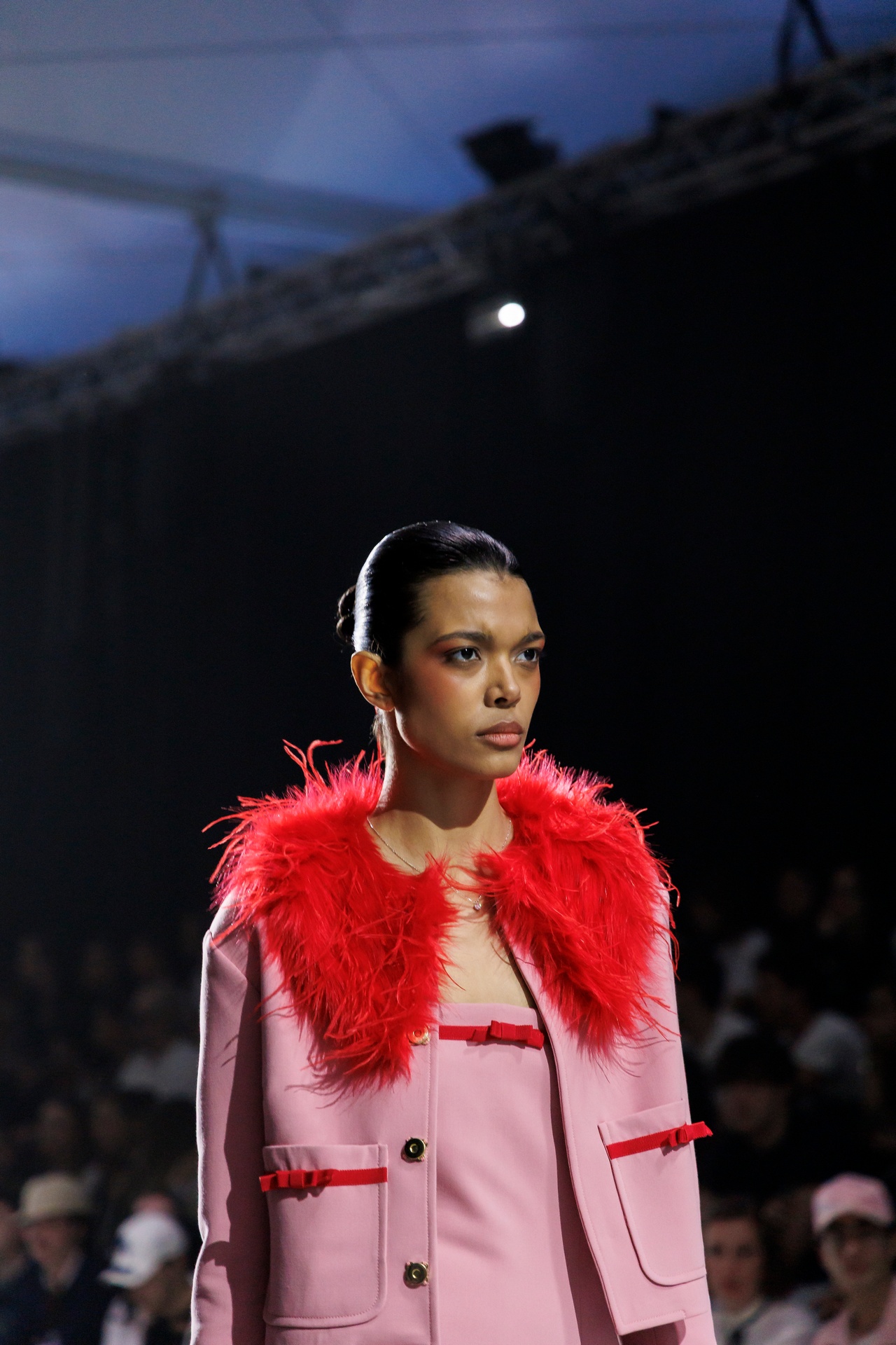 Estas referencias se materializan en siluetas versátiles, pensadas tanto para prendas femeninas como masculinas, desdibujando los límites de género. La colección combina sargas plisadas mediante costuras, popelines en vichy y algodones para el día, mientras que chantilly, tules, pieles artificiales con plumas y gasas aportan ligereza y teatralidad nocturna. La paleta gira en torno a rosas y rojos granate, con acentos marrones y azules. Volúmenes marcados en faldas y hombros, lazos constantes, volantes y puntillas equilibran inocencia y sensualidad, construyendo una estética donde vulnerabilidad y poder coexisten.
