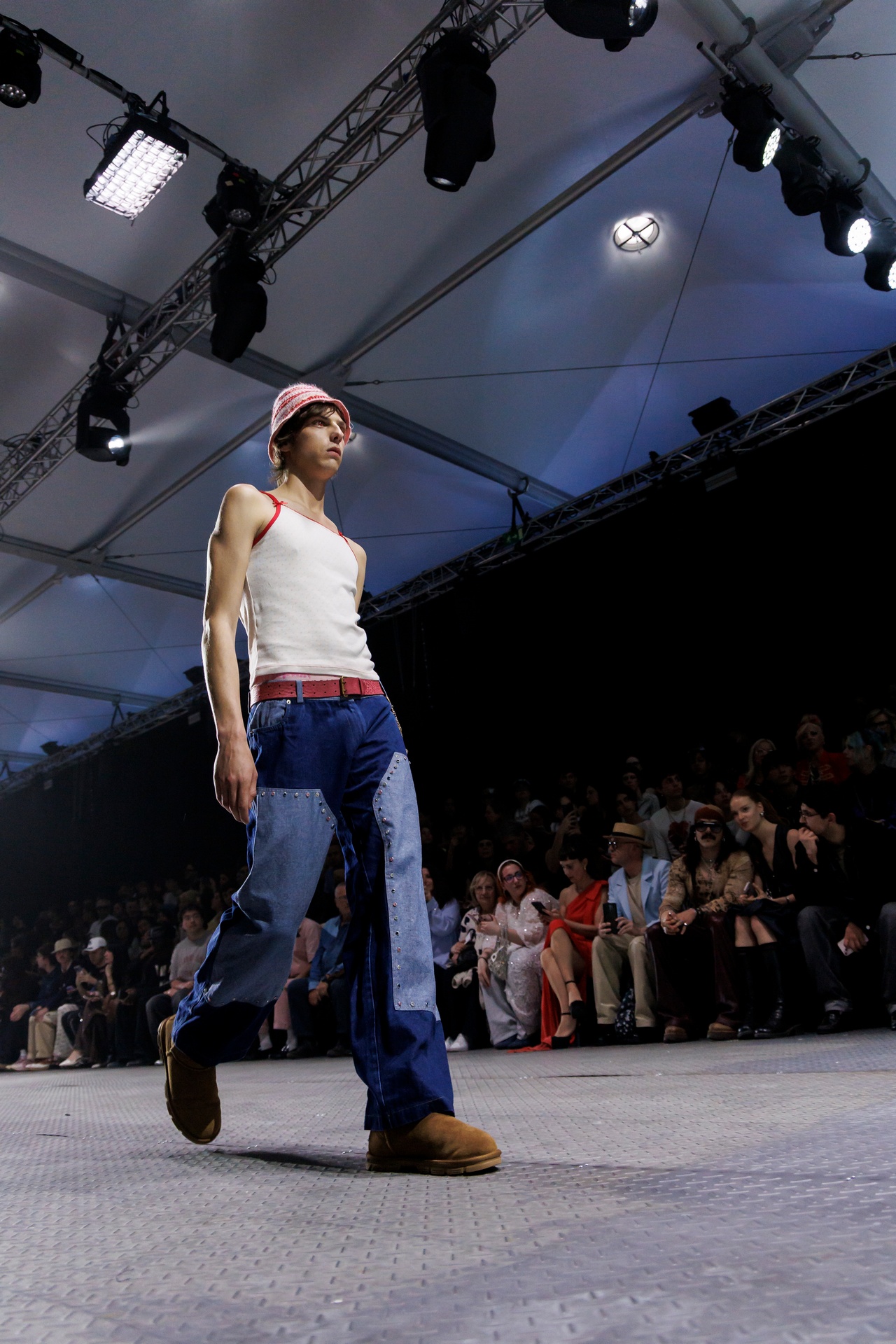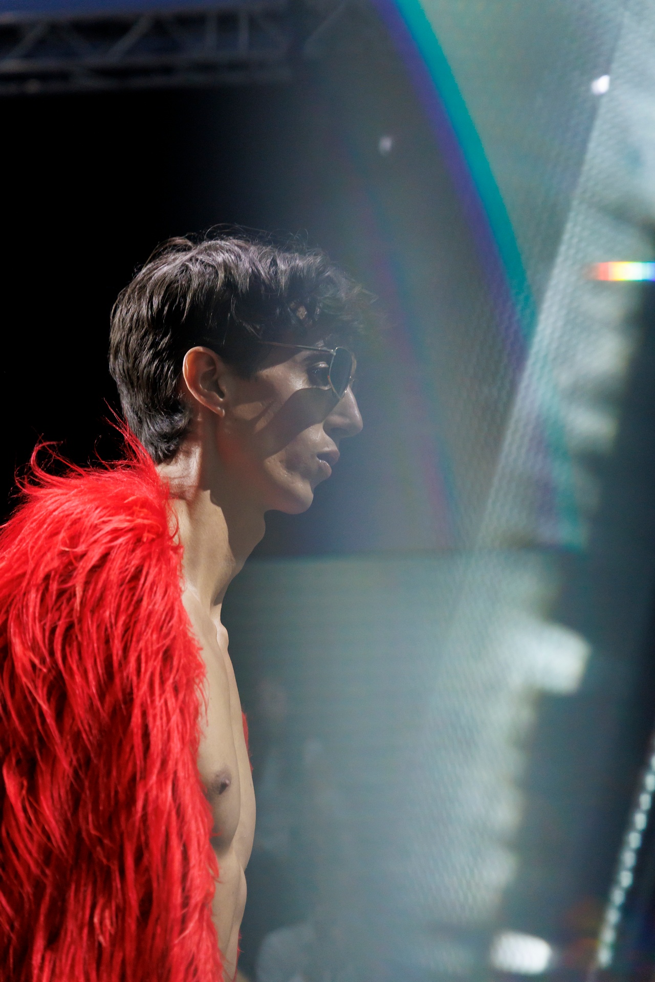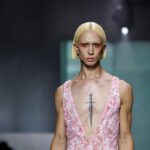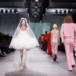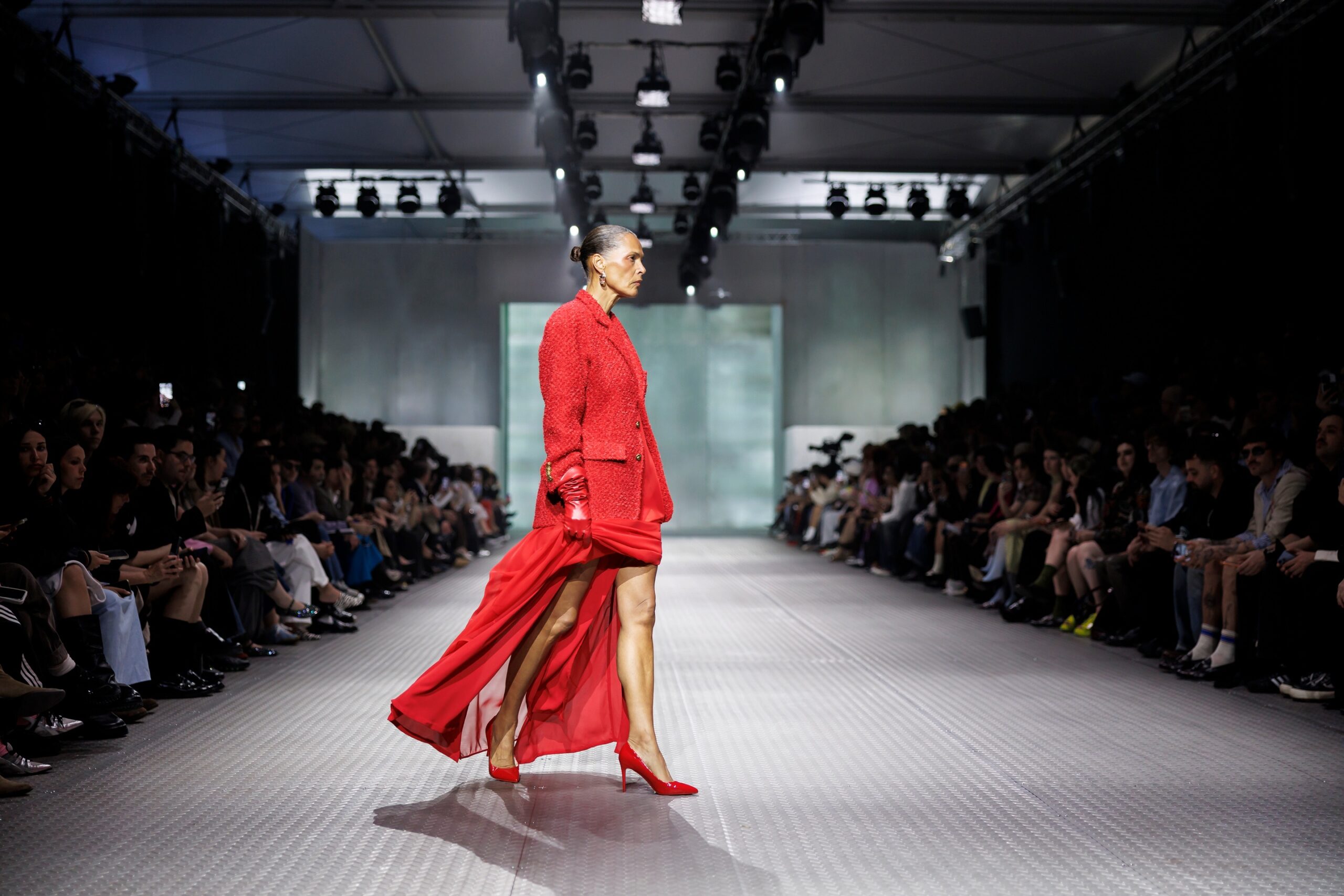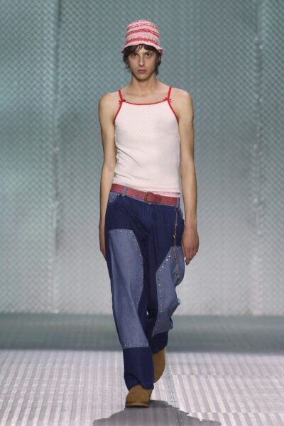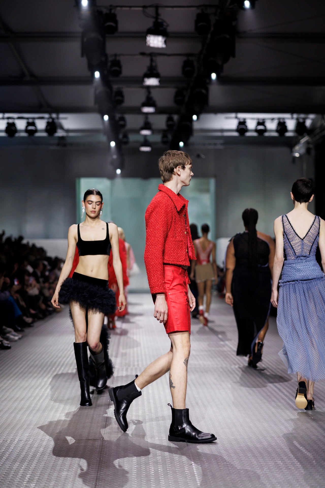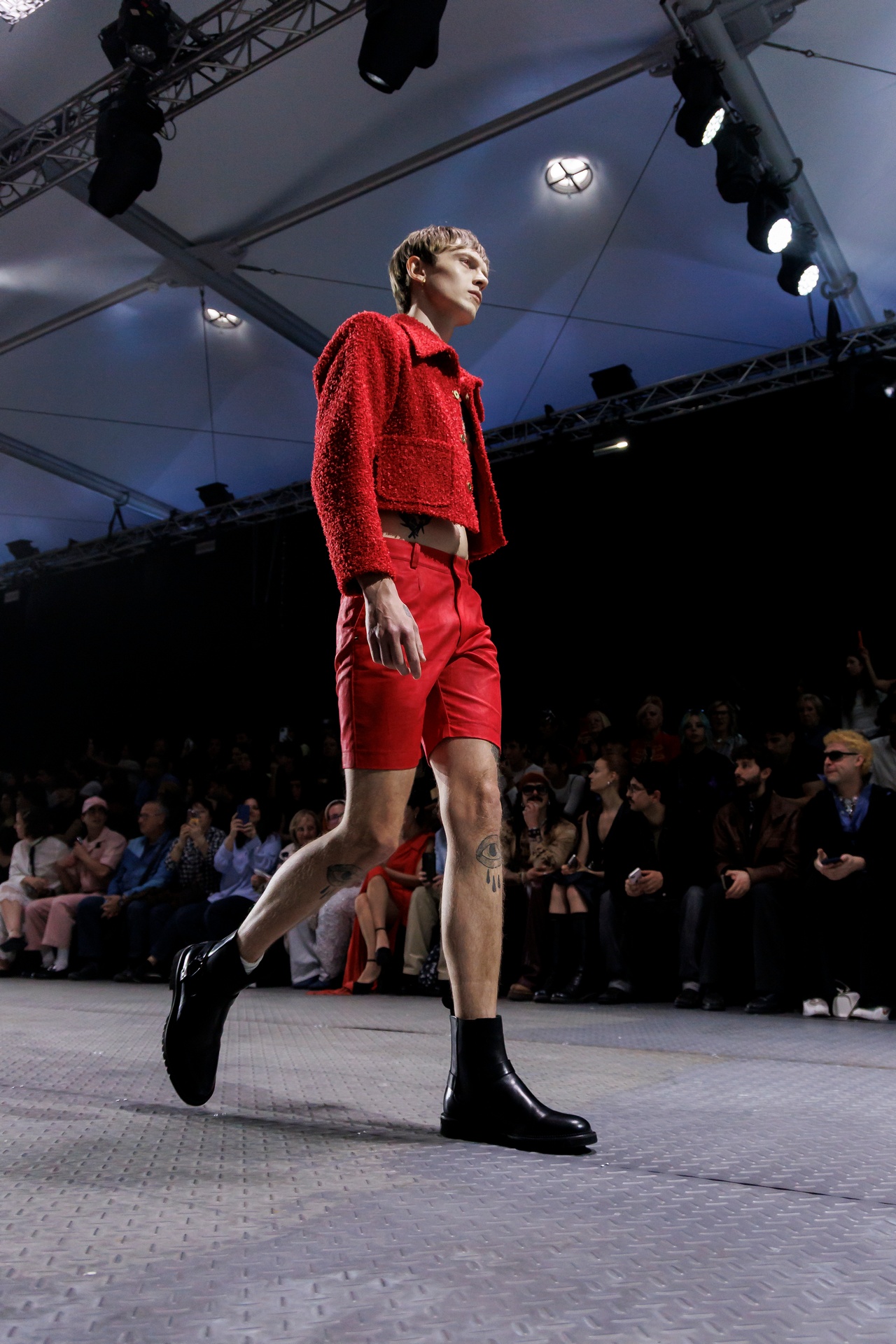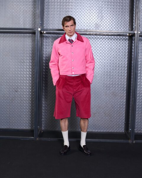Estas referencias se materializan en siluetas versátiles, pensadas tanto para prendas femeninas como masculinas, desdibujando los límites de género. La colección combina sargas plisadas mediante costuras, popelines en vichy y algodones para el día, mientras que chantilly, tules, pieles artificiales con plumas y gasas aportan ligereza y teatralidad nocturna. La paleta gira en torno a rosas y rojos granate, con acentos marrones y azules. Volúmenes marcados en faldas y hombros, lazos constantes, volantes y puntillas equilibran inocencia y sensualidad, construyendo una estética donde vulnerabilidad y poder coexisten.