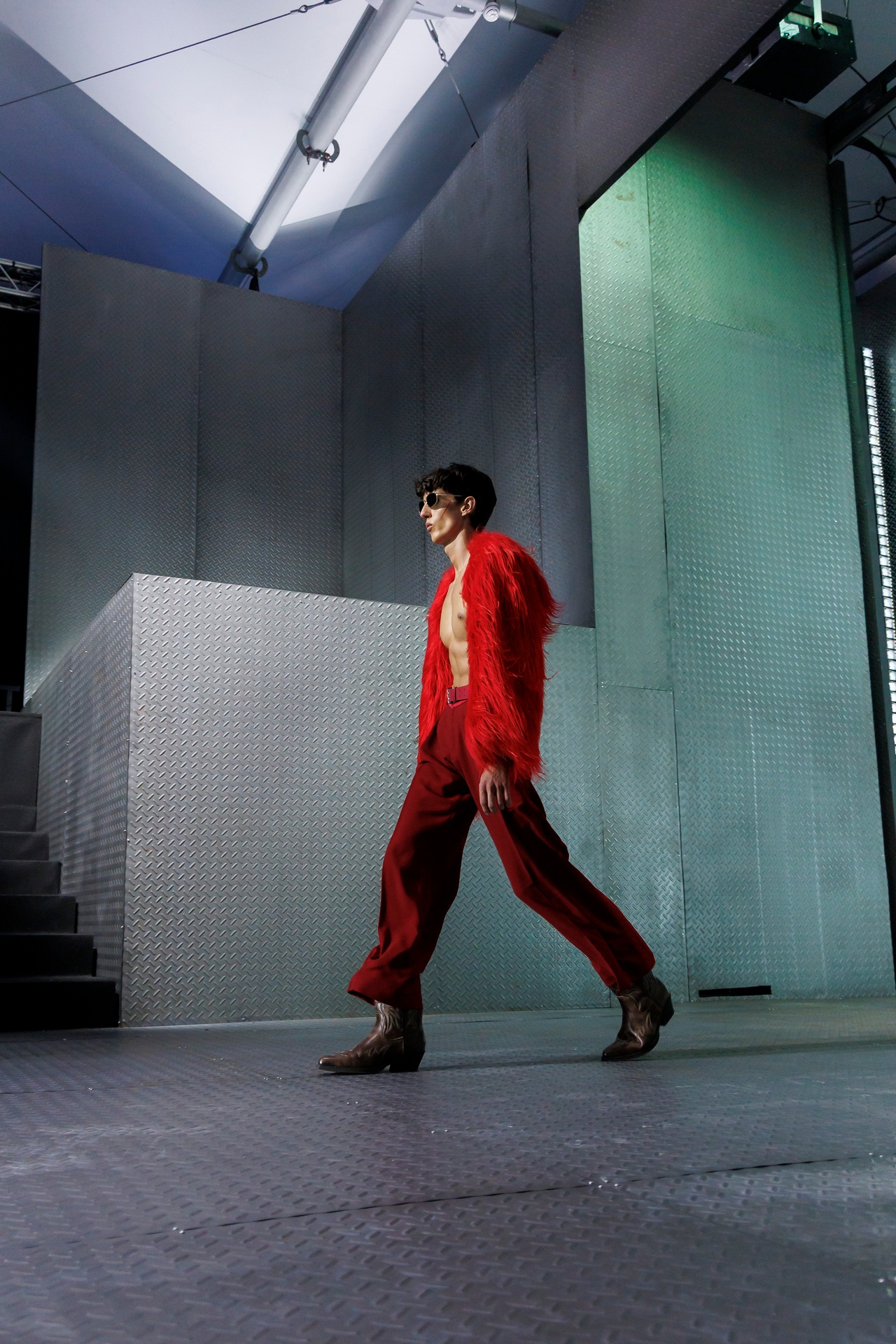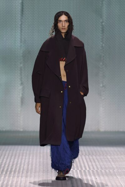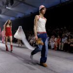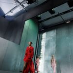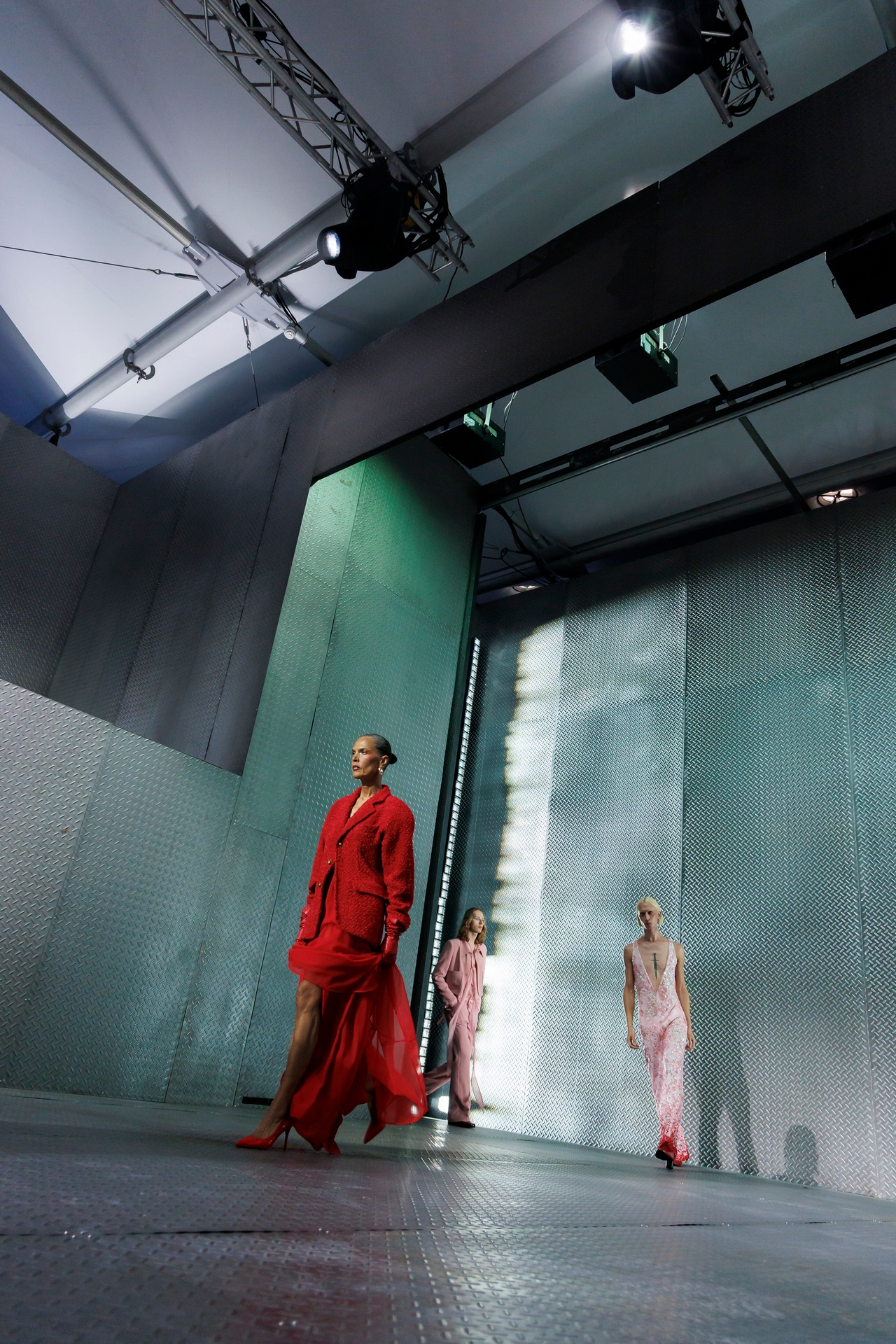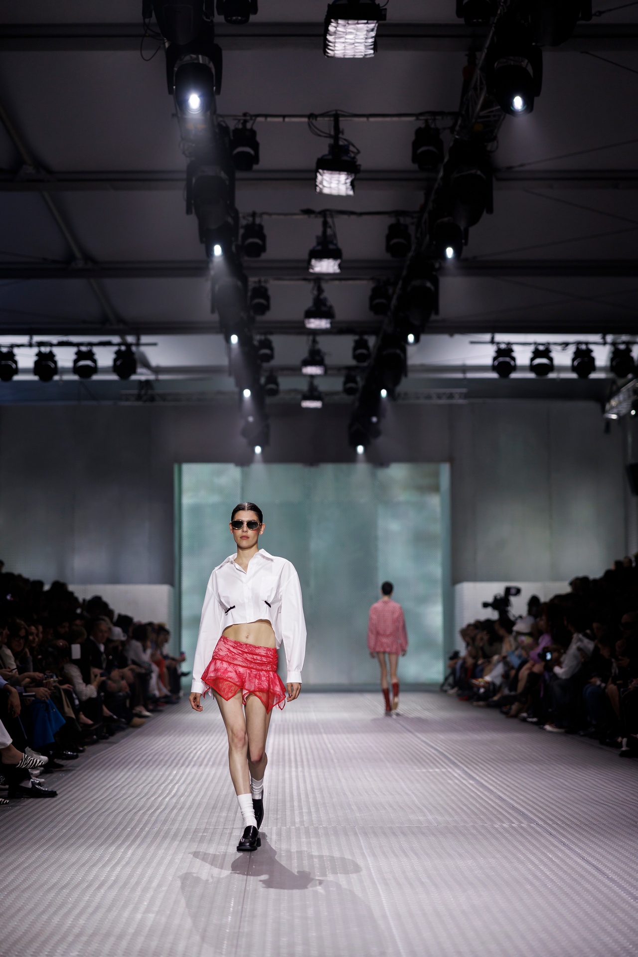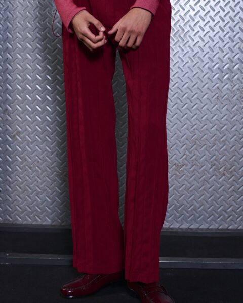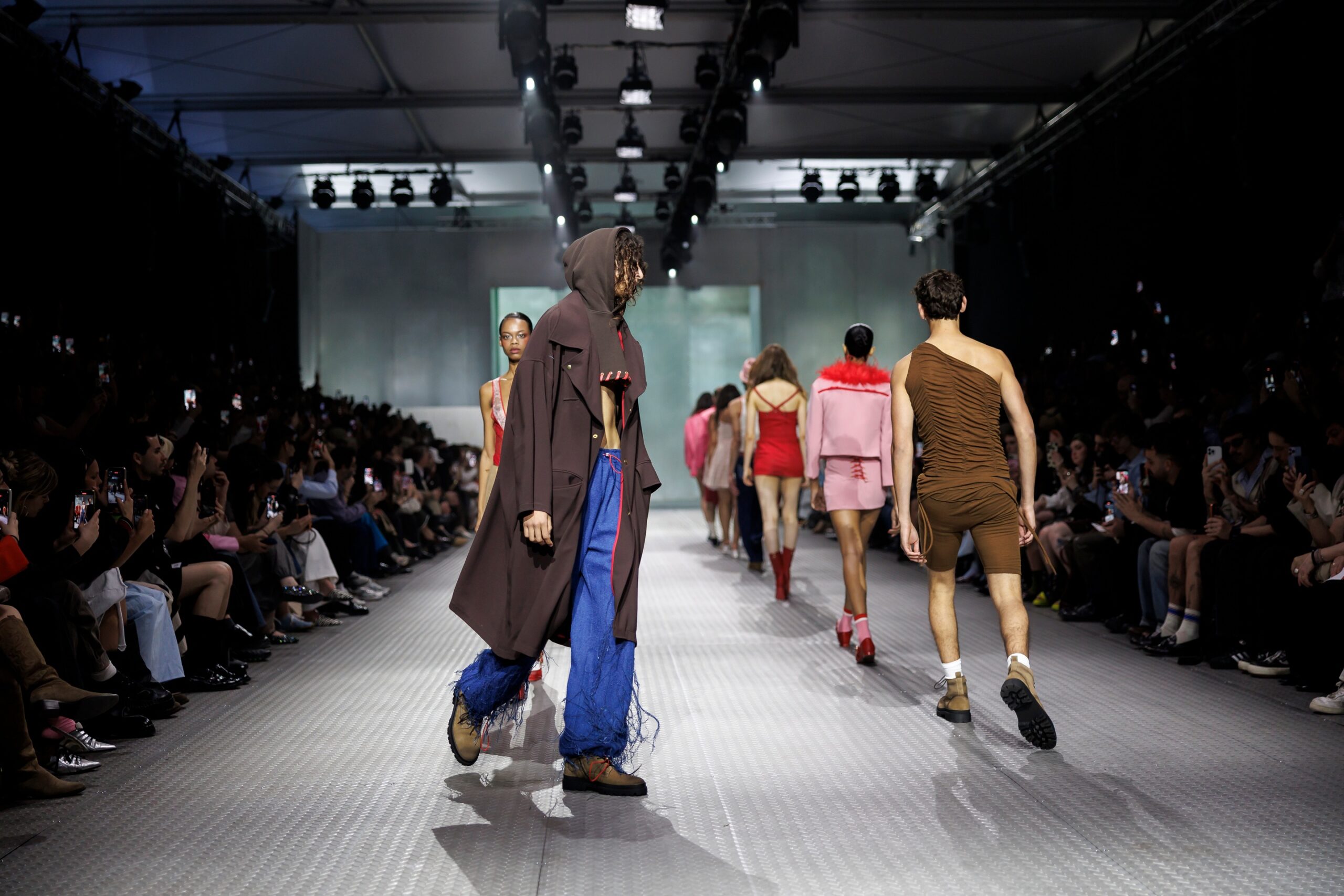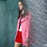 Estas referencias se materializan en siluetas versátiles, pensadas tanto para prendas femeninas como masculinas, desdibujando los límites de género. La colección combina sargas plisadas mediante costuras, popelines en vichy y algodones para el día, mientras que chantilly, tules, pieles artificiales con plumas y gasas aportan ligereza y teatralidad nocturna. La paleta gira en torno a rosas y rojos granate, con acentos marrones y azules. Volúmenes marcados en faldas y hombros, lazos constantes, volantes y puntillas equilibran inocencia y sensualidad, construyendo una estética donde vulnerabilidad y poder coexisten.