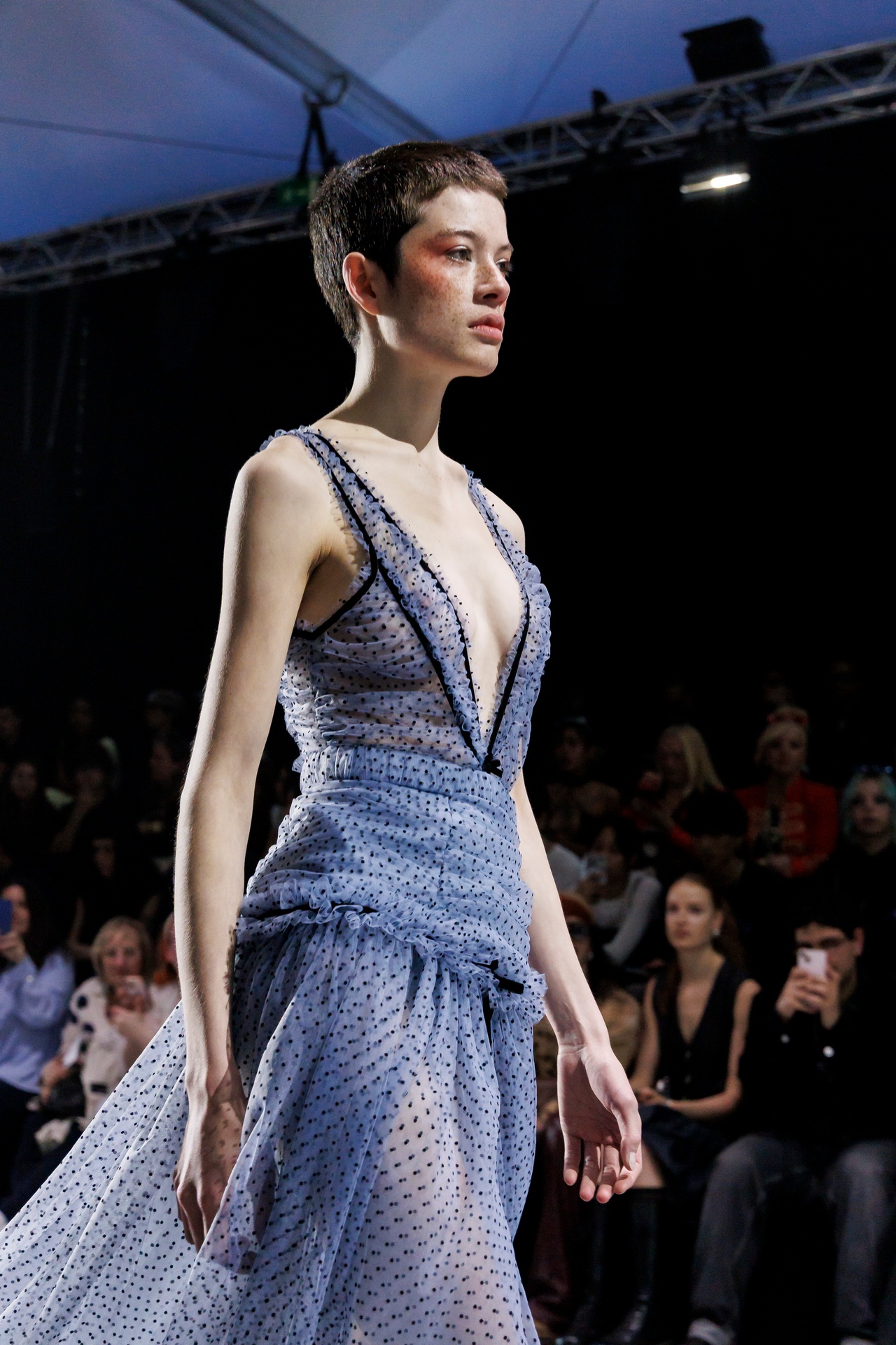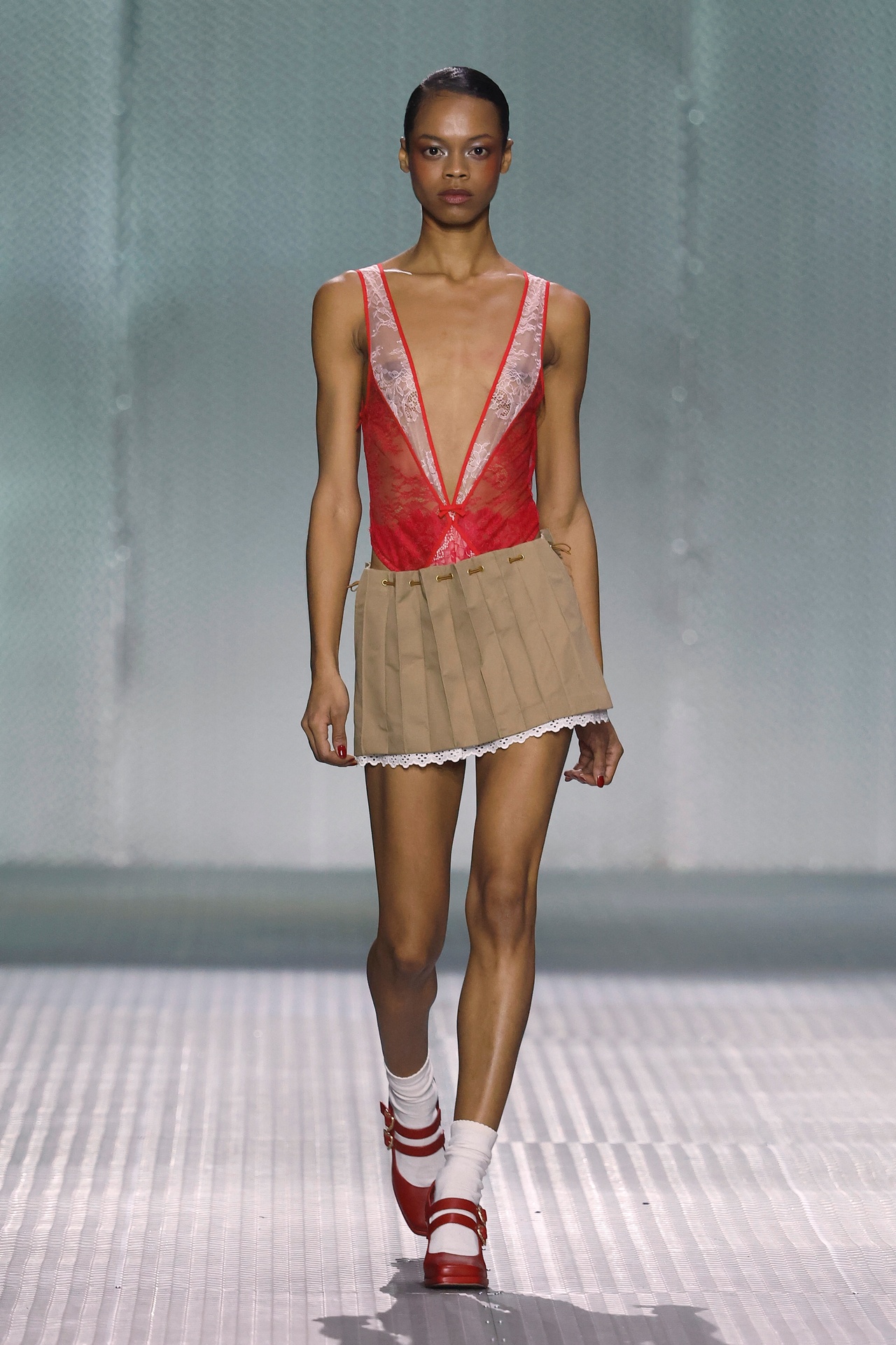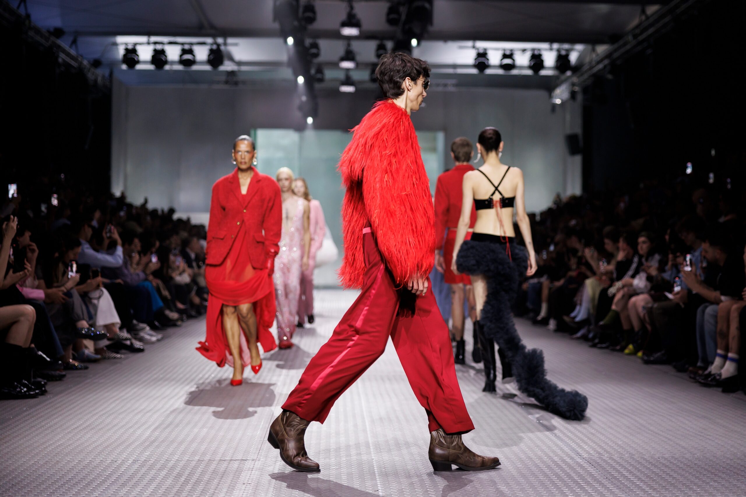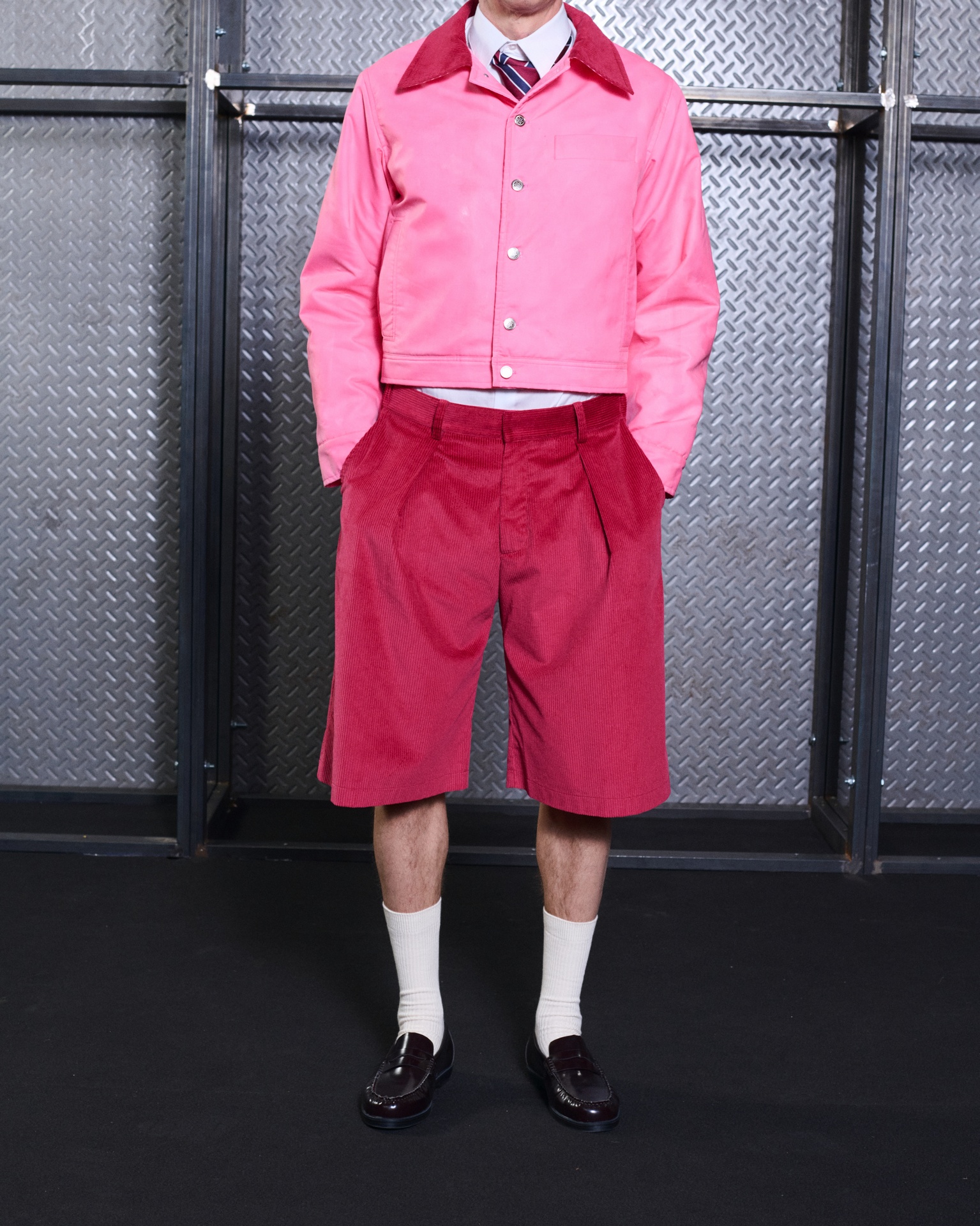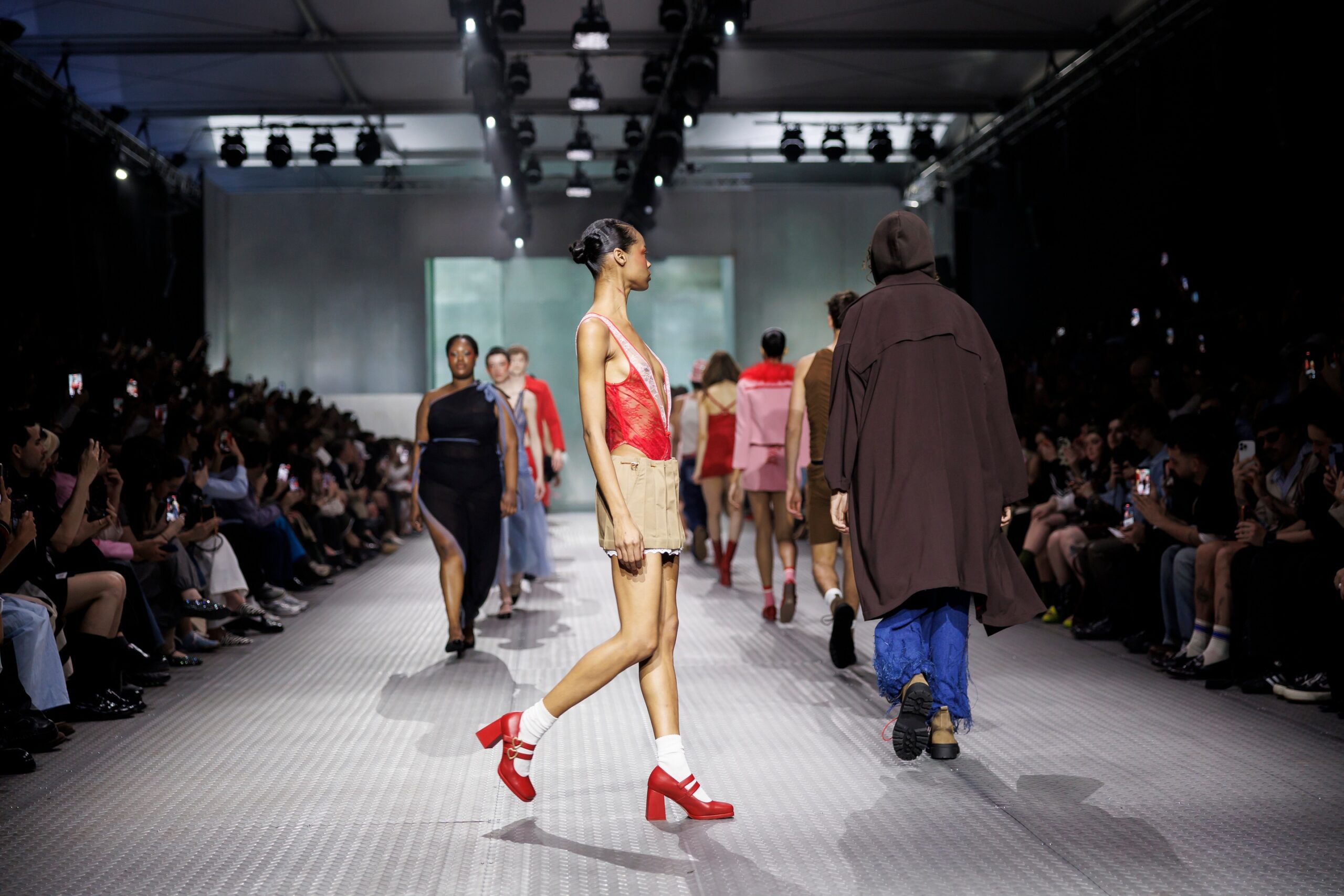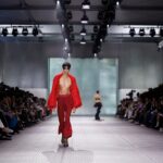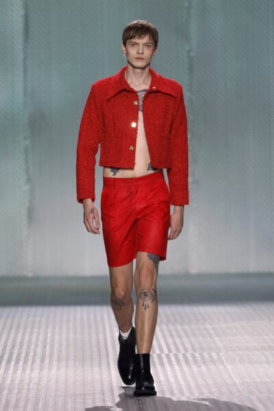 Estas referencias se materializan en siluetas versátiles, pensadas tanto para prendas femeninas como masculinas, desdibujando los límites de género. La colección combina sargas plisadas mediante costuras, popelines en vichy y algodones para el día, mientras que chantilly, tules, pieles artificiales con plumas y gasas aportan ligereza y teatralidad nocturna. La paleta gira en torno a rosas y rojos granate, con acentos marrones y azules. Volúmenes marcados en faldas y hombros, lazos constantes, volantes y puntillas equilibran inocencia y sensualidad, construyendo una estética donde vulnerabilidad y poder coexisten.