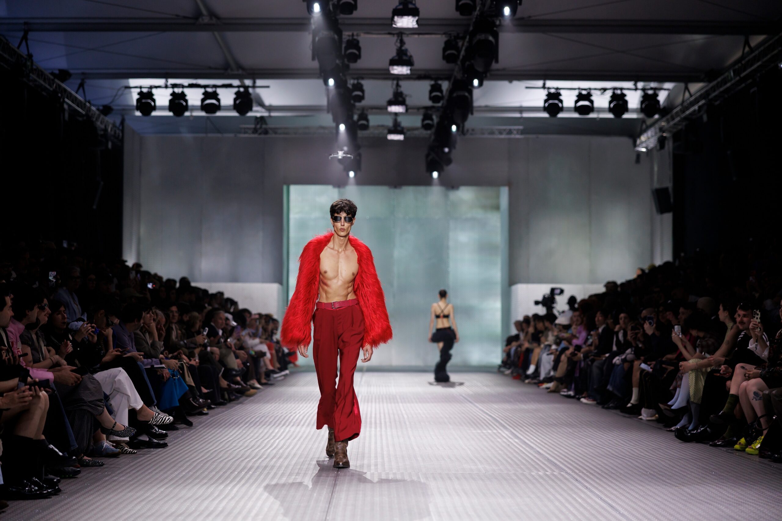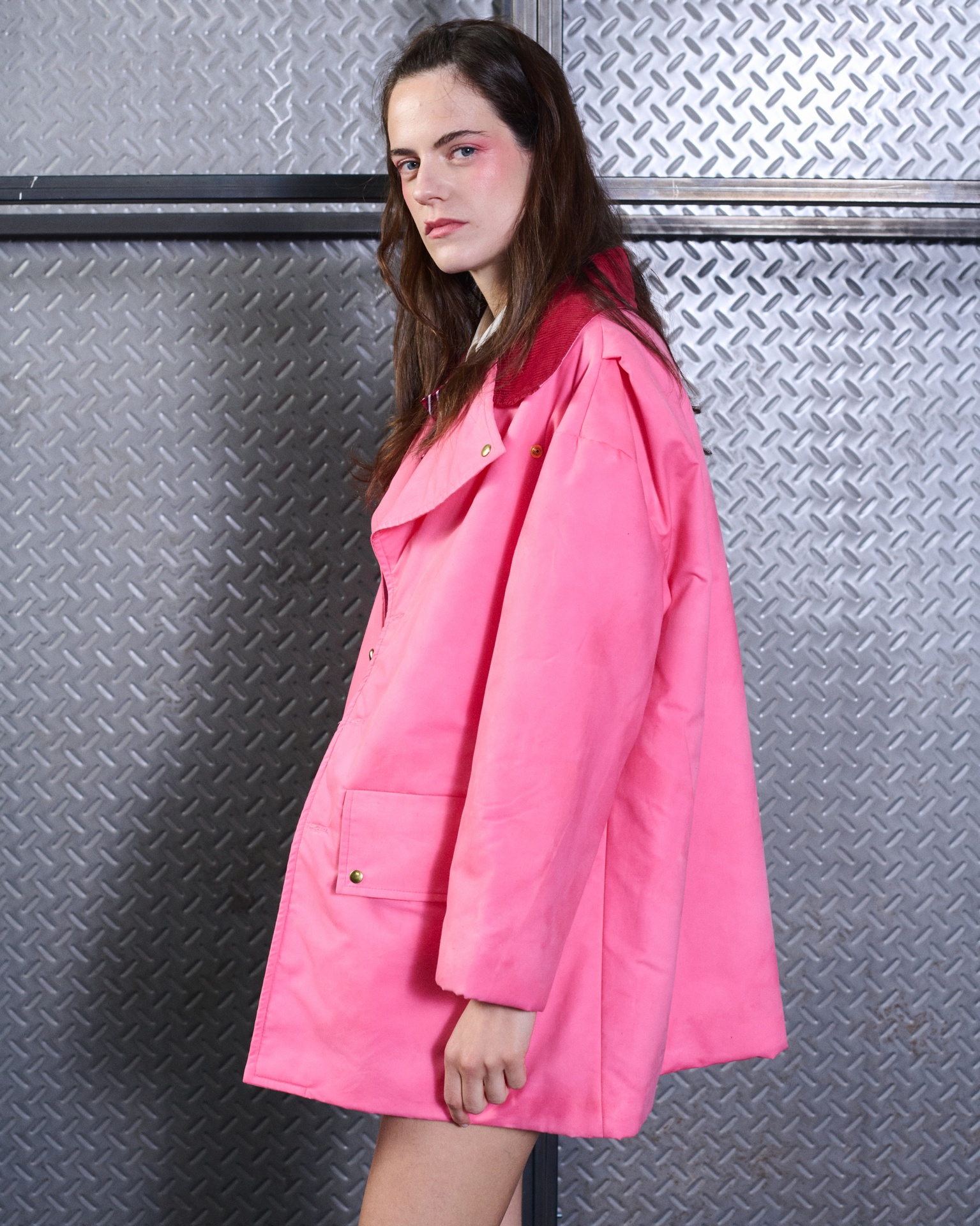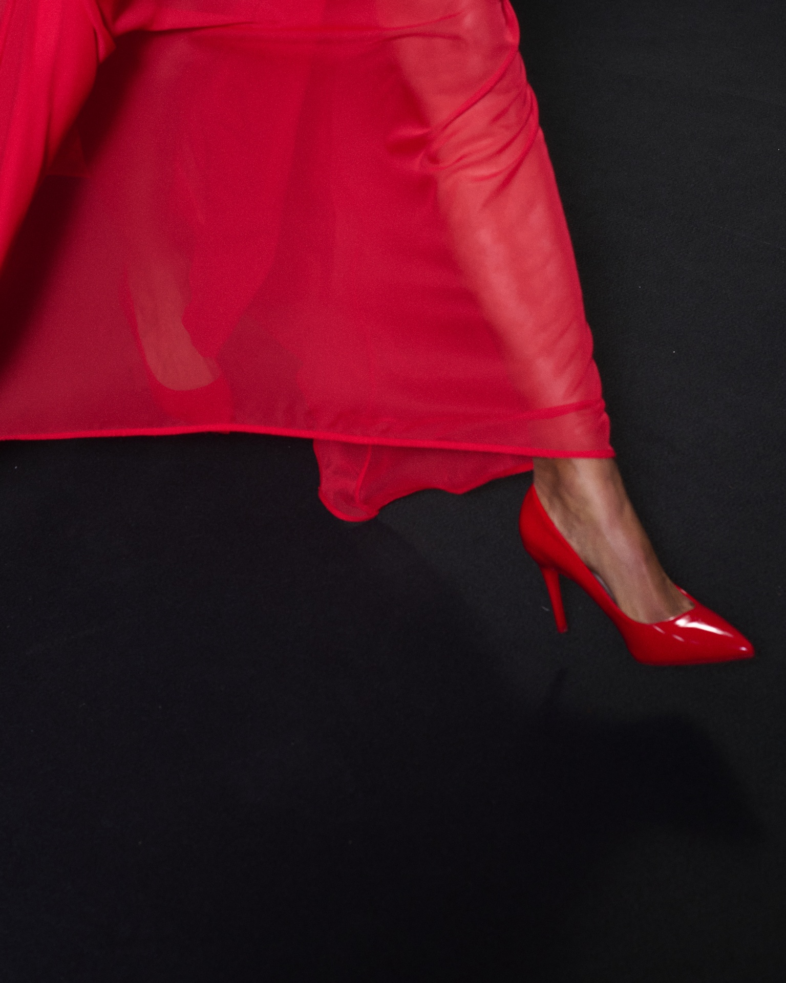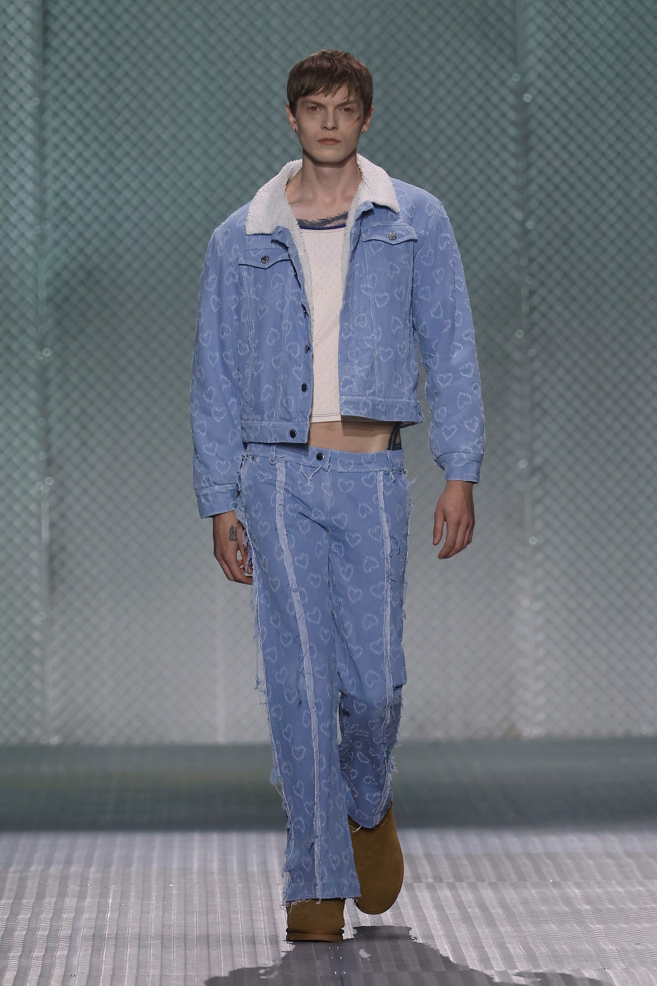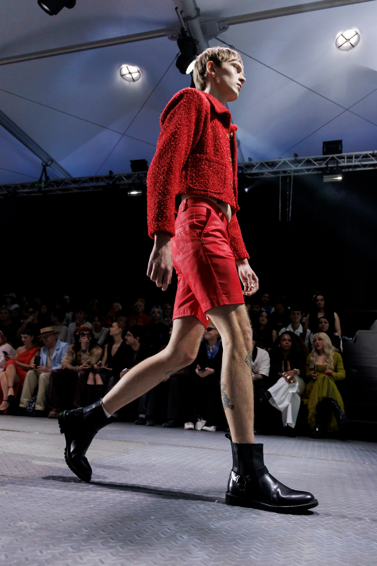 Estas referencias se materializan en siluetas versátiles, pensadas tanto para prendas femeninas como masculinas, desdibujando los límites de género. La colección combina sargas plisadas mediante costuras, popelines en vichy y algodones para el día, mientras que chantilly, tules, pieles artificiales con plumas y gasas aportan ligereza y teatralidad nocturna. La paleta gira en torno a rosas y rojos granate, con acentos marrones y azules. Volúmenes marcados en faldas y hombros, lazos constantes, volantes y puntillas equilibran inocencia y sensualidad, construyendo una estética donde vulnerabilidad y poder coexisten.