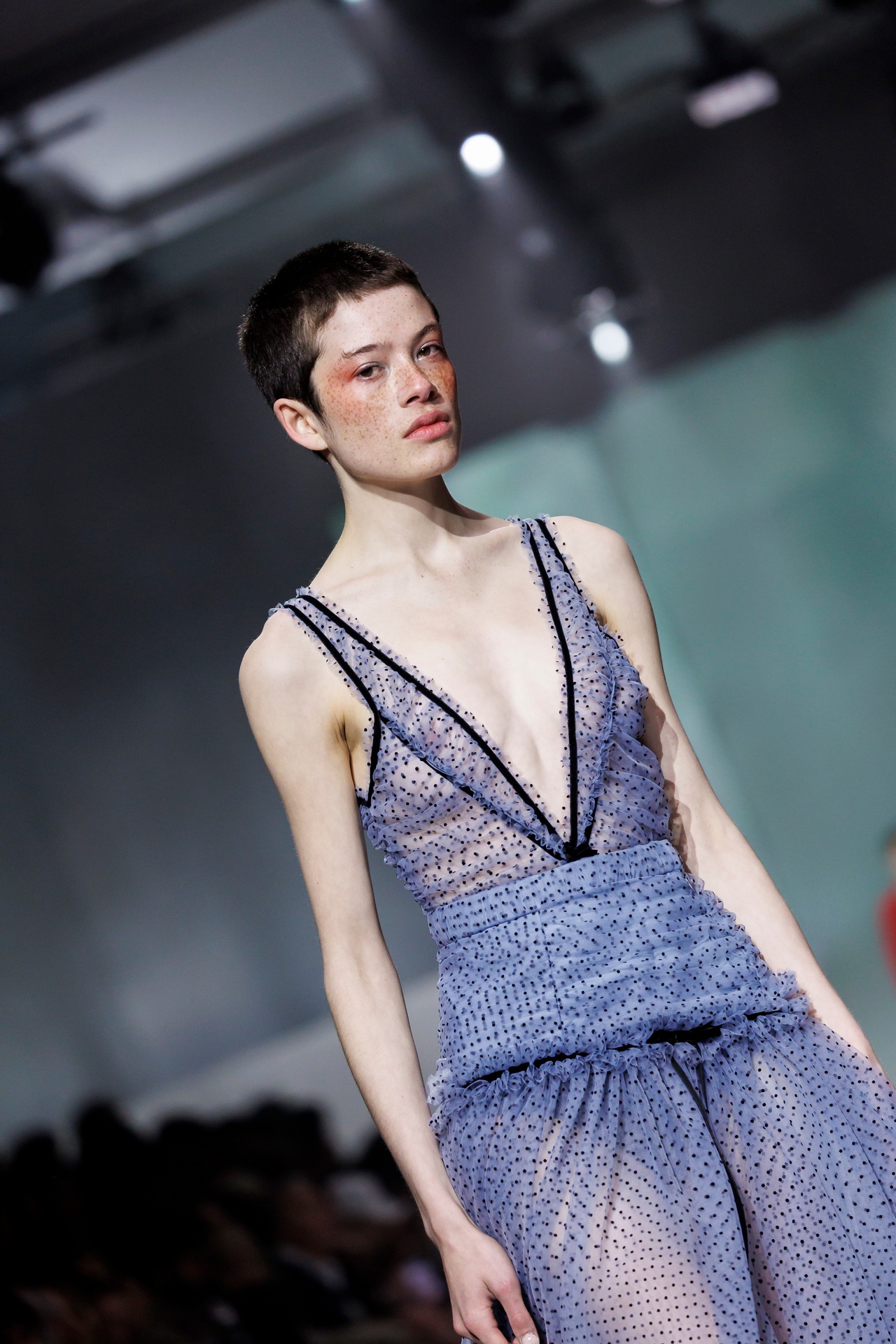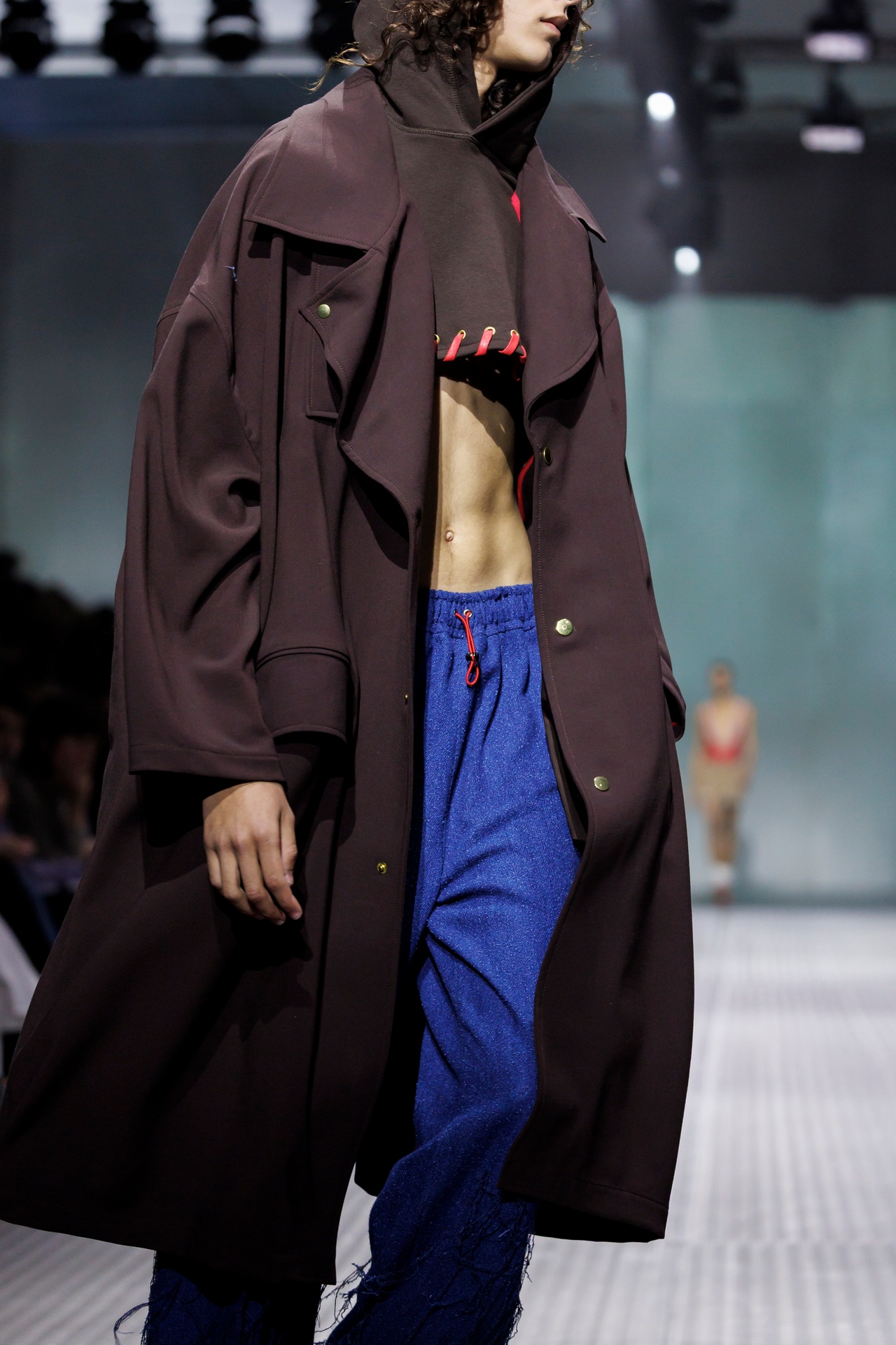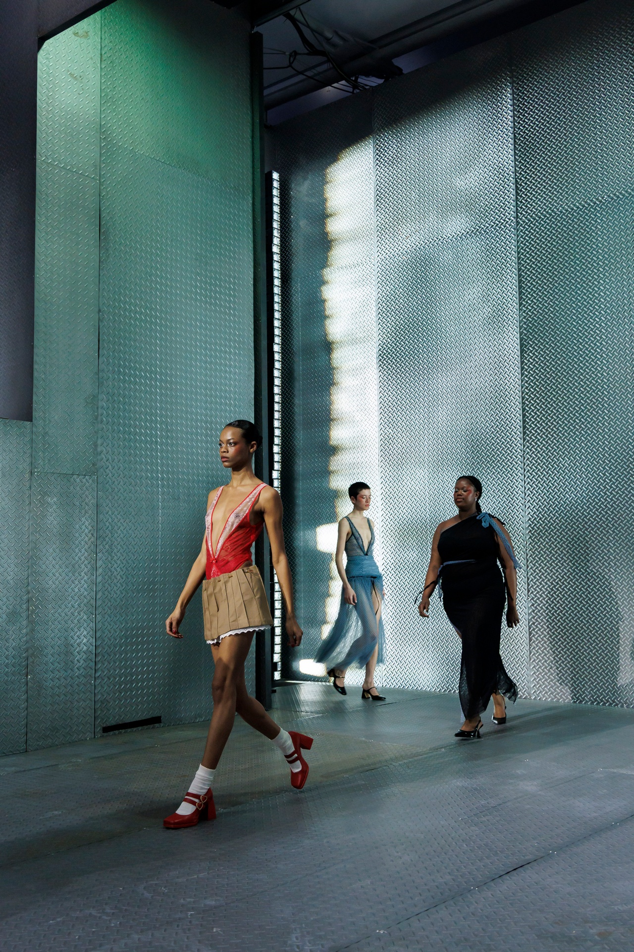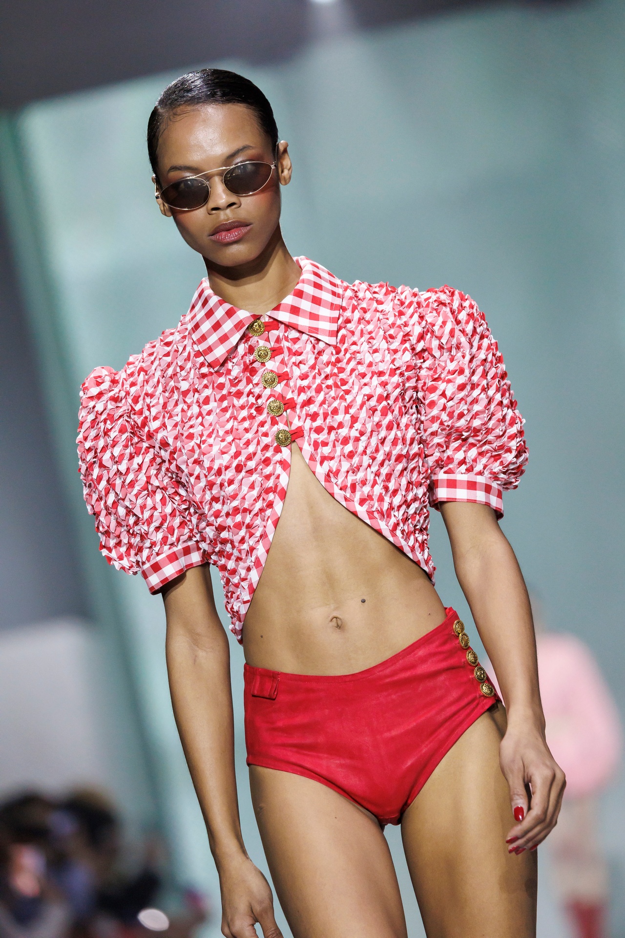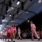 Estas referencias se materializan en siluetas versátiles, pensadas tanto para prendas femeninas como masculinas, desdibujando los límites de género. La colección combina sargas plisadas mediante costuras, popelines en vichy y algodones para el día, mientras que chantilly, tules, pieles artificiales con plumas y gasas aportan ligereza y teatralidad nocturna. La paleta gira en torno a rosas y rojos granate, con acentos marrones y azules. Volúmenes marcados en faldas y hombros, lazos constantes, volantes y puntillas equilibran inocencia y sensualidad, construyendo una estética donde vulnerabilidad y poder coexisten.