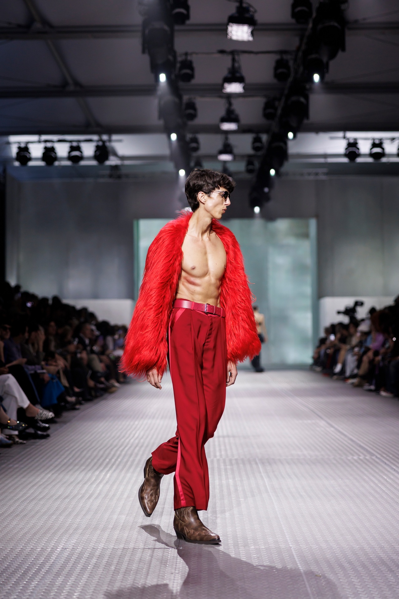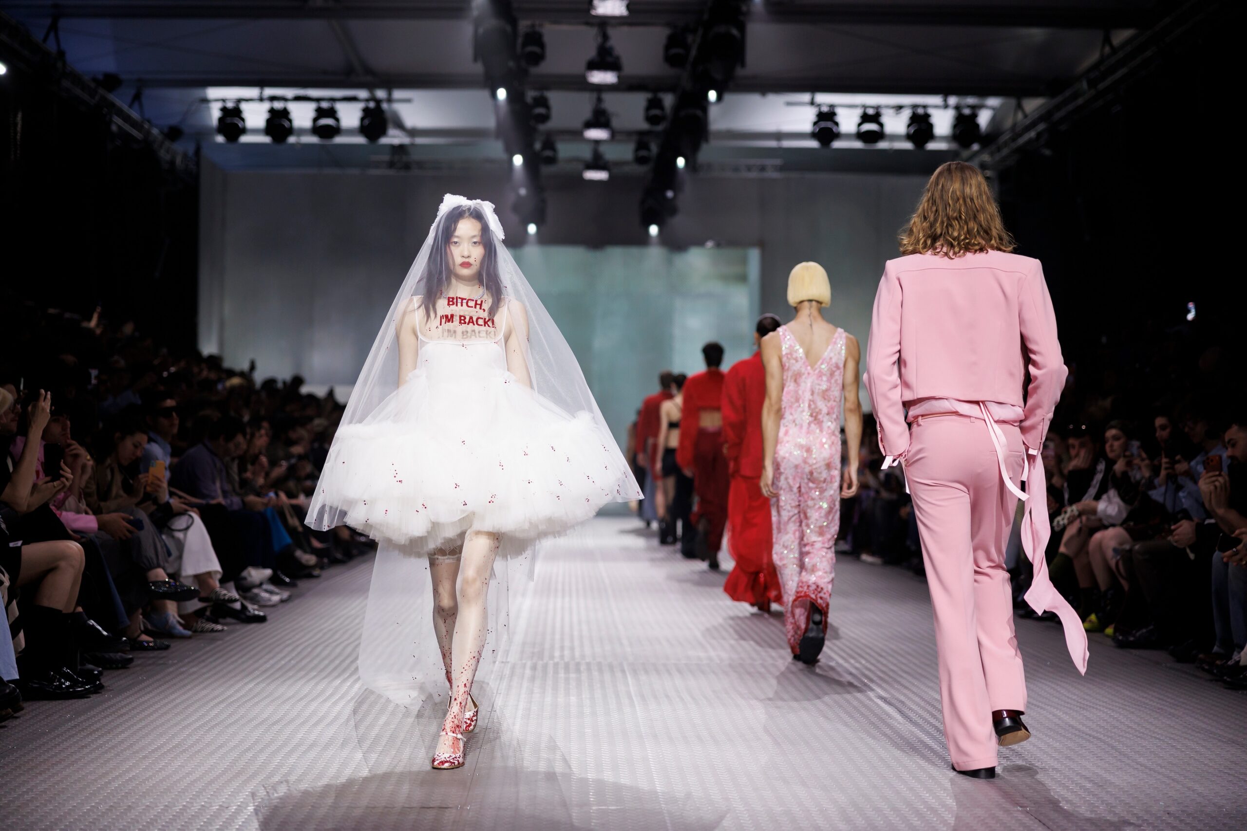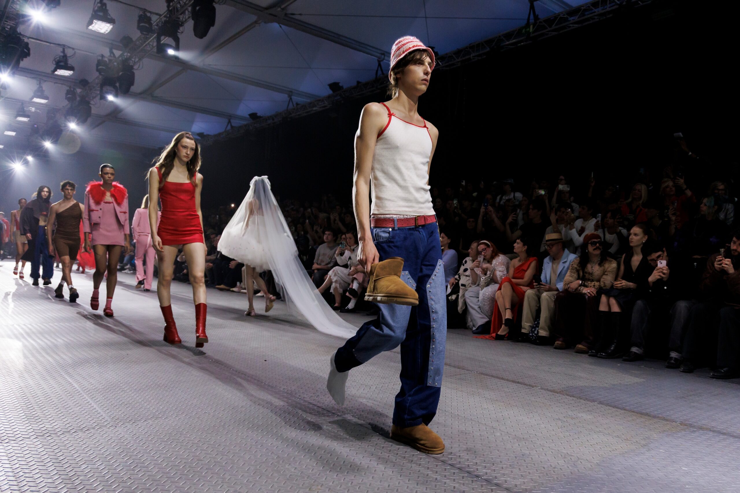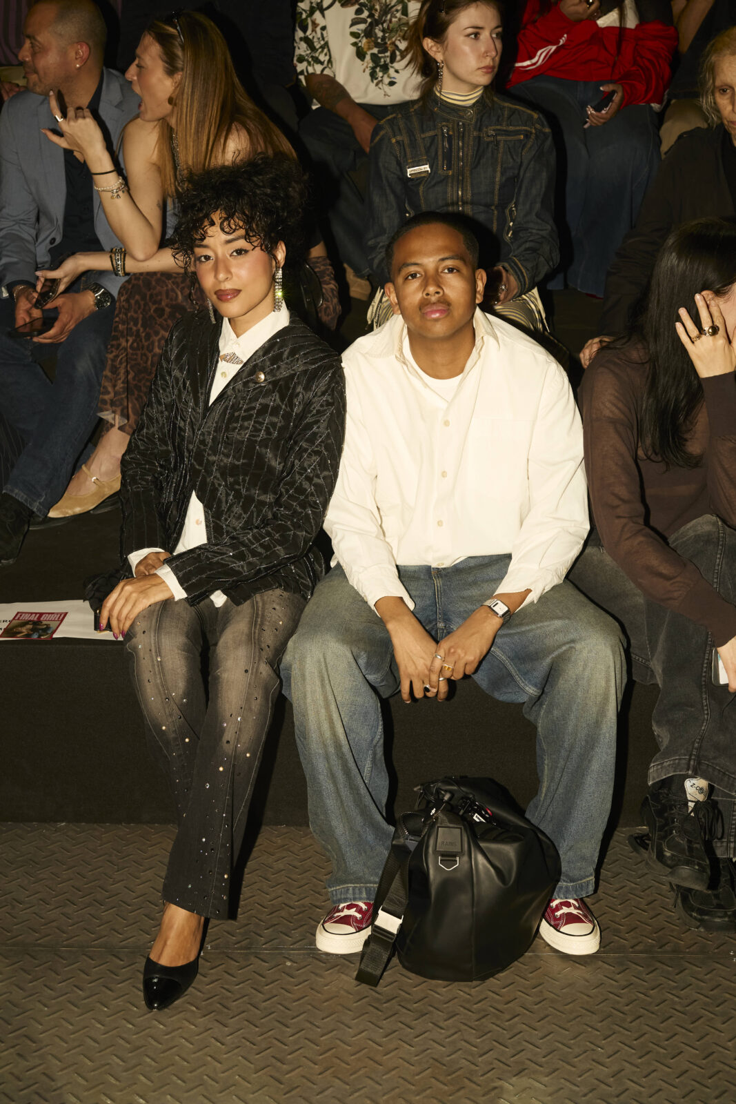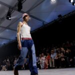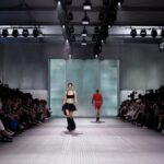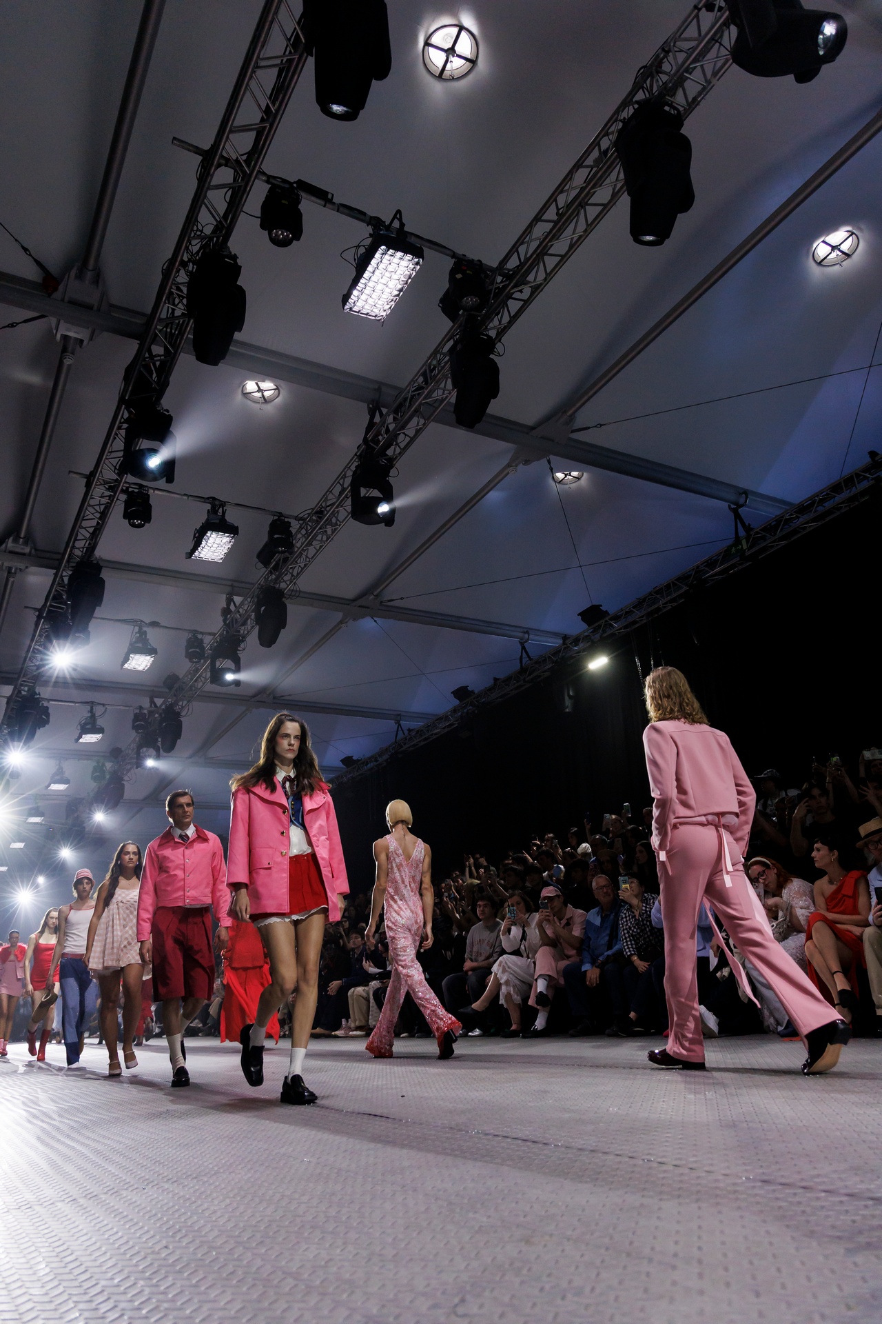Estas referencias se materializan en siluetas versátiles, pensadas tanto para prendas femeninas como masculinas, desdibujando los límites de género. La colección combina sargas plisadas mediante costuras, popelines en vichy y algodones para el día, mientras que chantilly, tules, pieles artificiales con plumas y gasas aportan ligereza y teatralidad nocturna. La paleta gira en torno a rosas y rojos granate, con acentos marrones y azules. Volúmenes marcados en faldas y hombros, lazos constantes, volantes y puntillas equilibran inocencia y sensualidad, construyendo una estética donde vulnerabilidad y poder coexisten.